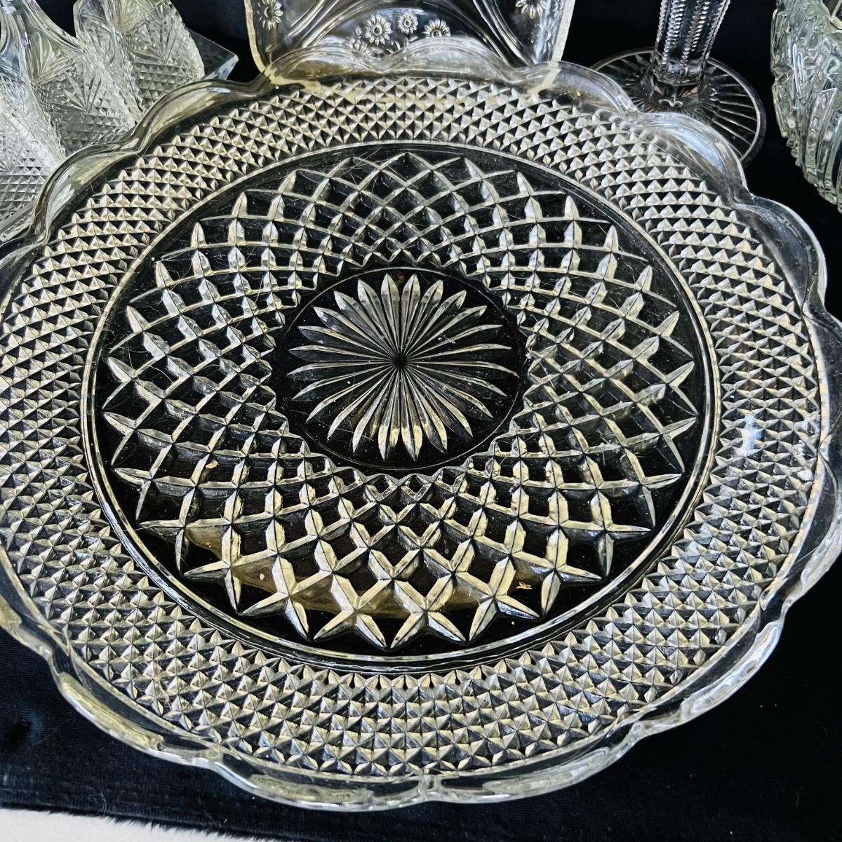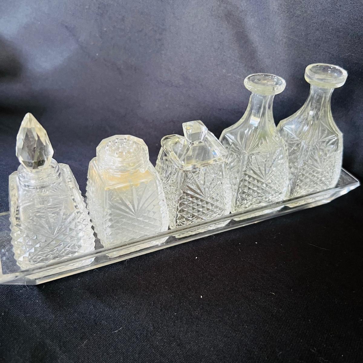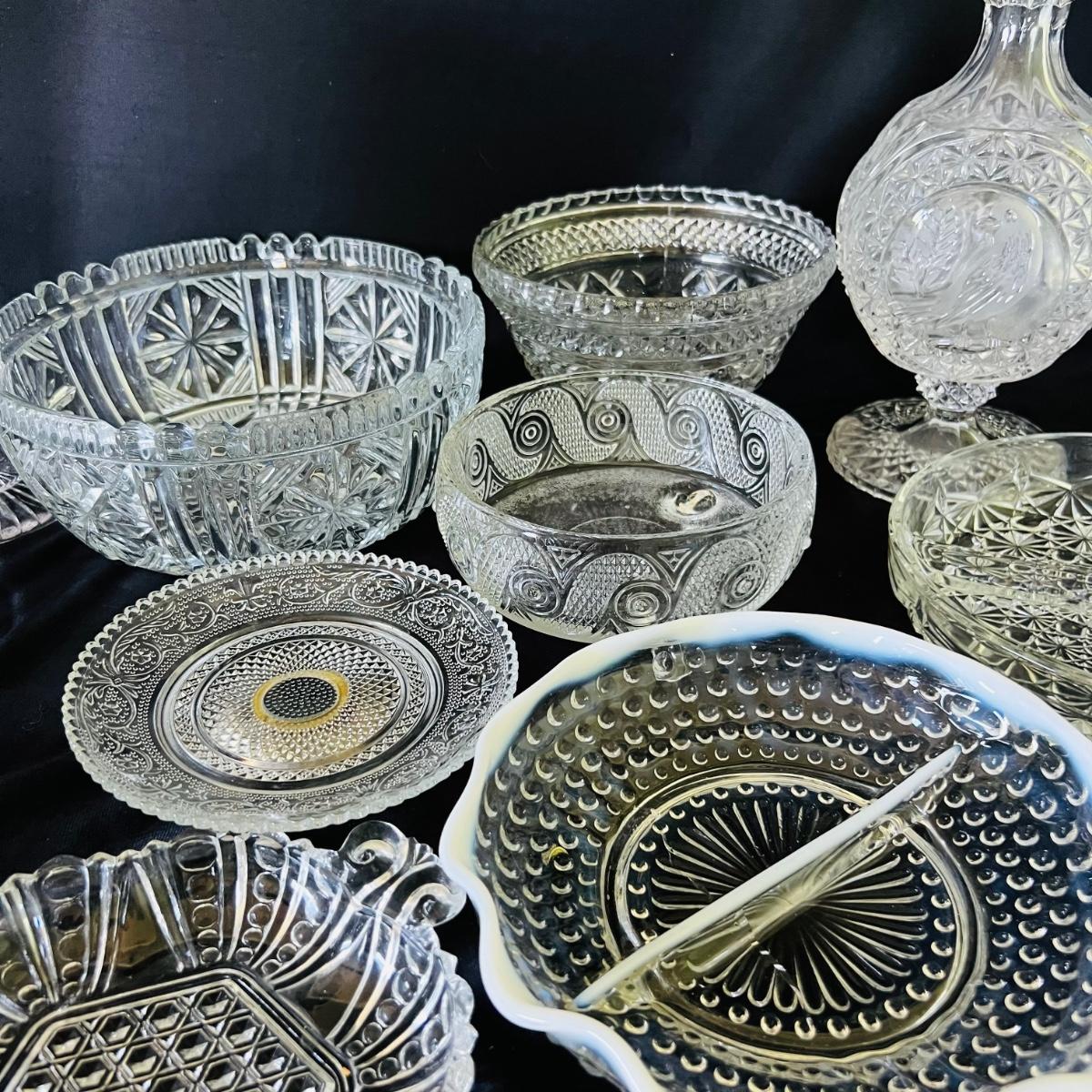 Any table will sparkle with this collection of beautiful glass/crystal pieces. Included in lot is a five piece miniature salt/pepper and oil/vinegar set measuring 10”long as displayed. Also included is a 13”platter, a decanter that measures 13”H, two vases, and a variety of eight glass candy dishes.