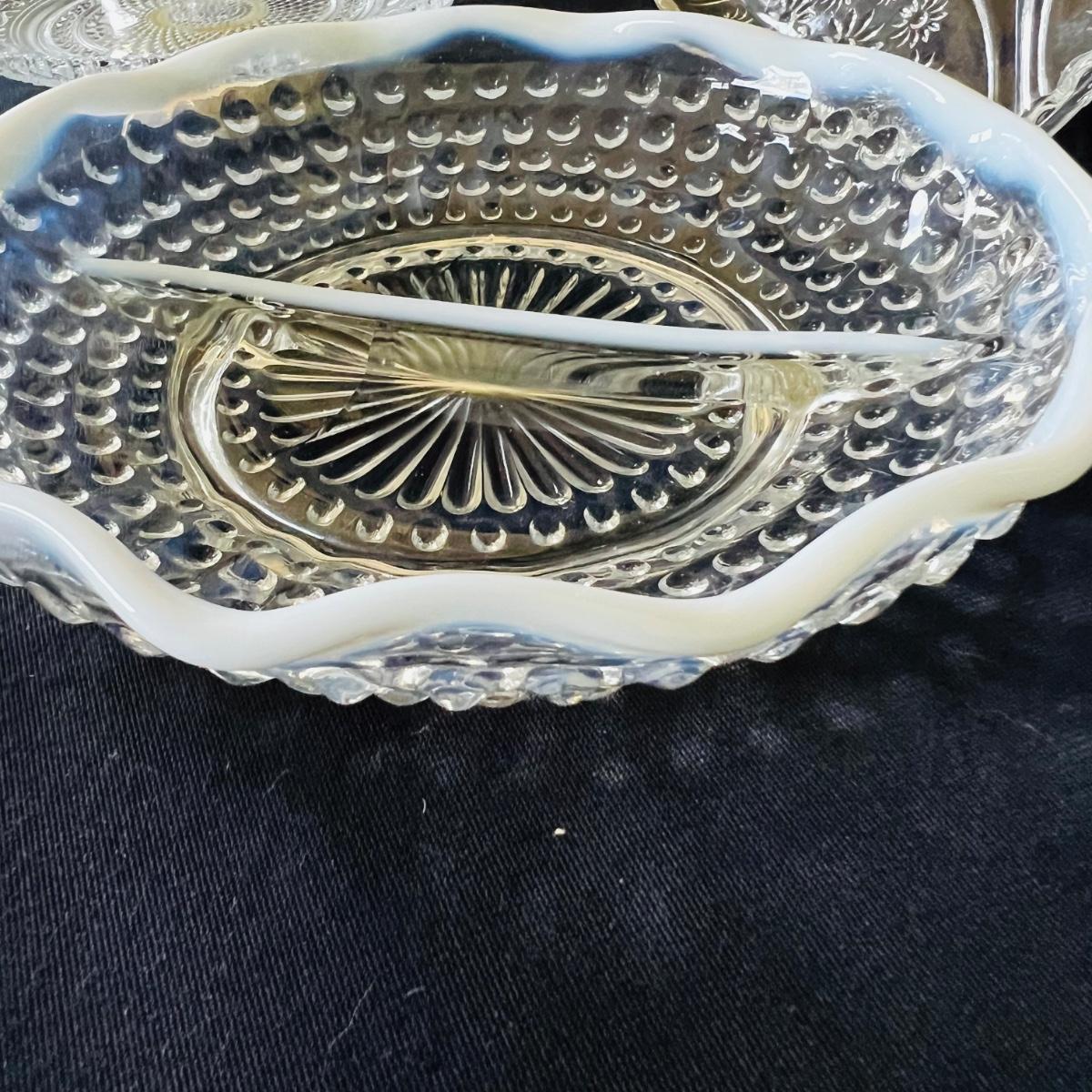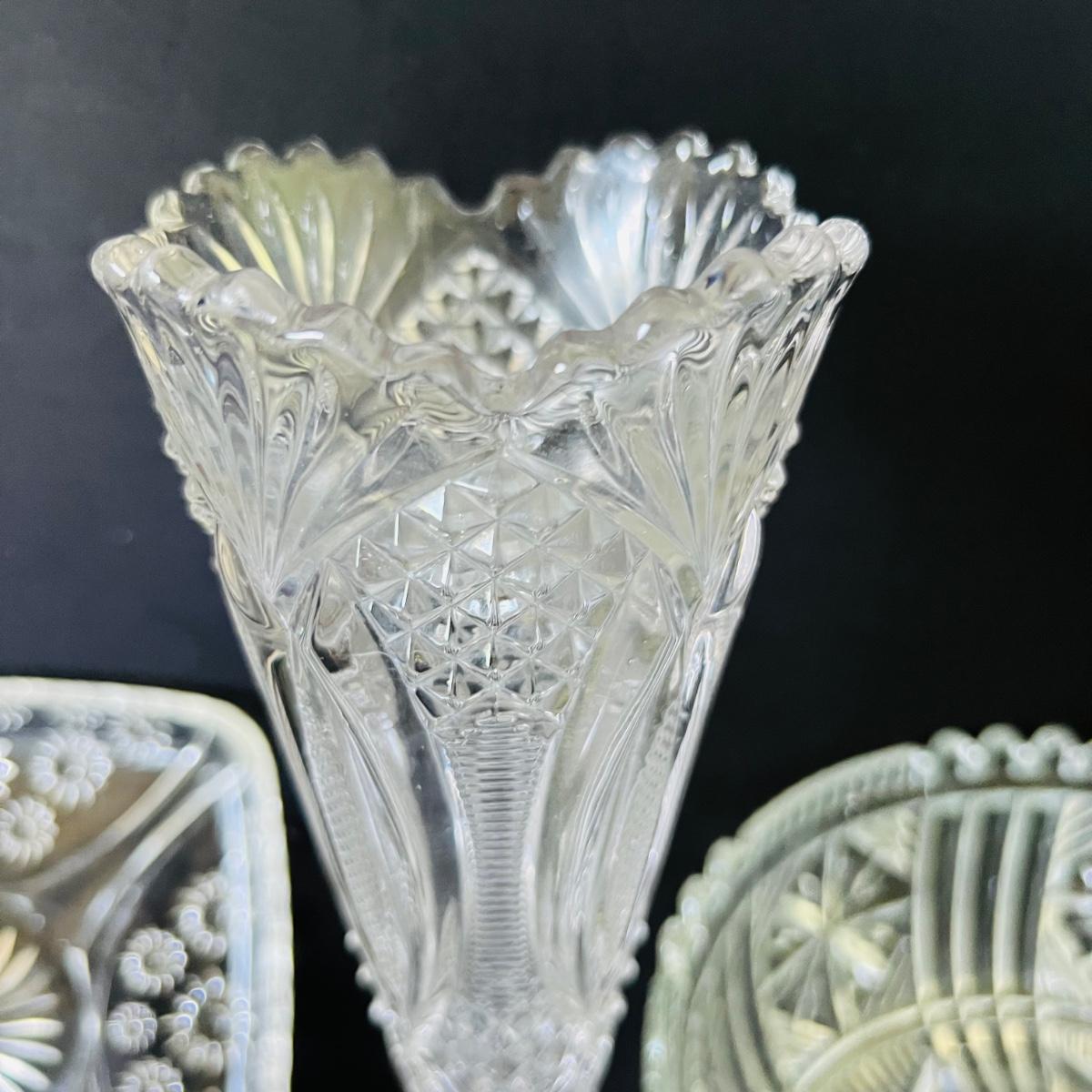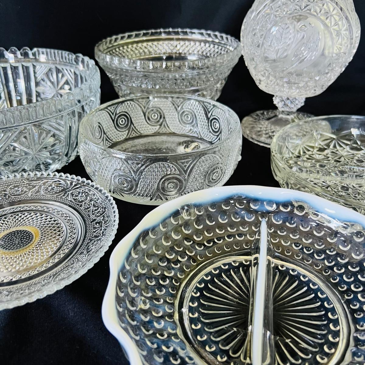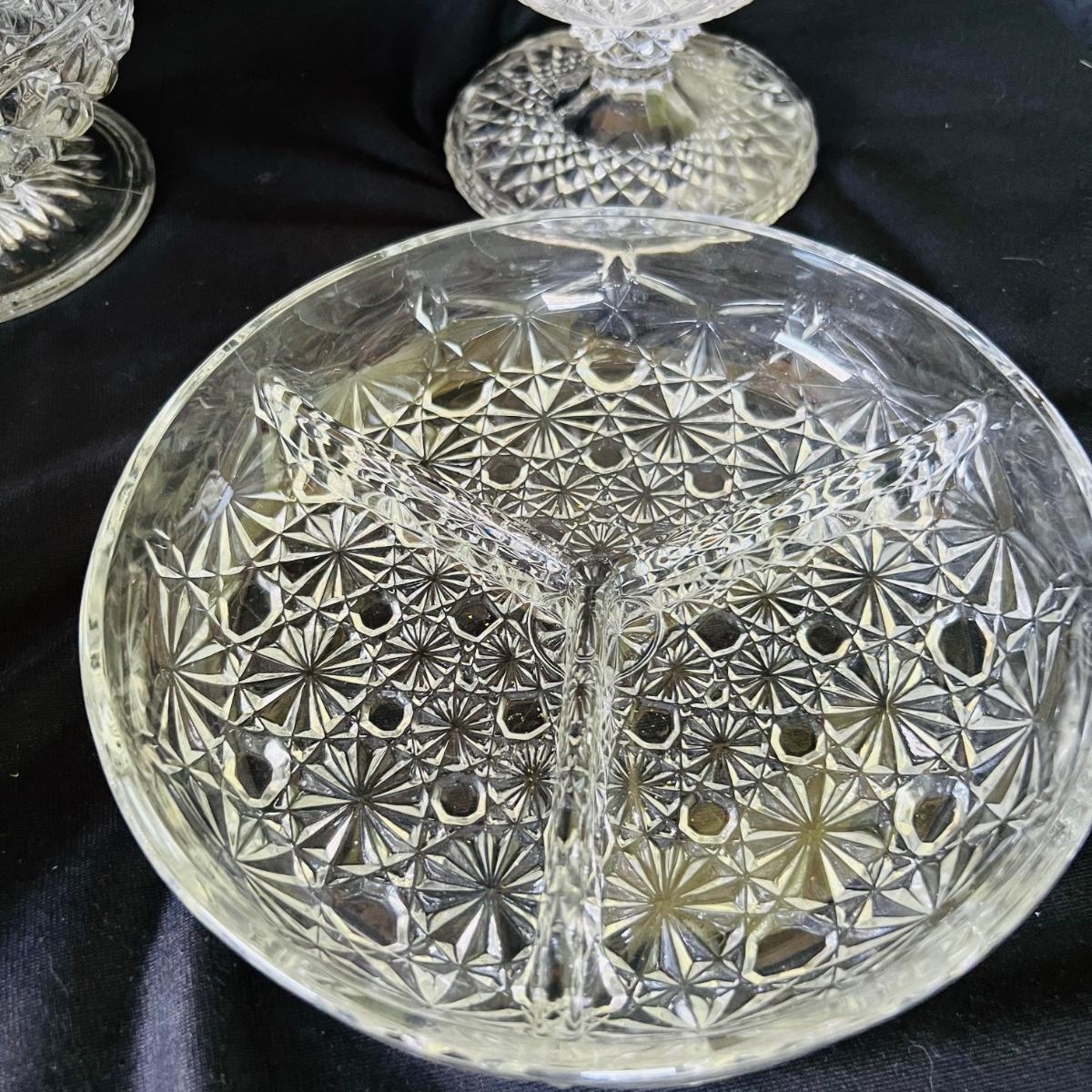 Any table will sparkle with this collection of beautiful glass/crystal pieces. Included in lot is a five piece miniature salt/pepper and oil/vinegar set measuring 10”long as displayed. Also included is a 13”platter, a decanter that measures 13”H, two vases, and a variety of eight glass candy dishes.