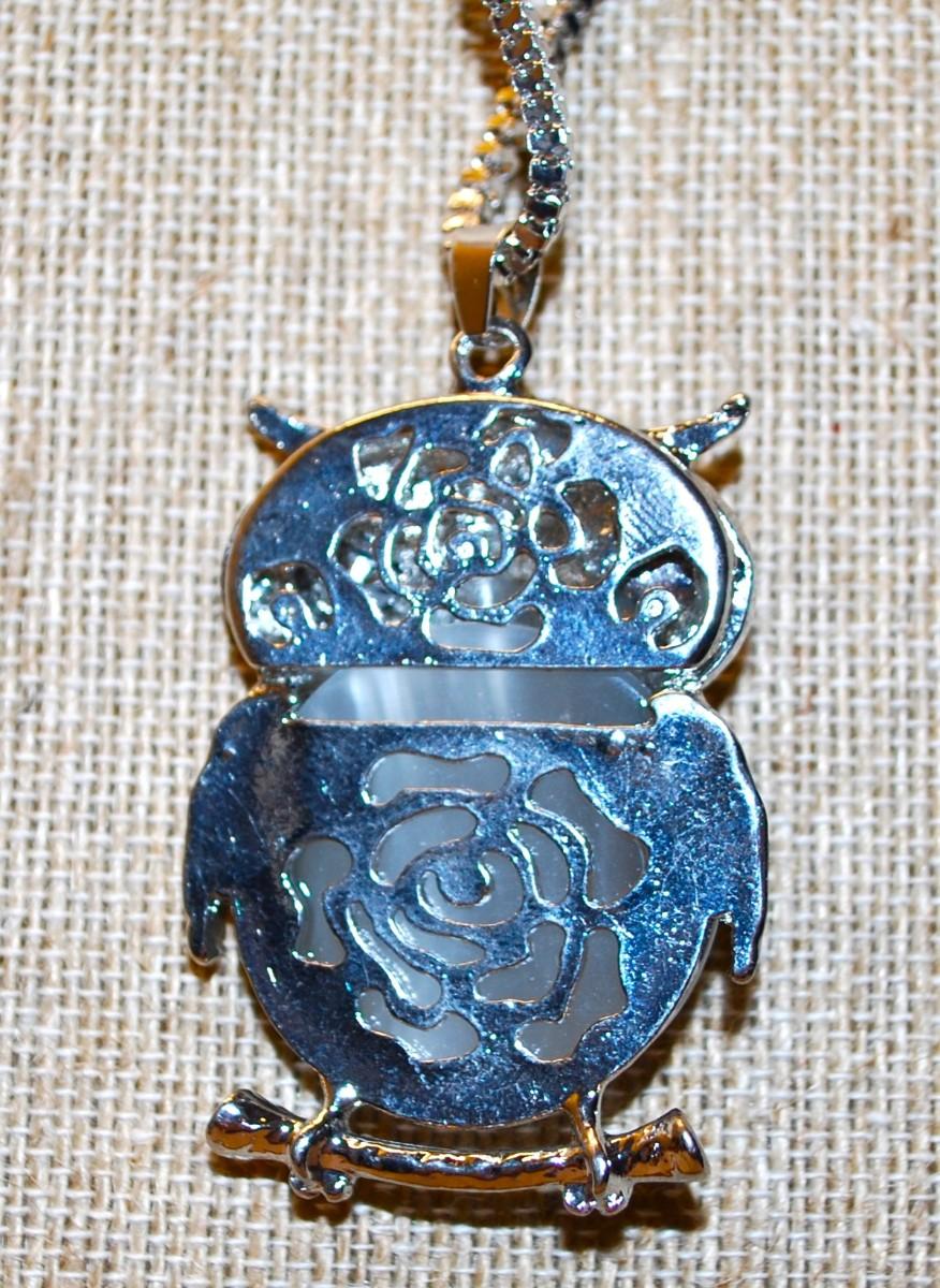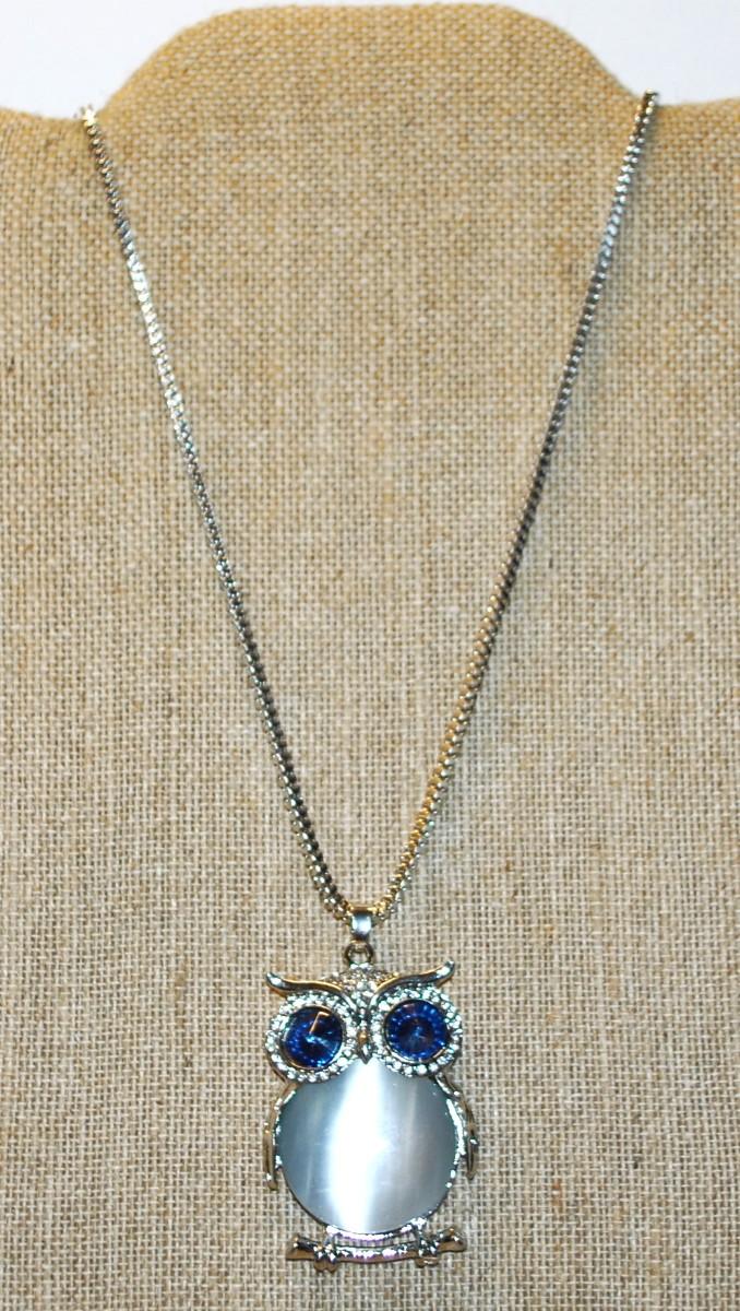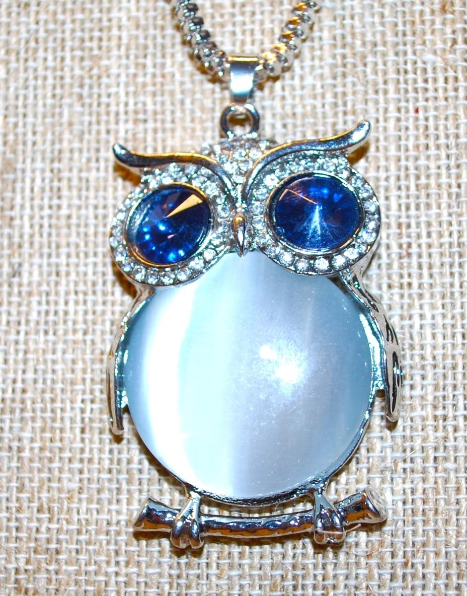 Beautiful Dark Blue Eyed Owl .925 PENDANT (2¼" x 1¼") with Opaque Big Belly and Clear Stone Accents on a Rope Style Necklace Chain 24" L
