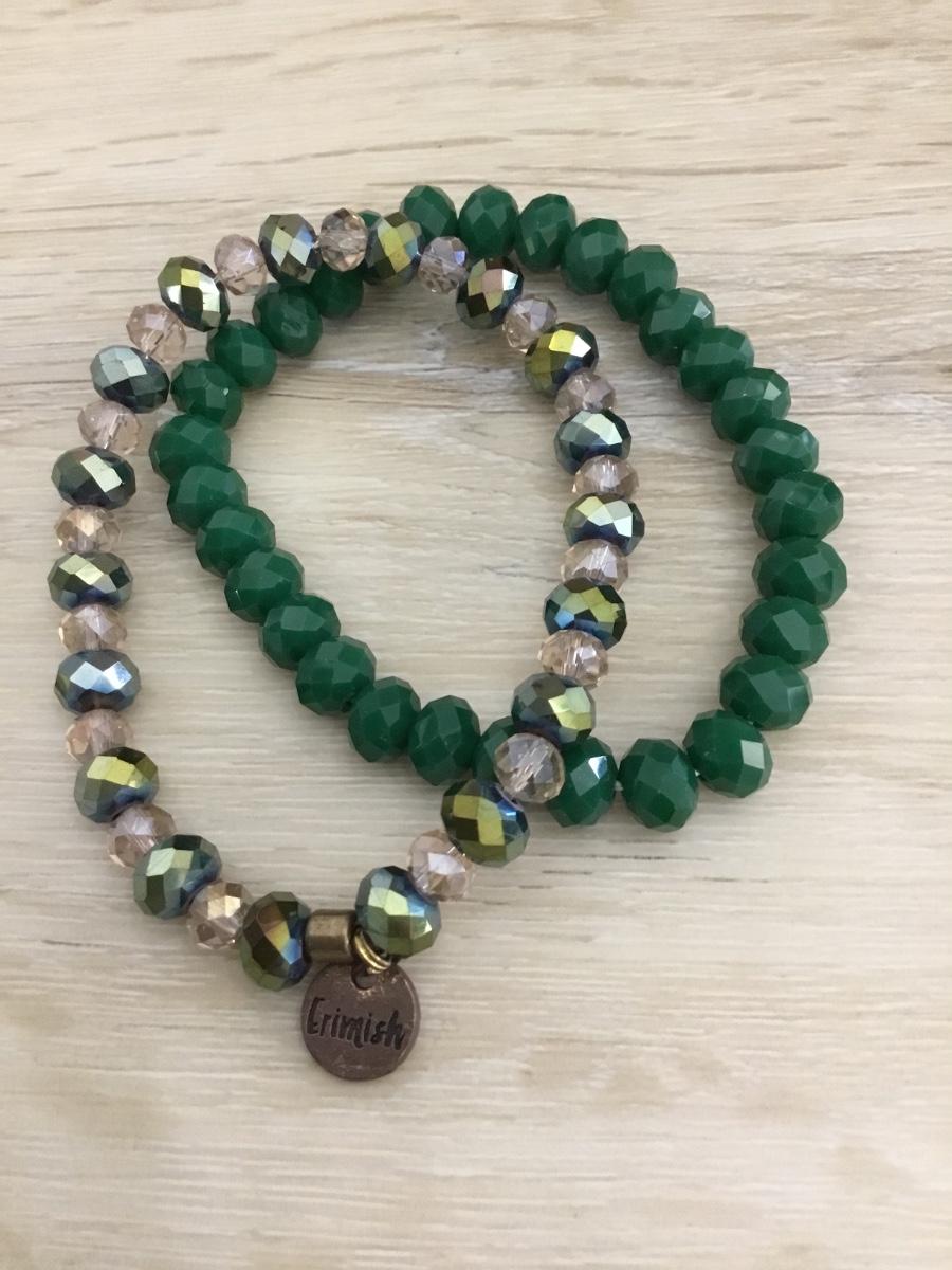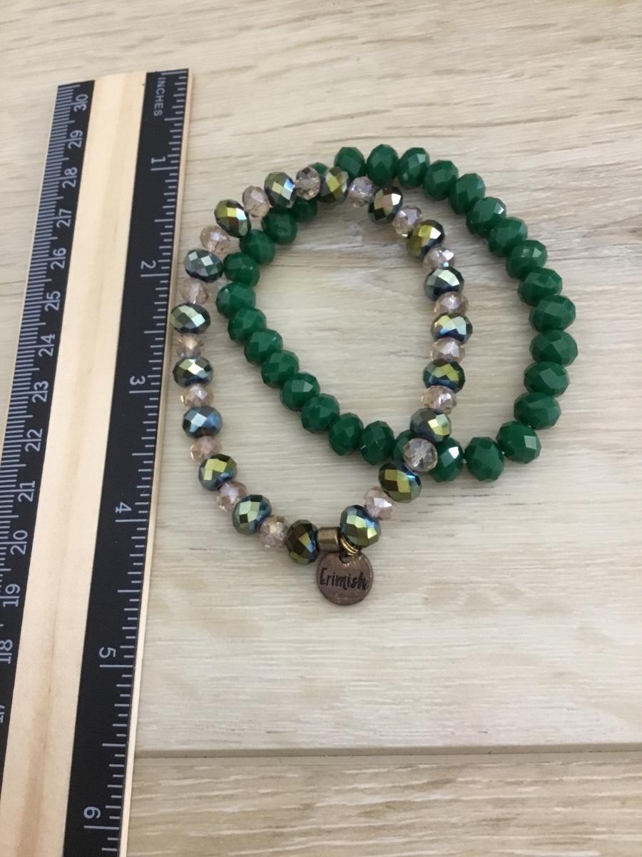 Beautiful, dark forest, green light green, and champagne colored glass stretch bracelets
