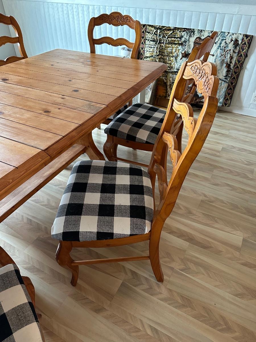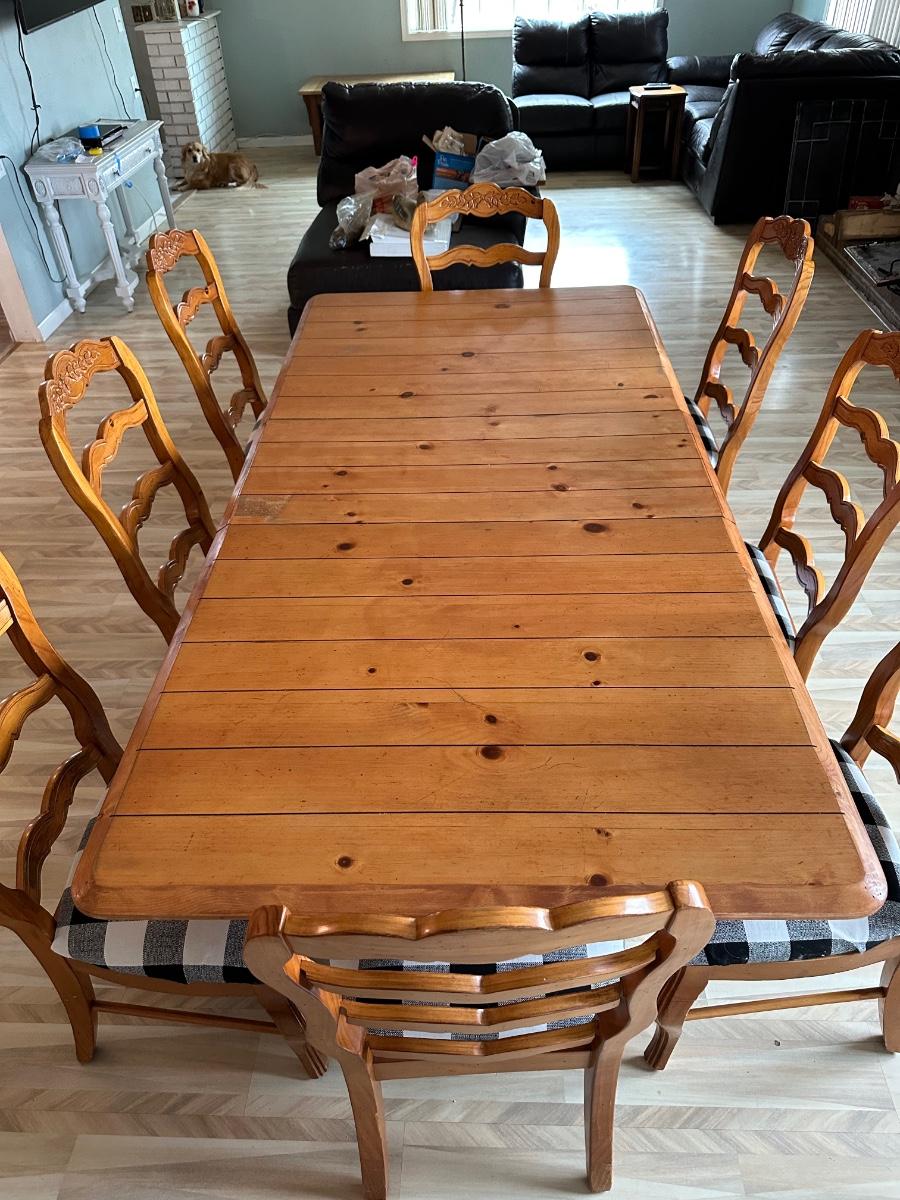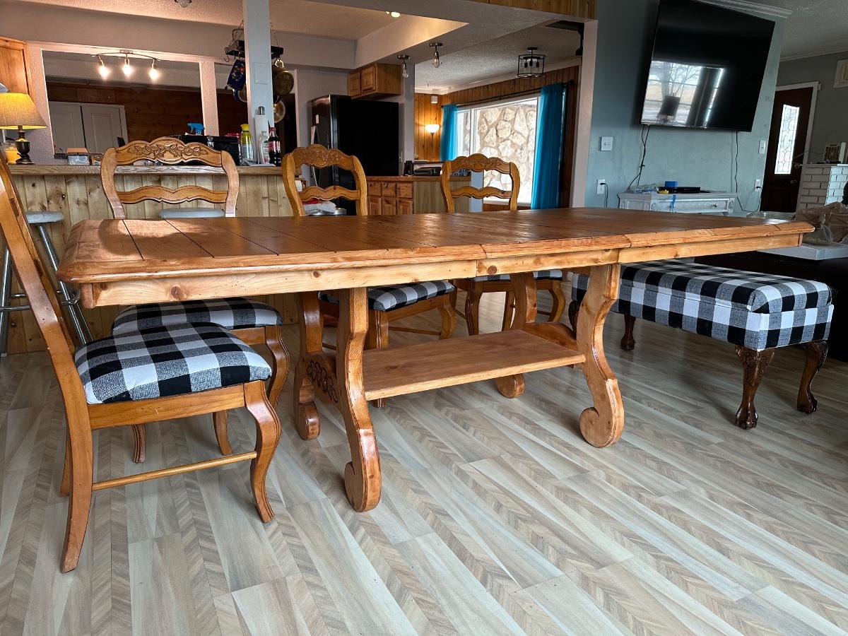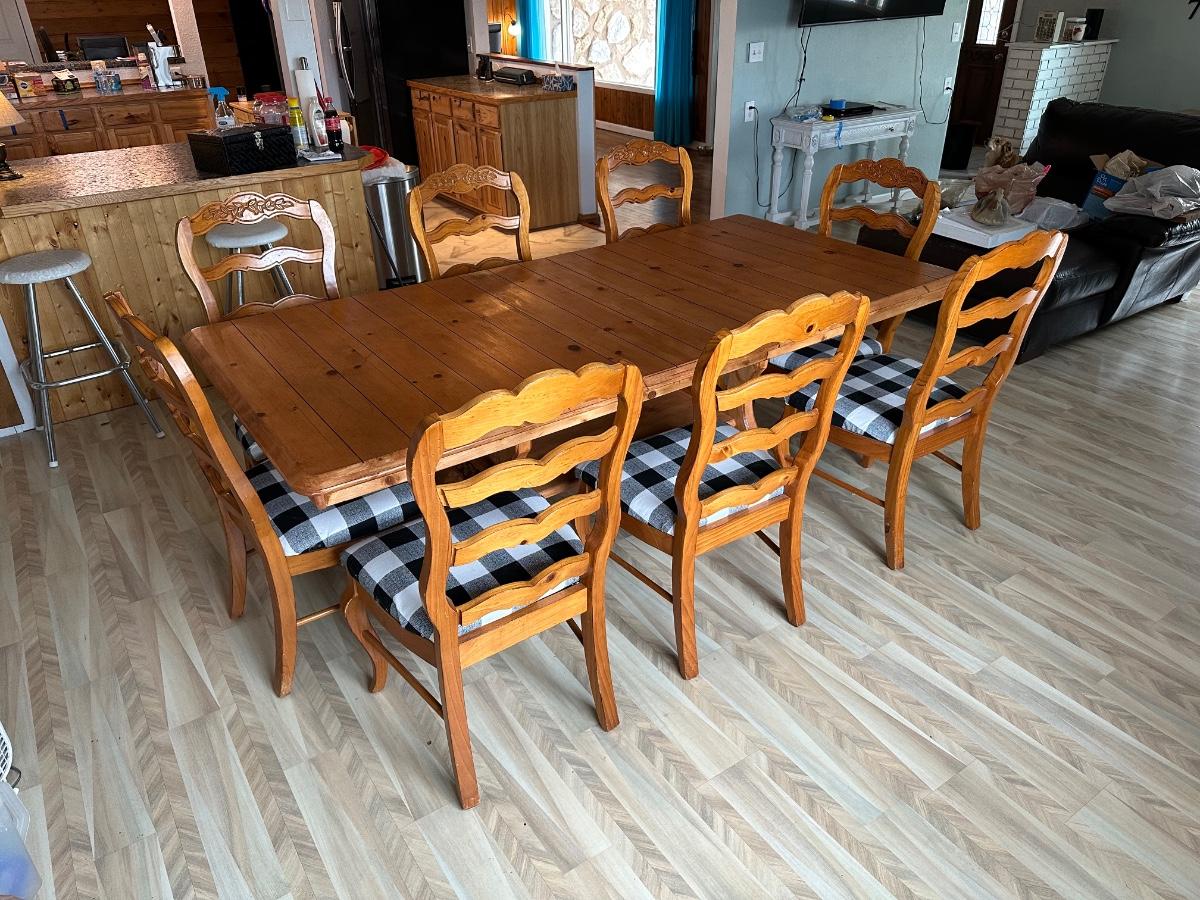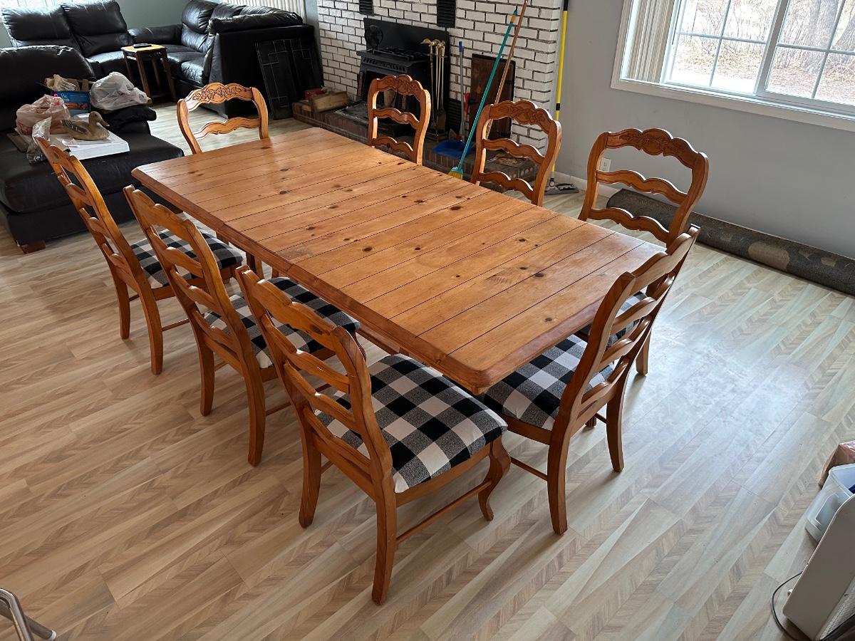Beautiful Dining table with 8 chairs and cushioned bench. The seat cushions all match with the bench. Very nicely built table and table leaf that adds 18”. The bench does have a storage area, with more matching material and brand new tablecloth.