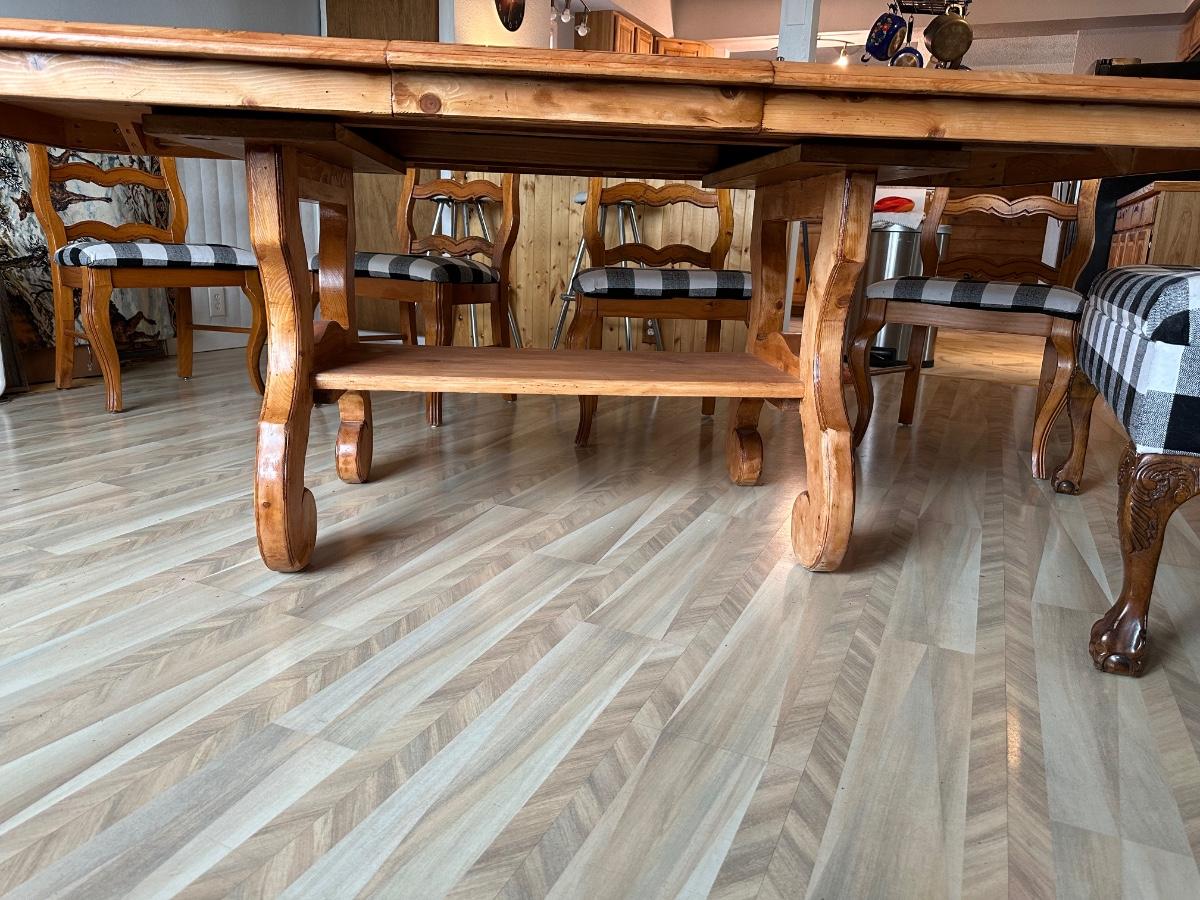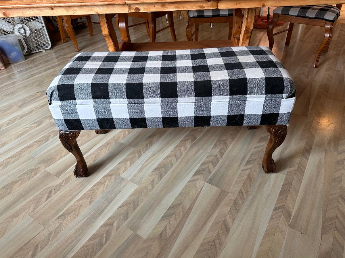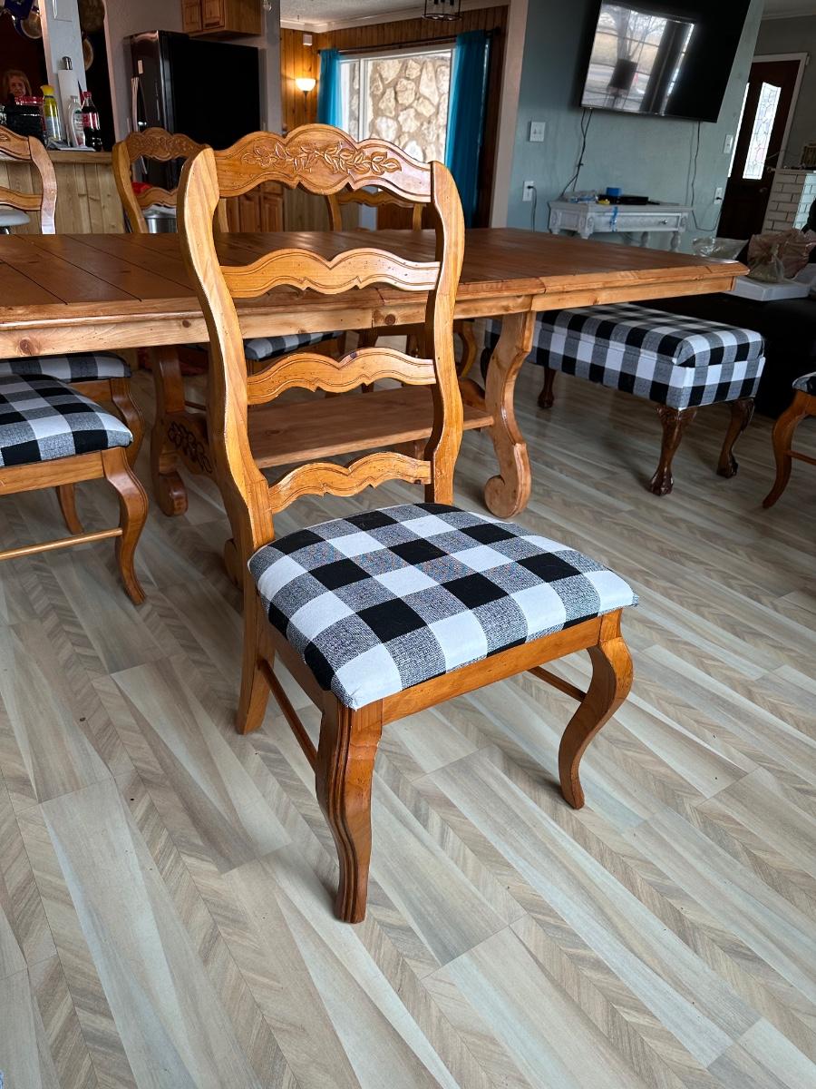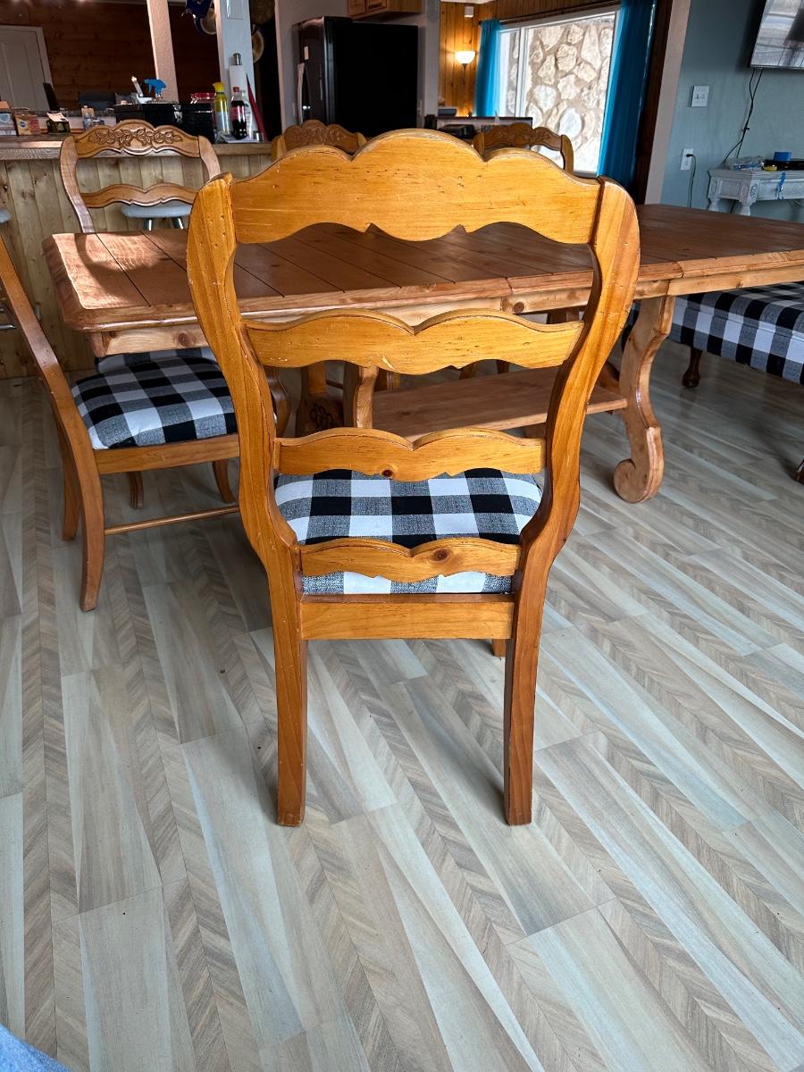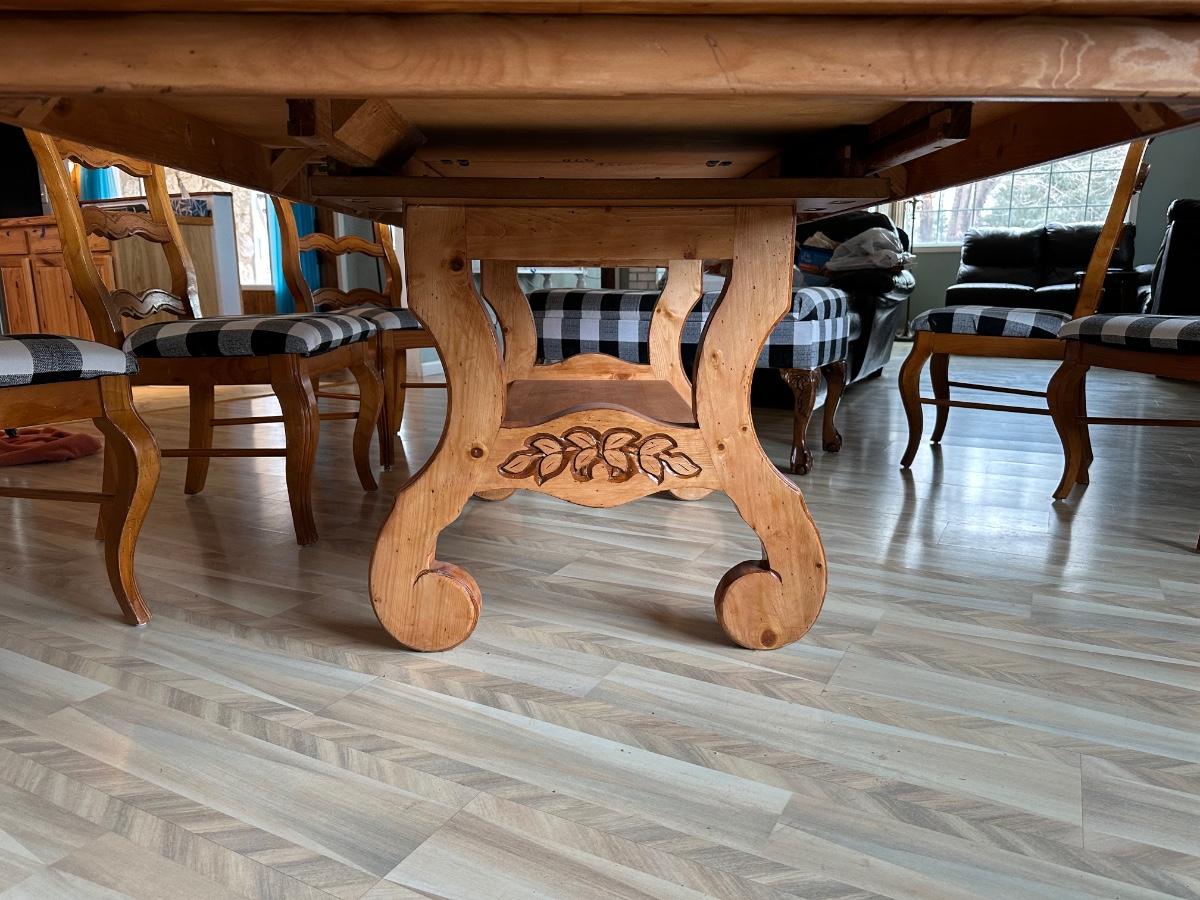 Beautiful Dining table with 8 chairs and cushioned bench. The seat cushions all match with the bench. Very nicely built table and table leaf that adds 18”. The bench does have a storage area, with more matching material and brand new tablecloth.