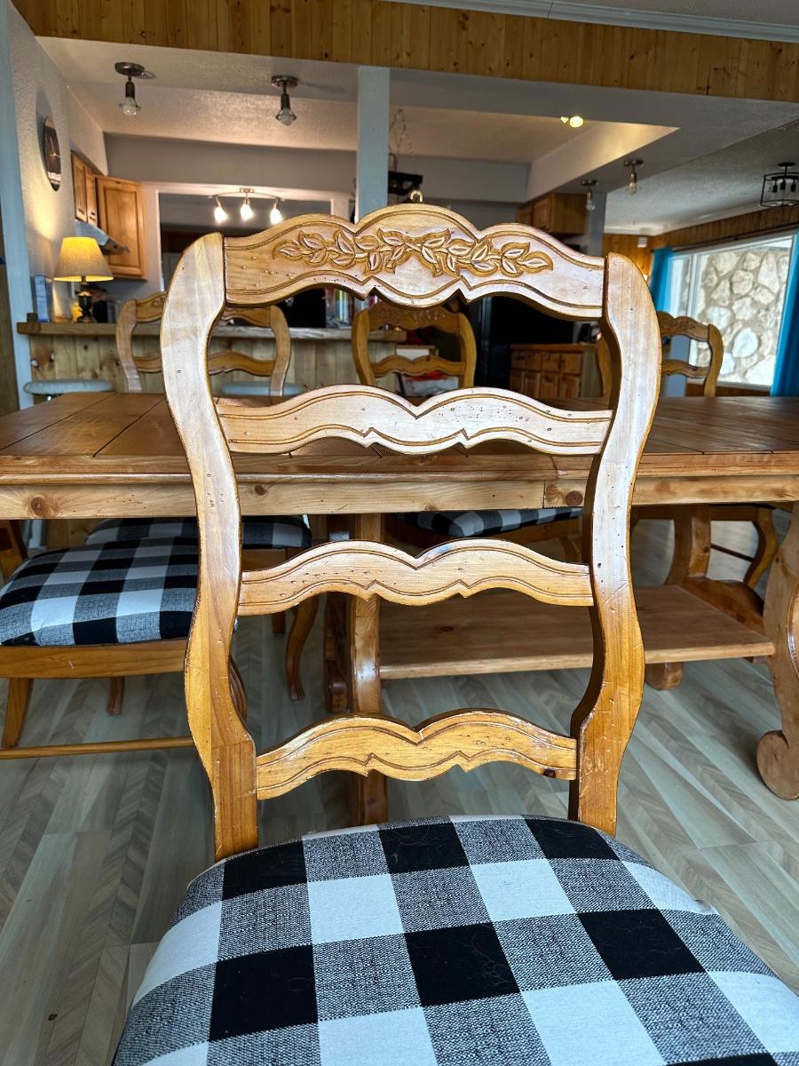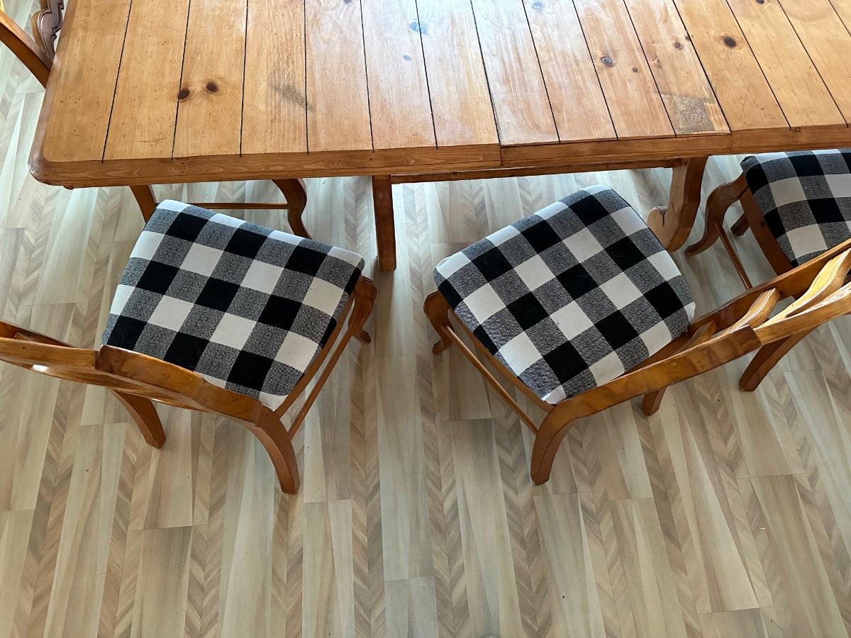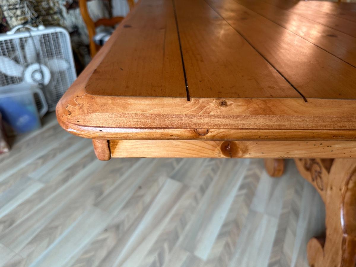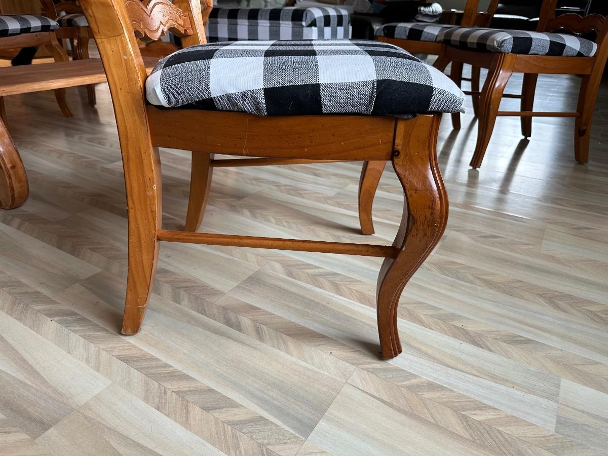 Beautiful Dining table with 8 chairs and cushioned bench. The seat cushions all match with the bench. Very nicely built table and table leaf that adds 18”. The bench does have a storage area, with more matching material and brand new tablecloth.