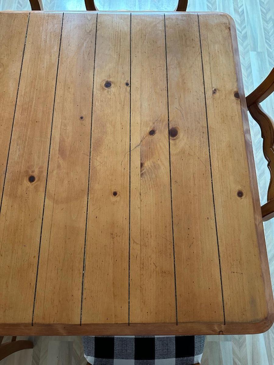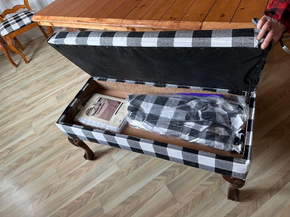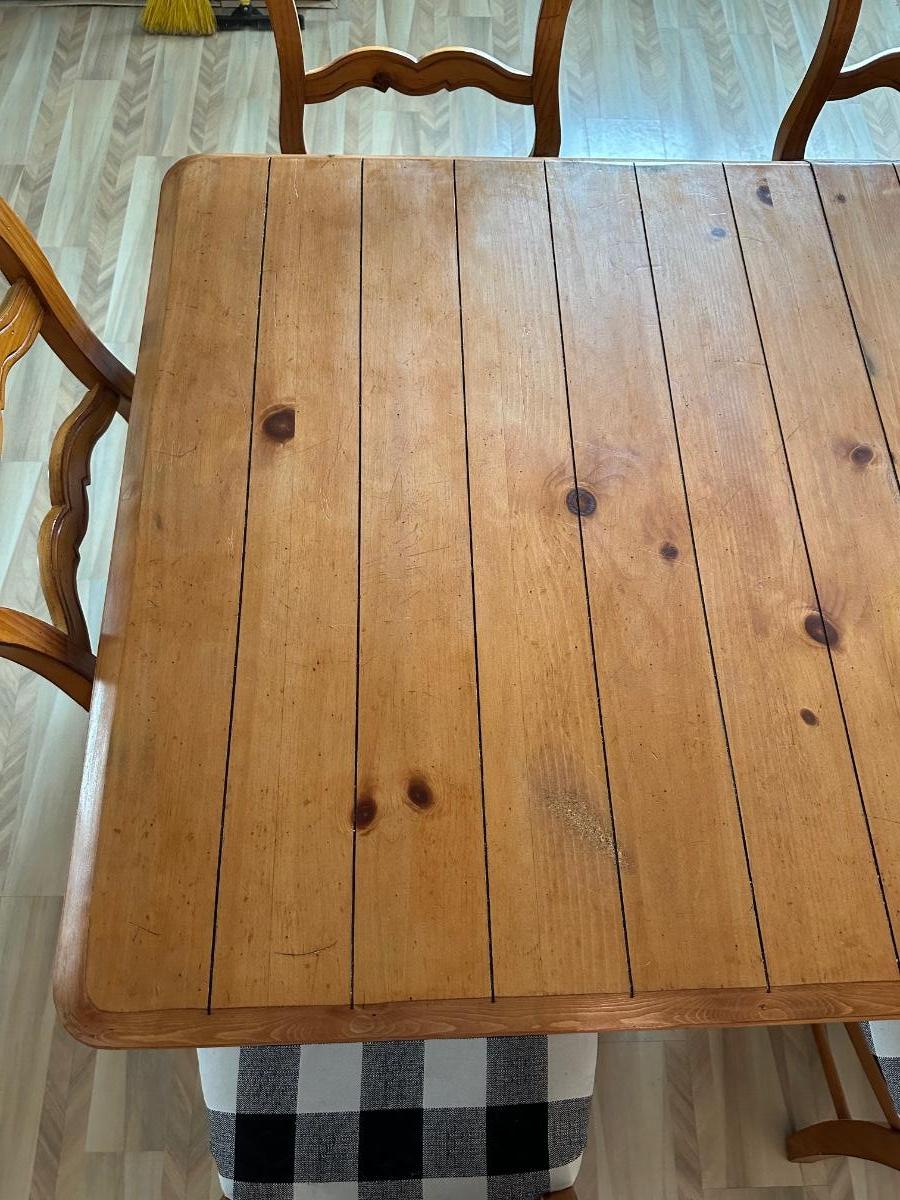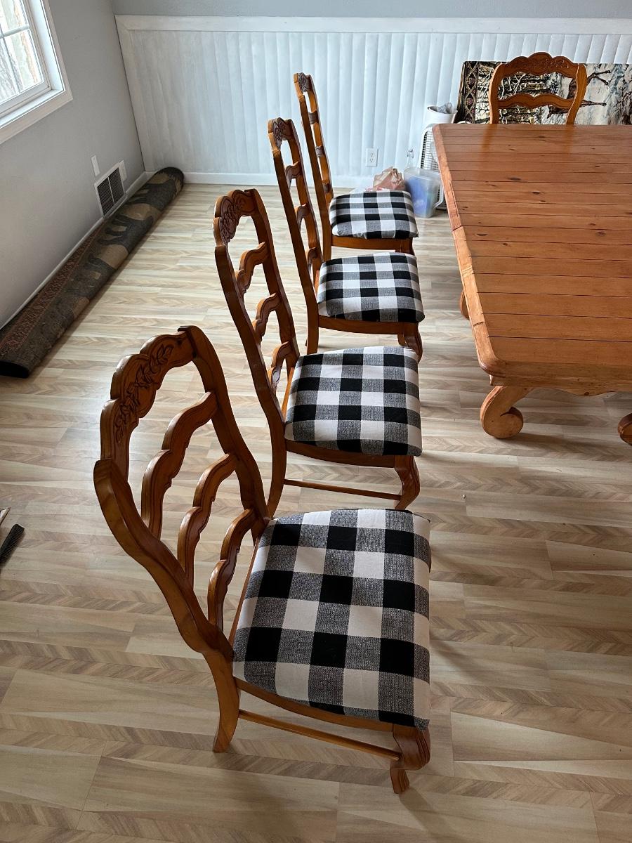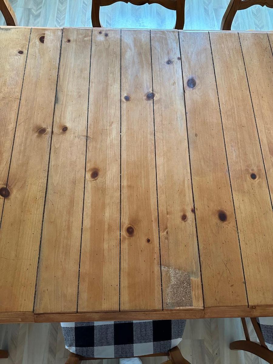 Beautiful Dining table with 8 chairs and cushioned bench. The seat cushions all match with the bench. Very nicely built table and table leaf that adds 18”. The bench does have a storage area, with more matching material and brand new tablecloth.
