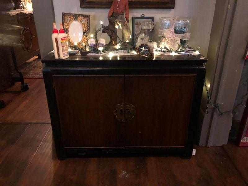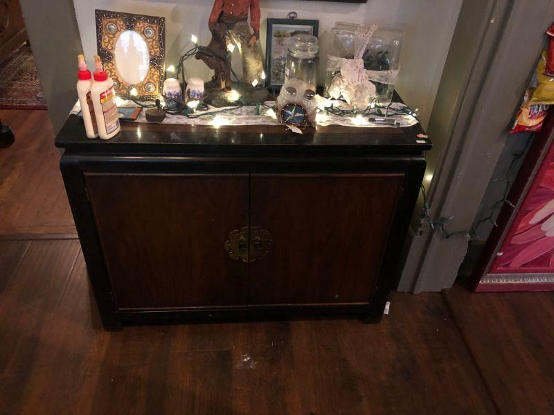 BLACK LAQUER FRAMED WITH WALNUT INSET CABINET. WITH BRASS ORNAMENTAL DOOR PULLS. ONE SHELF ON THE INSIDE. EXCELLENT CONDITION!