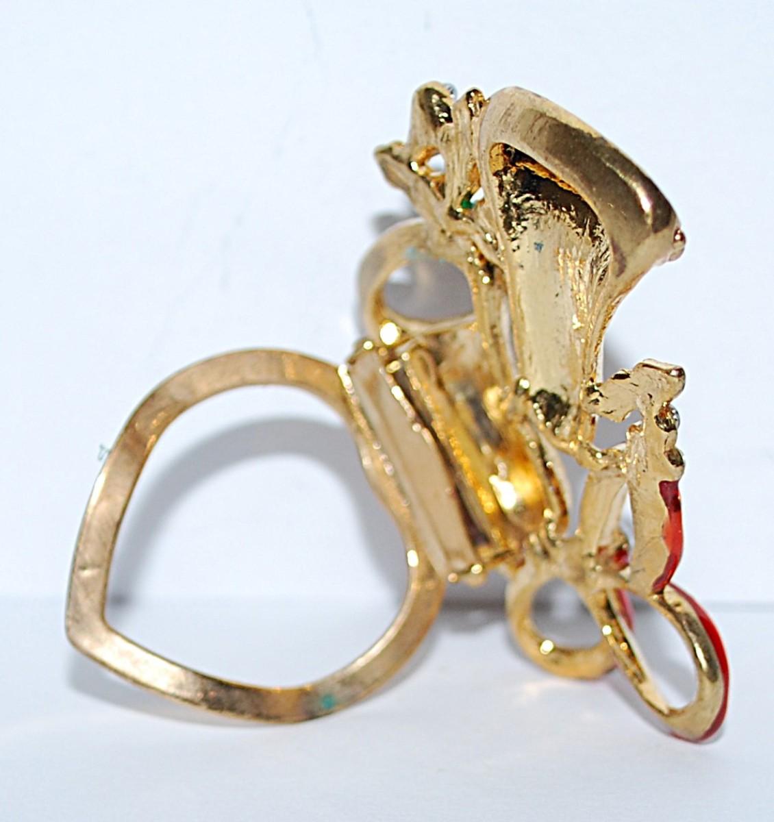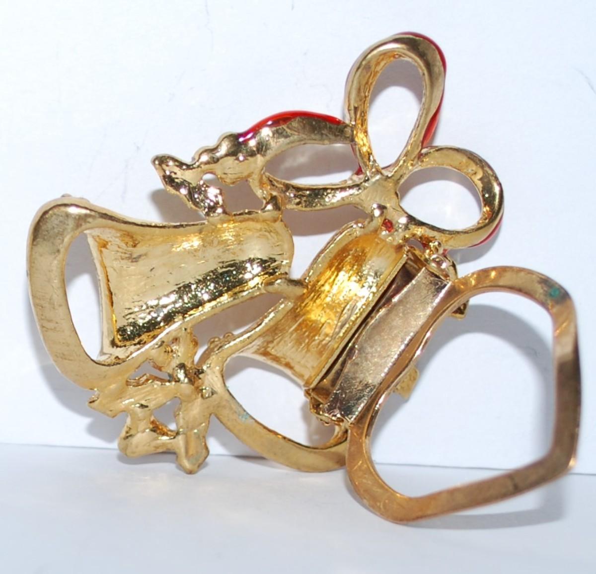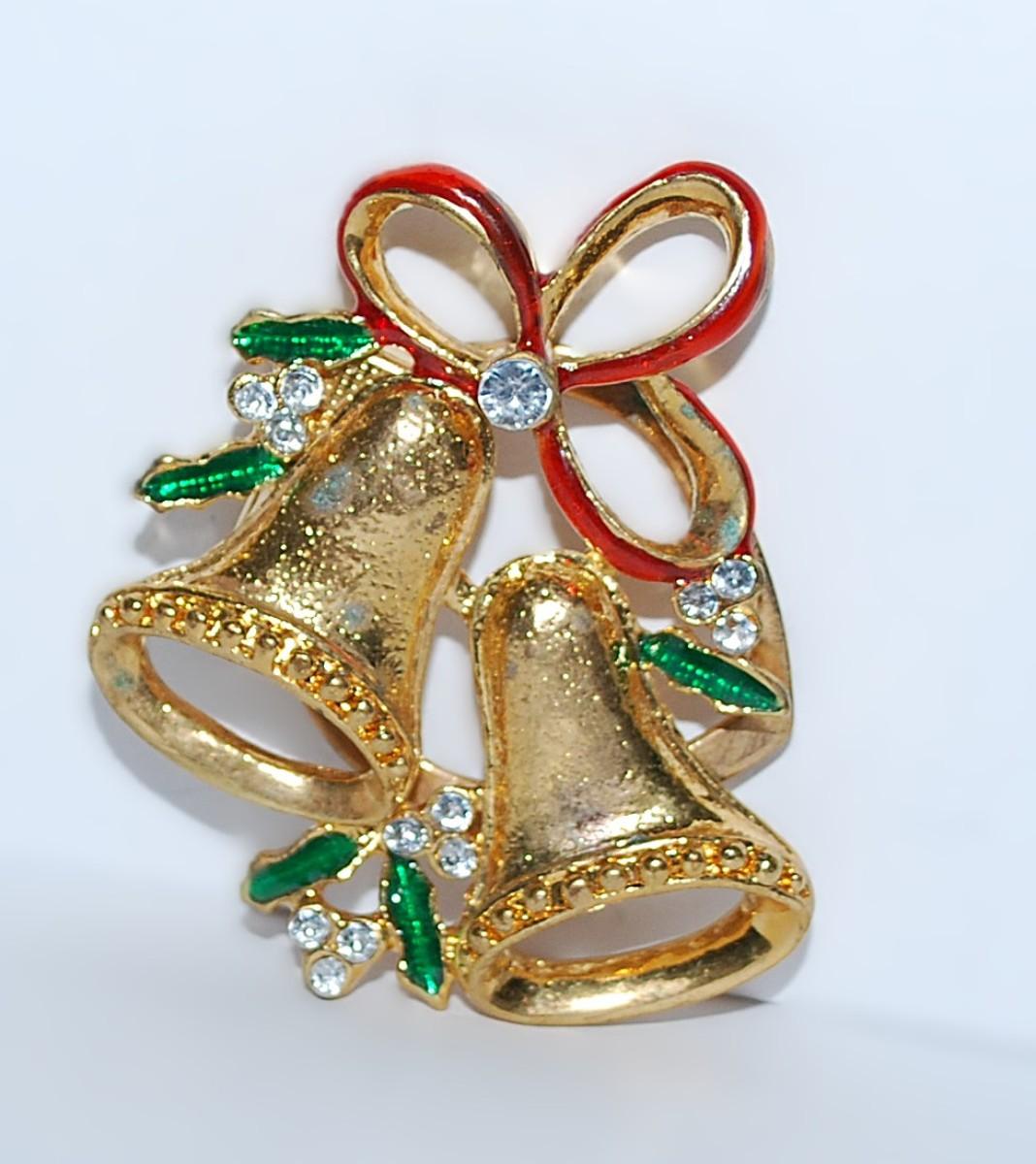 Beautiful Double BELLS LAPEL/SCARF BROOCH (1¾" x 1½") with Red & Green Highlights and 13 Clear Stones on a Gold Tone Setting