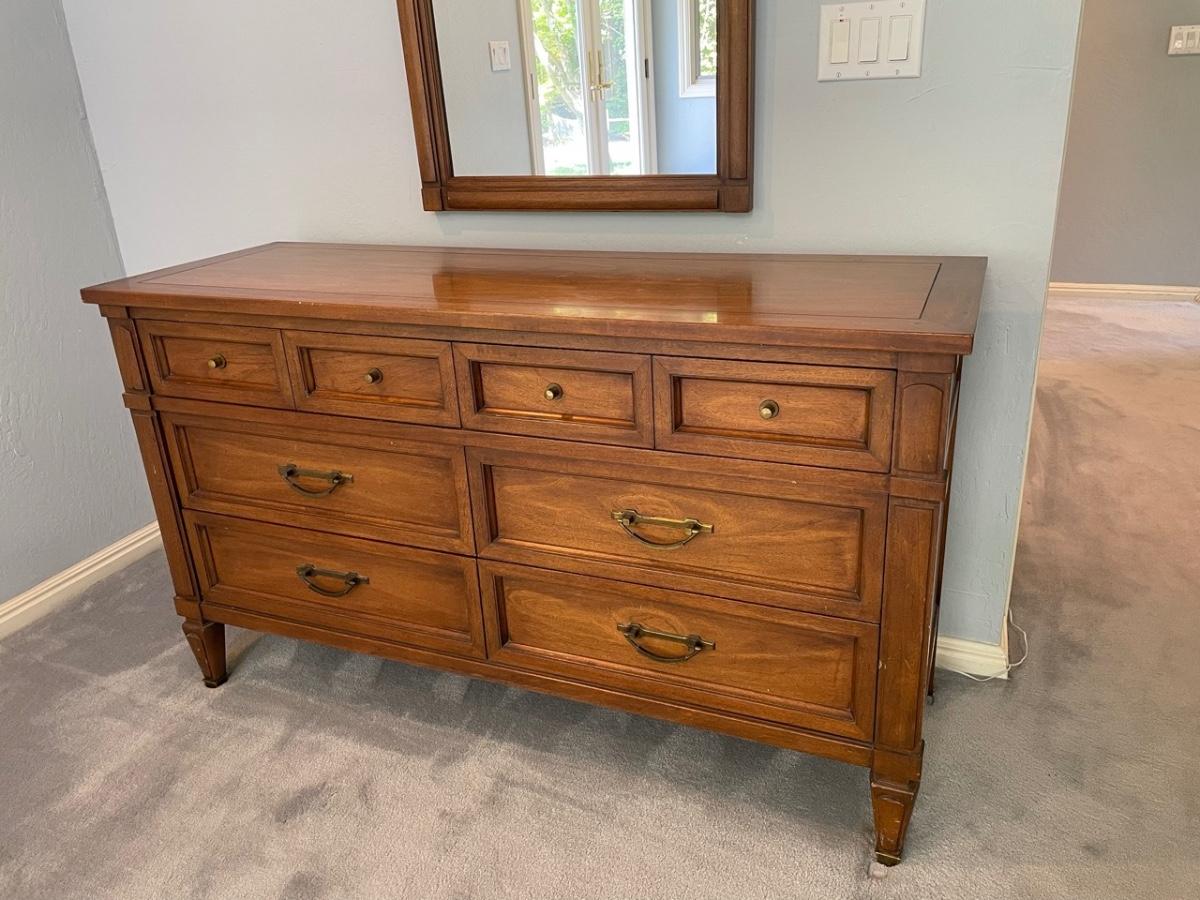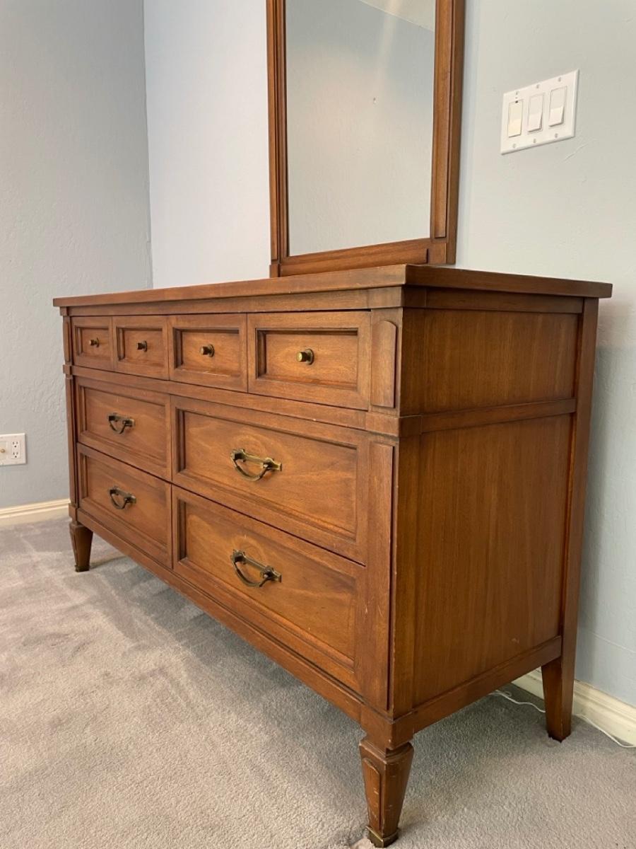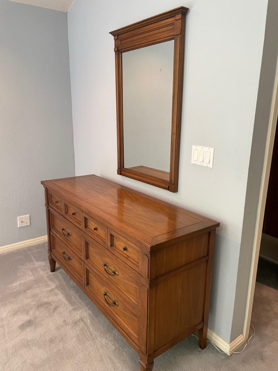 Solid wood. Excellent shape. 8 drawers. Dresser: 56”x19” Mirror: 26x41