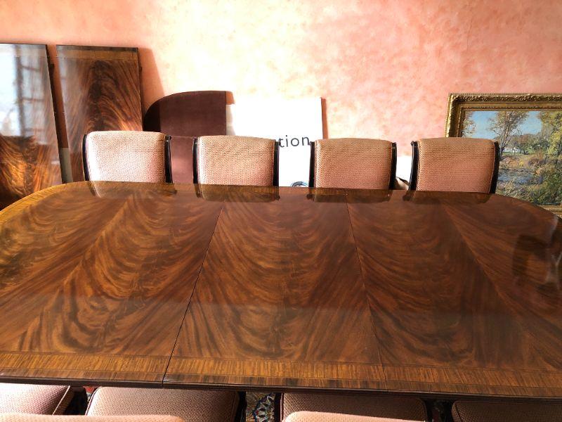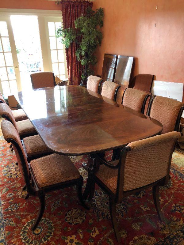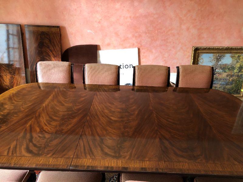 Absolutely gorgeous dining table! Perfect for big gatherings with family and friends. Made by Drexel Heirloom by Heritage collection, in an elegant wood finish. In excellent condition (spent most of the time with the table covers on!). Includes table covers and extension pieces. Chairs not included (they are not a matching set). From a San Francisco Presidio Heights family estate.