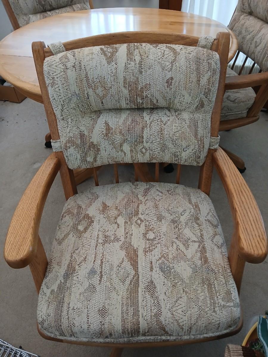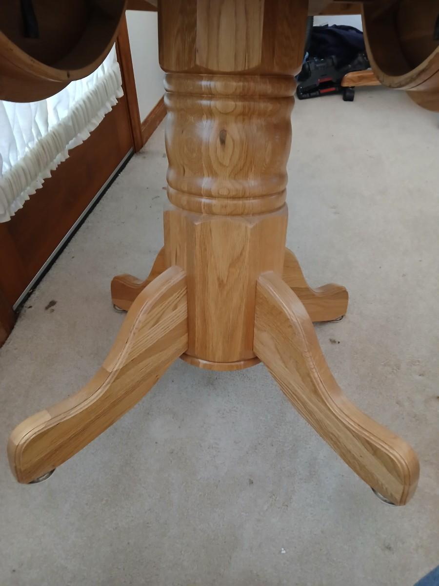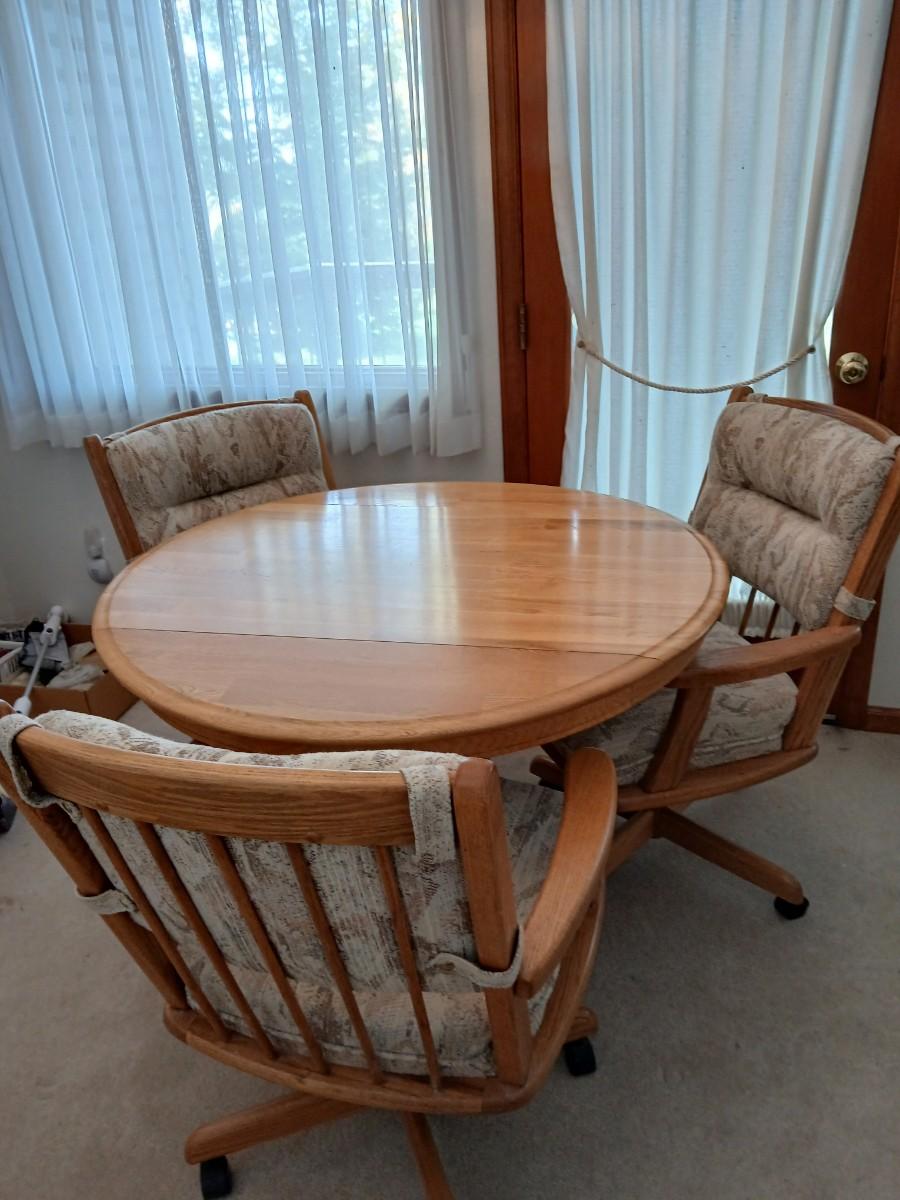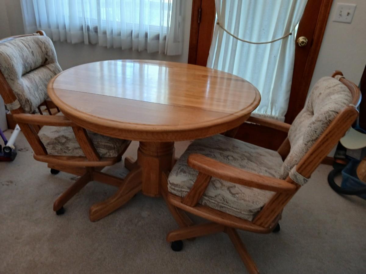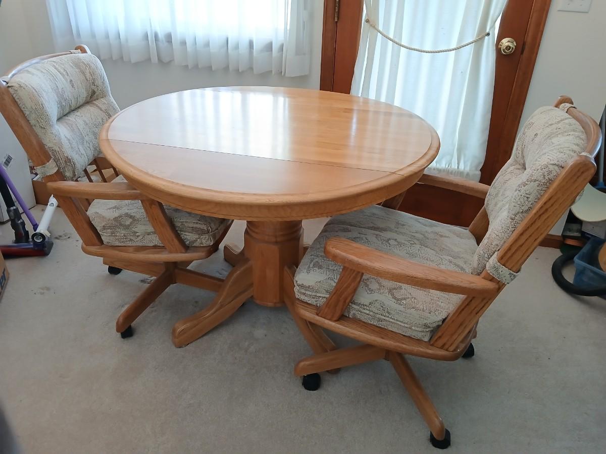 Beautiful drop leaf Oak pedestal table with three upholstered chairs on casters