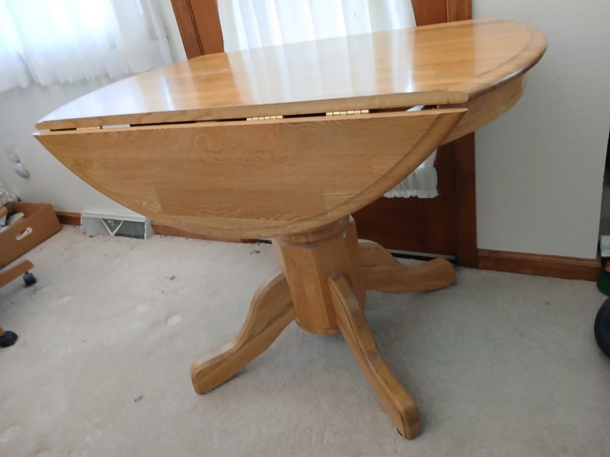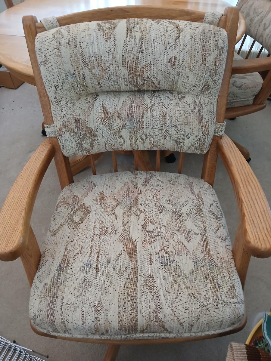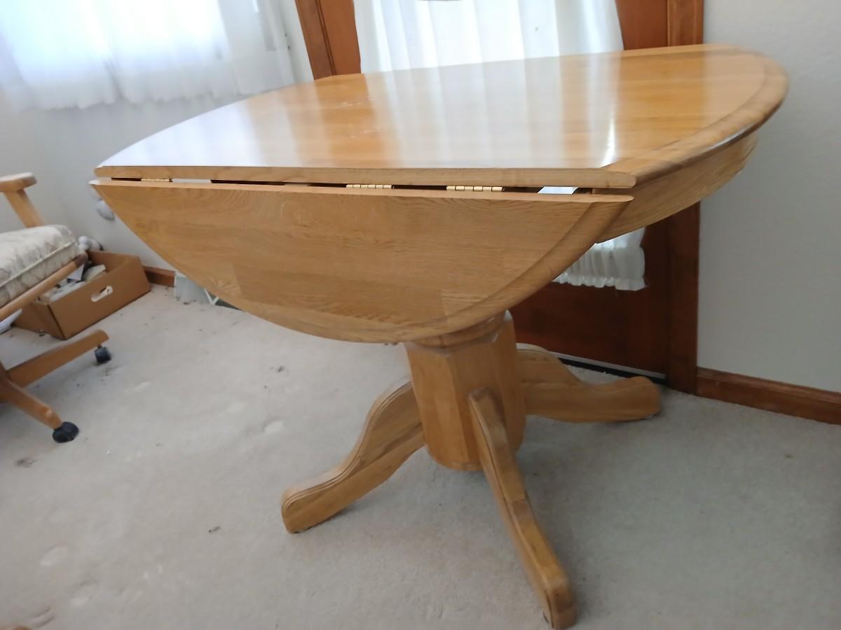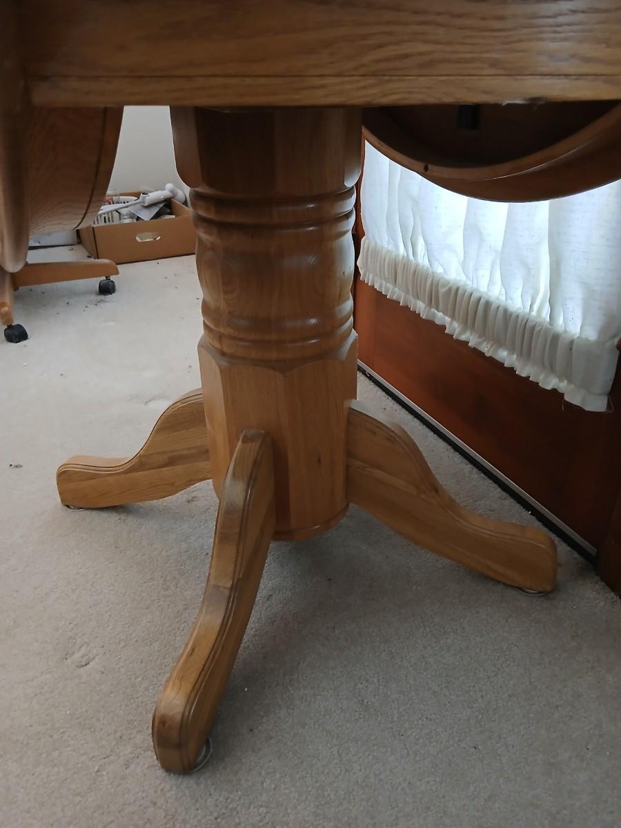 Beautiful drop leaf Oak pedestal table with three upholstered chairs on casters