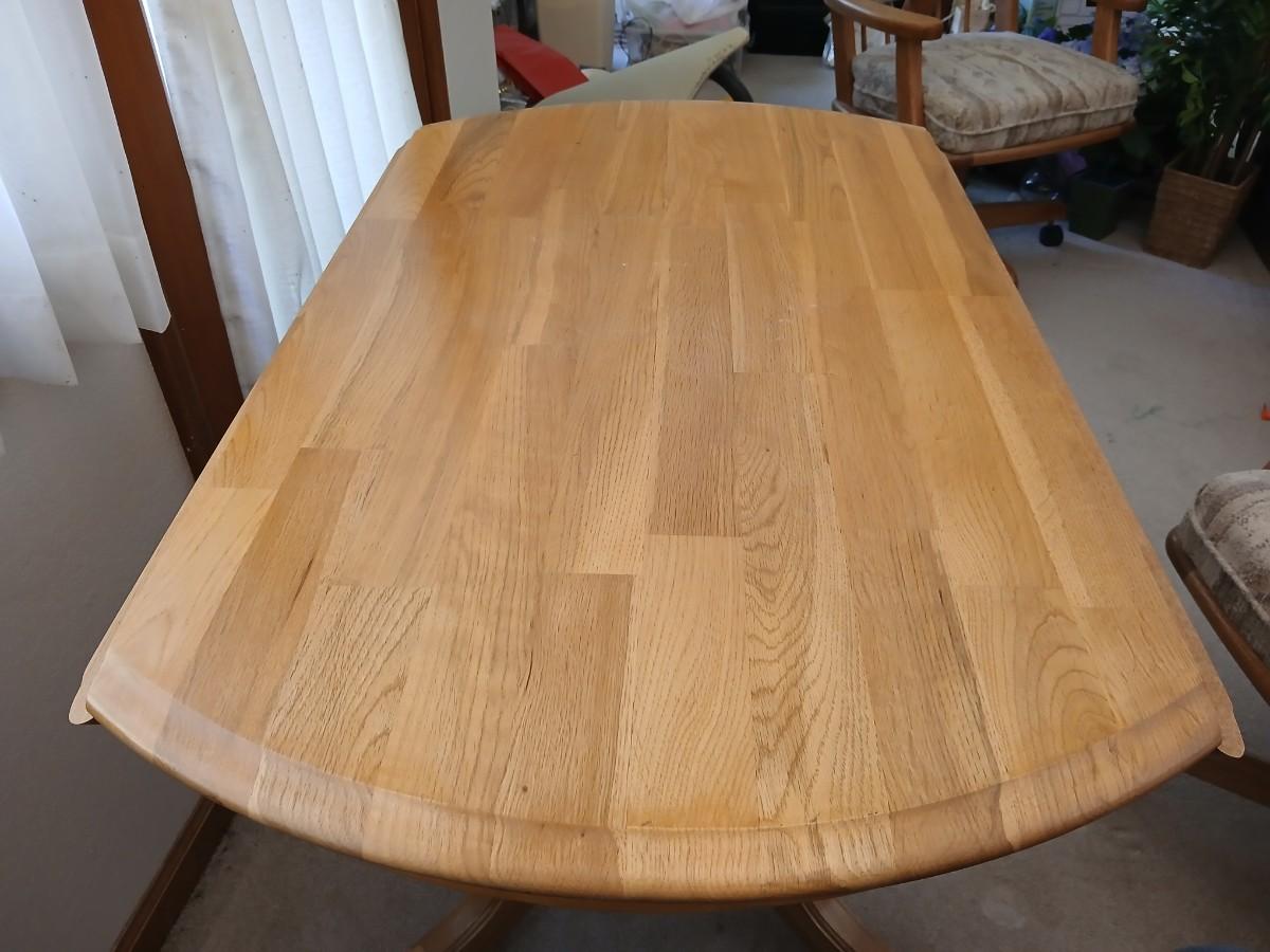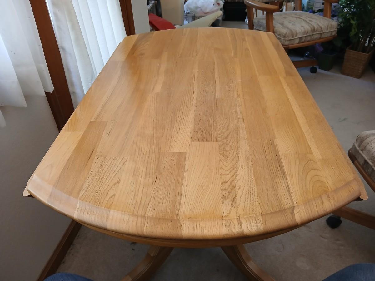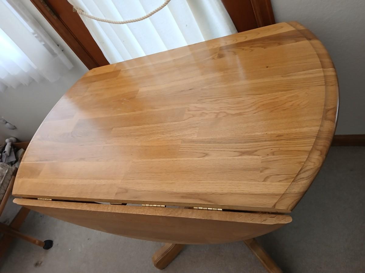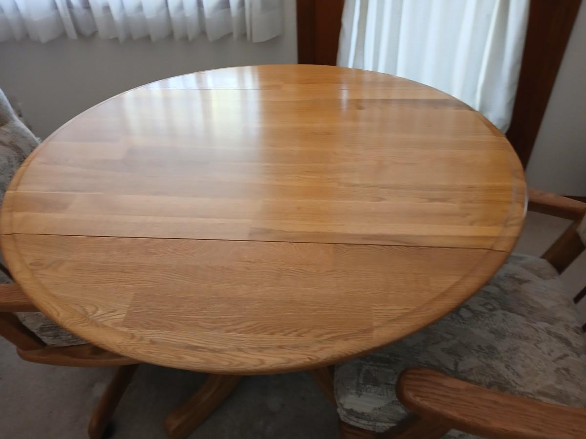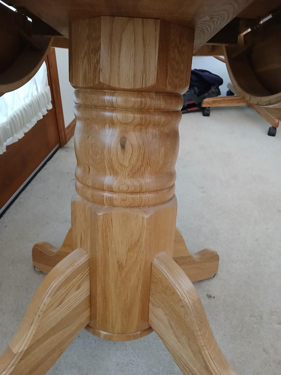 Beautiful drop leaf Oak pedestal table with three upholstered chairs on casters