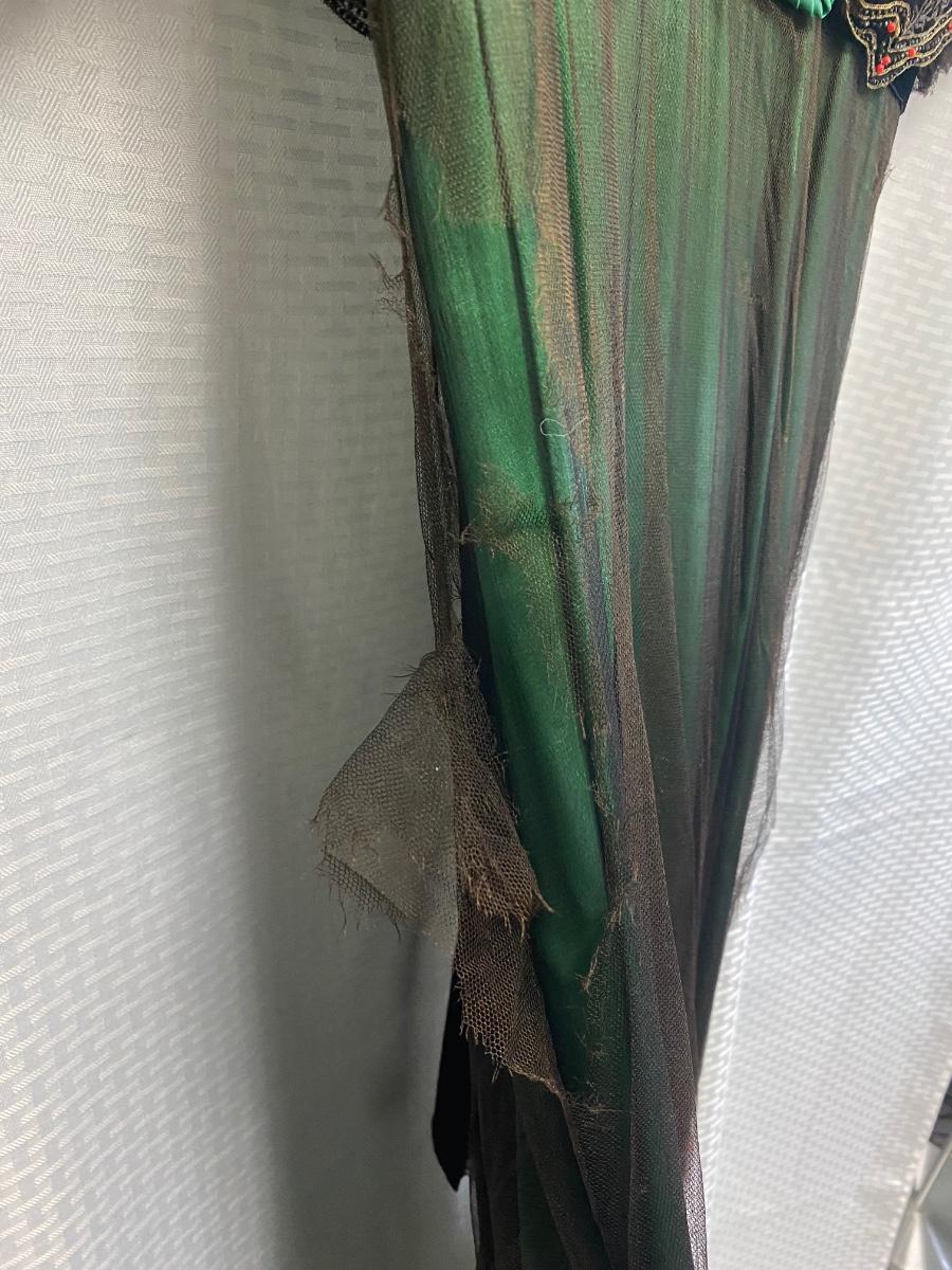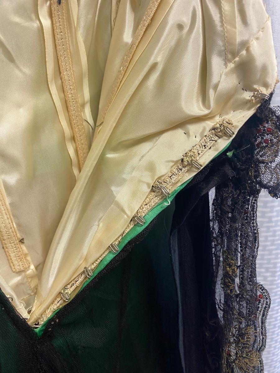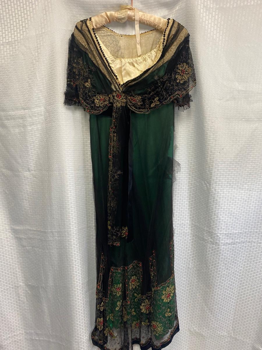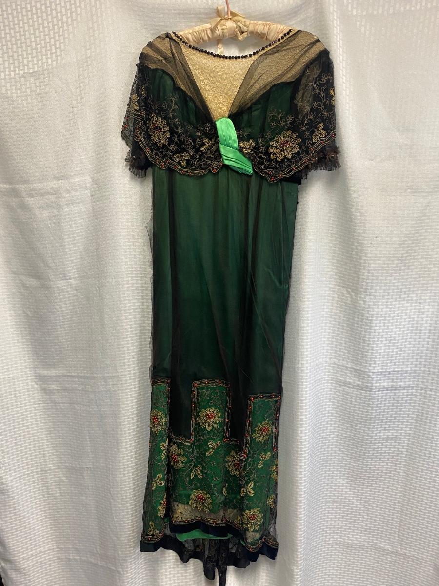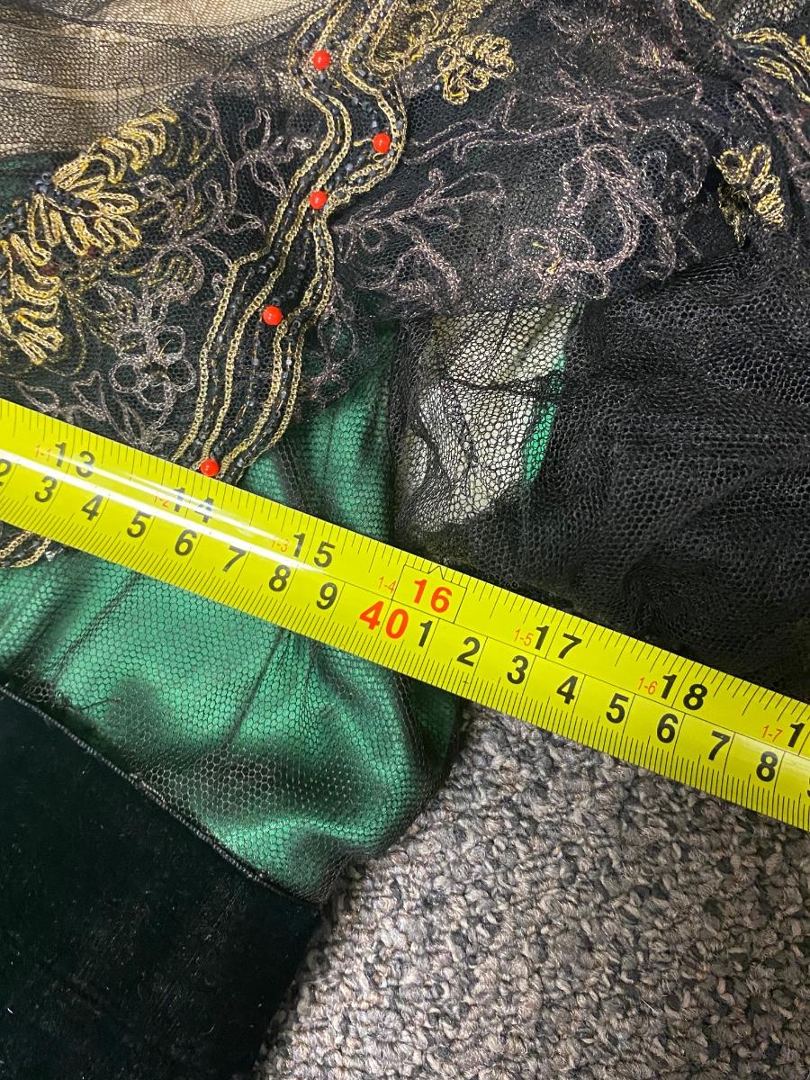 Beautiful Emerald Green & Black Lace Victorian Era Early 1900s Dress Evening Gown. Emerald green gown with a black mesh lace on top. Floral embroidered pattern to the lace. Lined inside with boning at the torso. While the green fabric is in good antique condition the black lace is very delicate, has holes/tears and will very easily tear if handled improperly. Good for repair or as a pattern for a reproduction piece. The dress and details are stunning, a true beauty from the past. Armpit to armpit is about 17". Dress has boning inside but does look to have an empire waist. Shoulder to hem is about 52" and seems to have a slight high/low with the back ham a bit longer at almost 59". See Photos. This is a time piece original not reproduction. Previous owner was part of historical society that dressed in Victorian era garments.