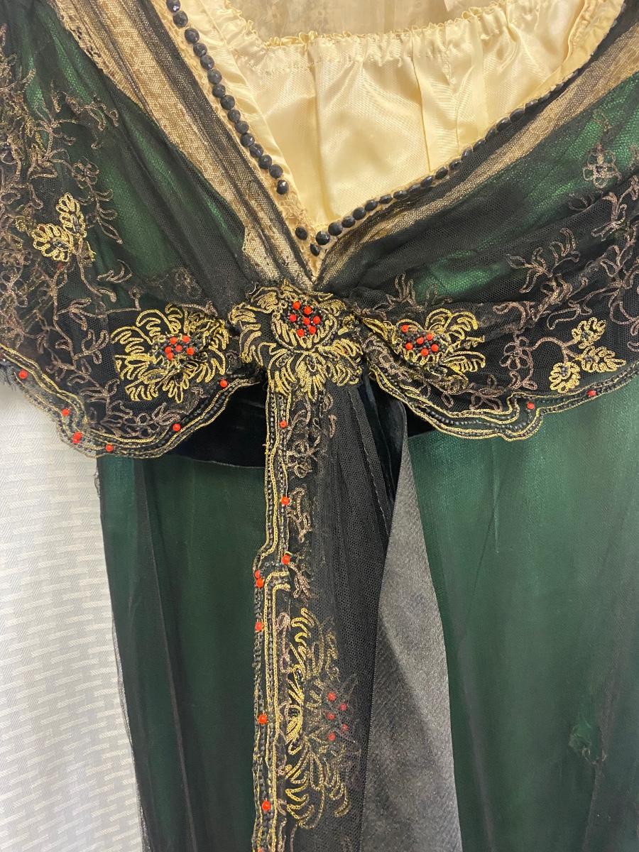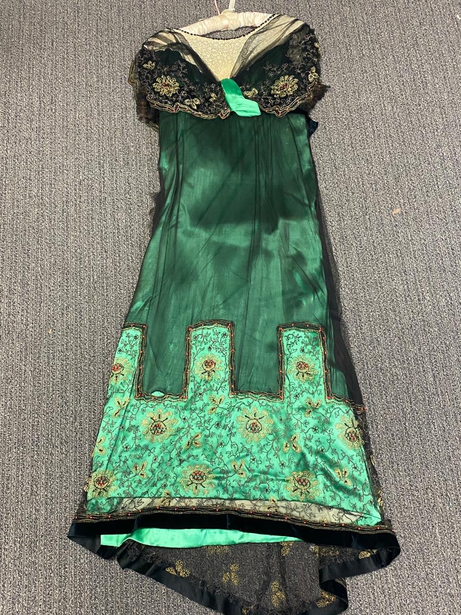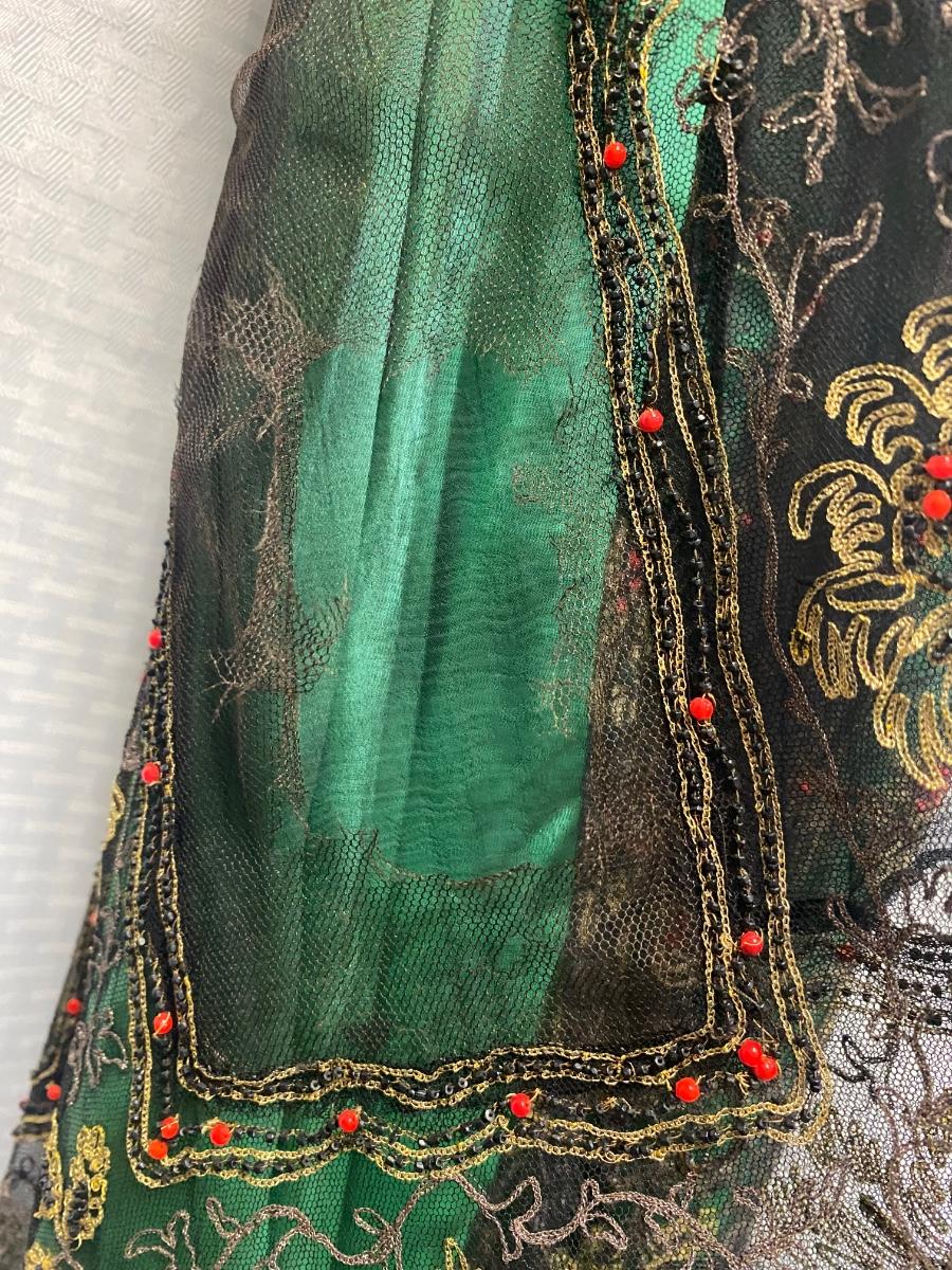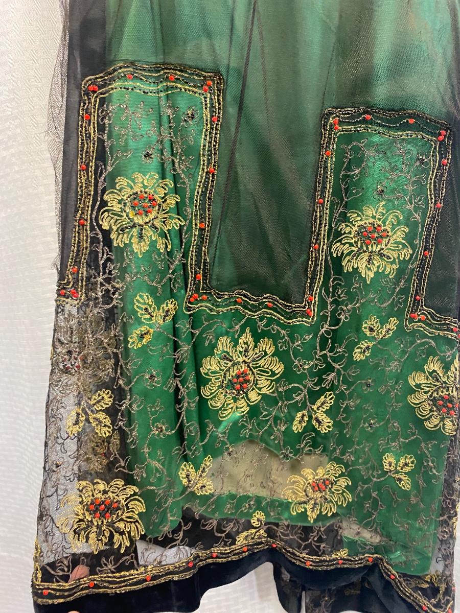 Beautiful Emerald Green & Black Lace Victorian Era Early 1900s Dress Evening Gown. Emerald green gown with a black mesh lace on top. Floral embroidered pattern to the lace. Lined inside with boning at the torso. While the green fabric is in good antique condition the black lace is very delicate, has holes/tears and will very easily tear if handled improperly. Good for repair or as a pattern for a reproduction piece. The dress and details are stunning, a true beauty from the past. Armpit to armpit is about 17". Dress has boning inside but does look to have an empire waist. Shoulder to hem is about 52" and seems to have a slight high/low with the back ham a bit longer at almost 59". See Photos. This is a time piece original not reproduction. Previous owner was part of historical society that dressed in Victorian era garments.