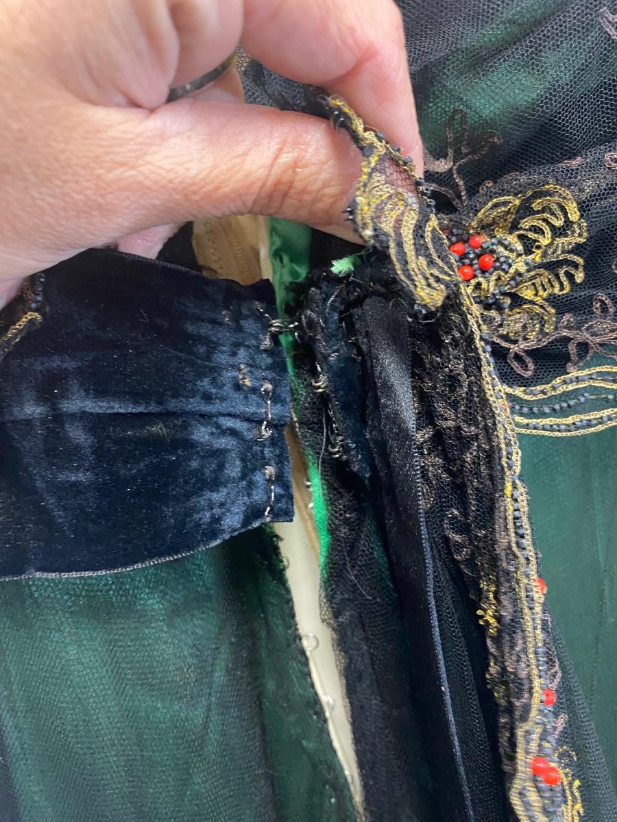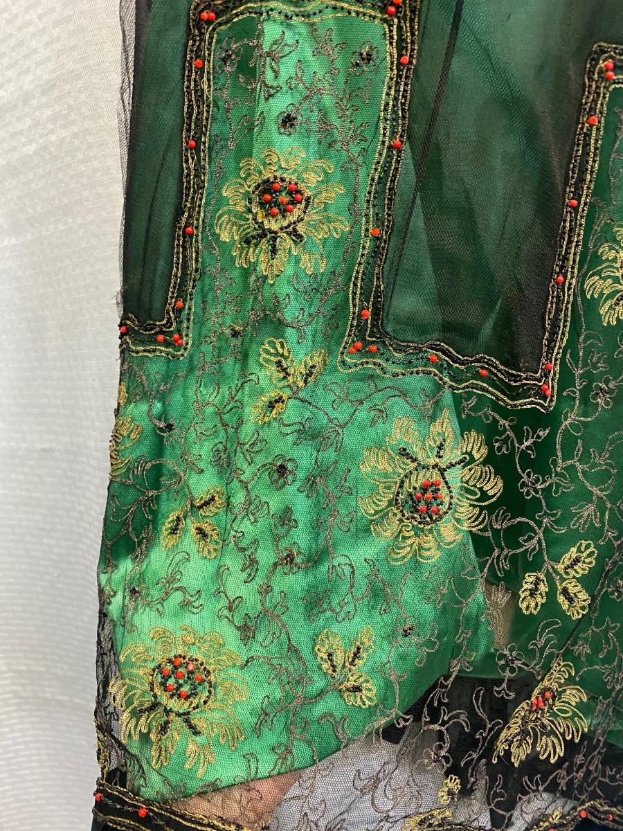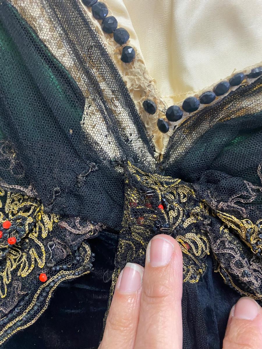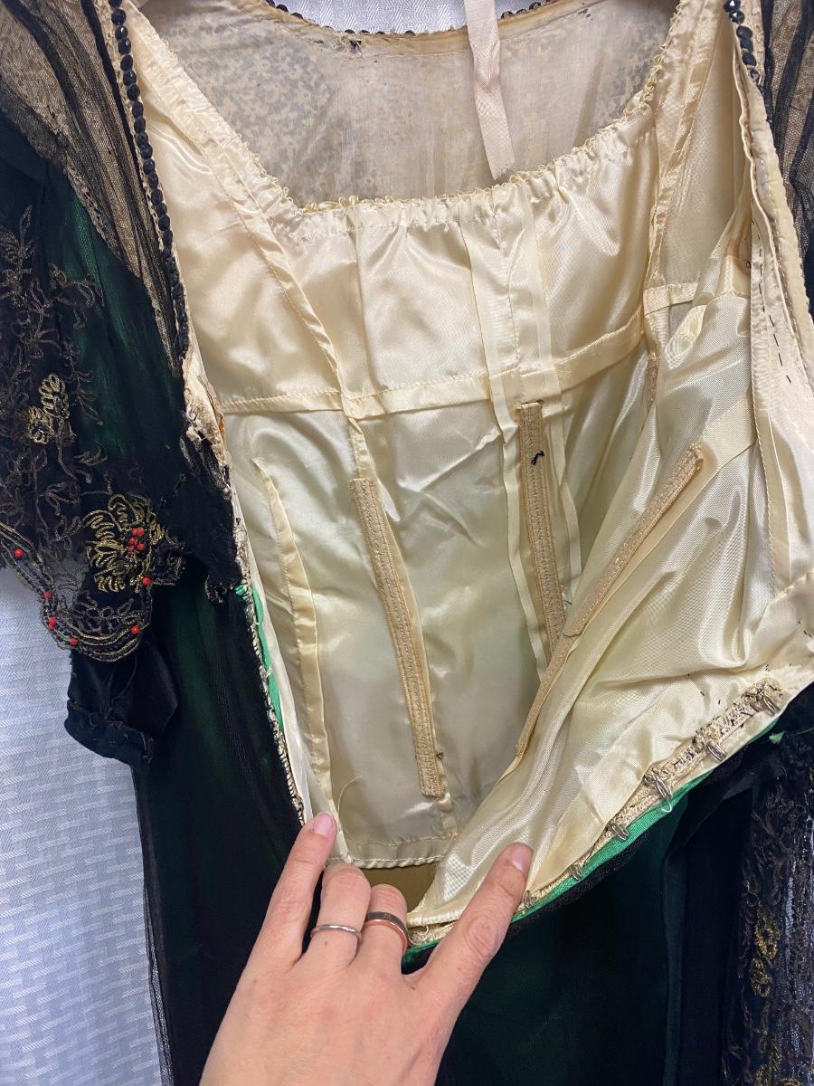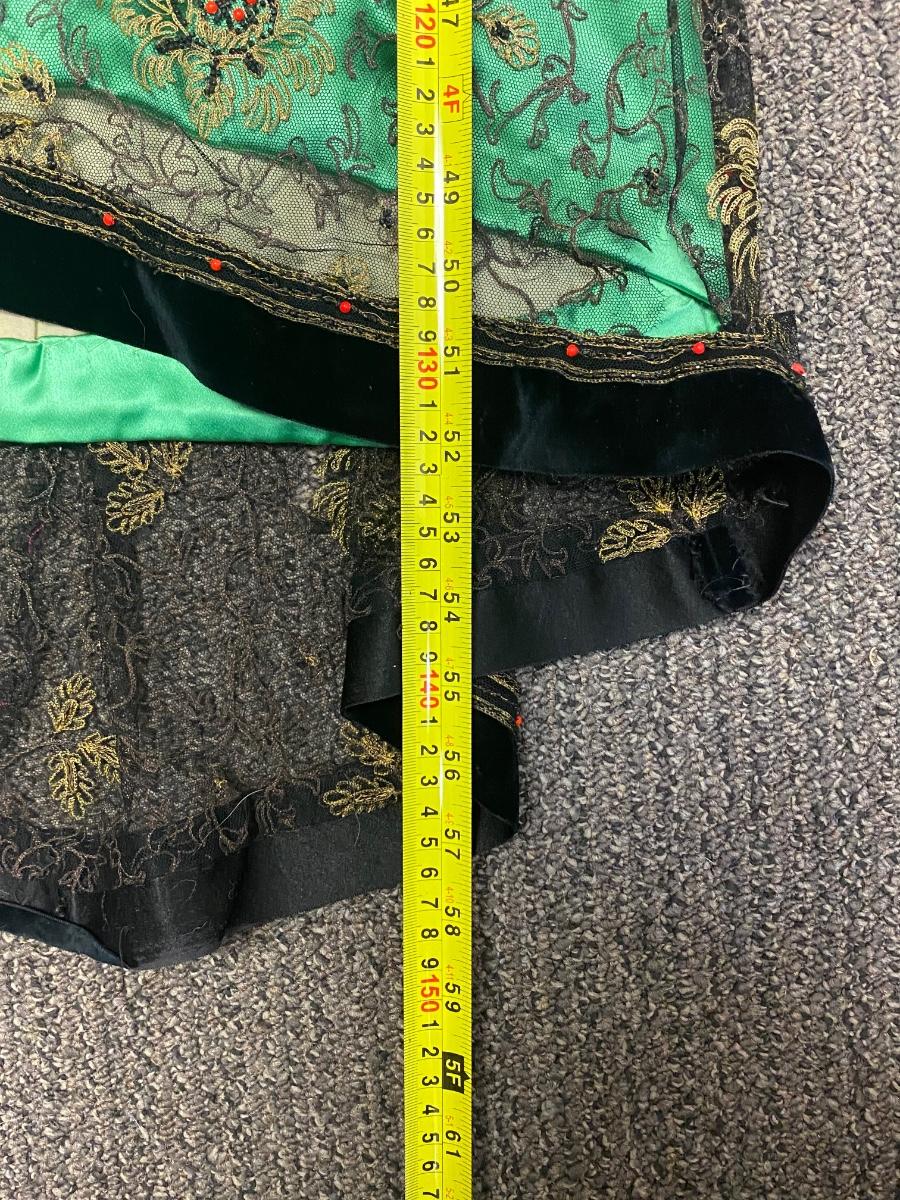 Beautiful Emerald Green & Black Lace Victorian Era Early 1900s Dress Evening Gown. Emerald green gown with a black mesh lace on top. Floral embroidered pattern to the lace. Lined inside with boning at the torso. While the green fabric is in good antique condition the black lace is very delicate, has holes/tears and will very easily tear if handled improperly. Good for repair or as a pattern for a reproduction piece. The dress and details are stunning, a true beauty from the past. Armpit to armpit is about 17". Dress has boning inside but does look to have an empire waist. Shoulder to hem is about 52" and seems to have a slight high/low with the back ham a bit longer at almost 59". See Photos. This is a time piece original not reproduction. Previous owner was part of historical society that dressed in Victorian era garments.