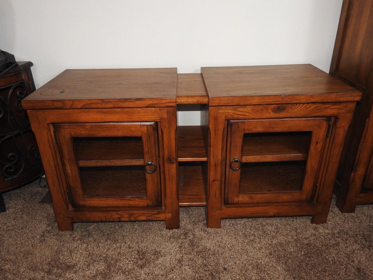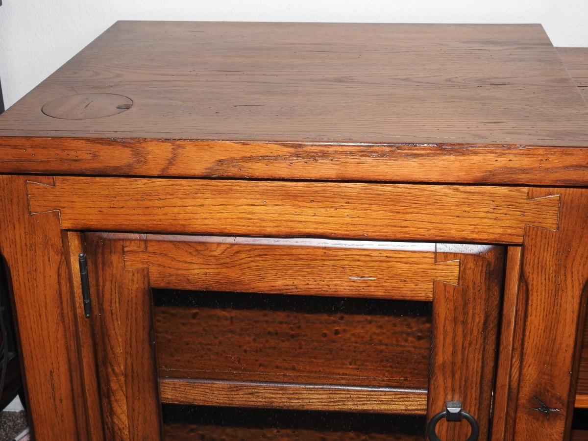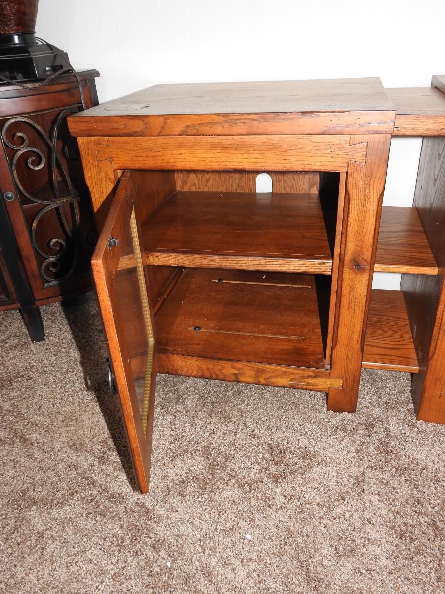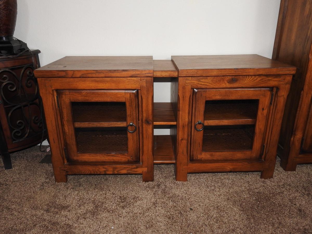 Beautiful Entertainment cabinet made of solid wood and dovetail joining , great piece furniture that can be widened if needed ,slides apart for larger tvs , wonderful cabinet space for DVDs and DVD players . In great used condition
