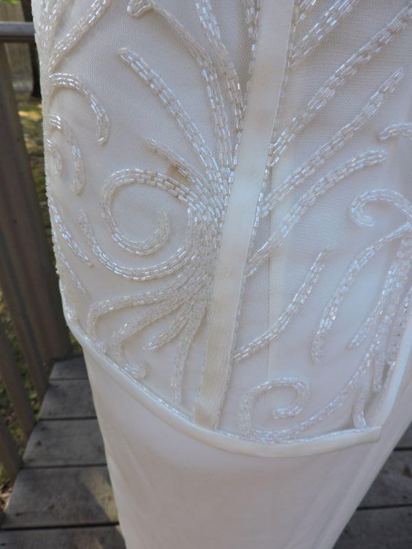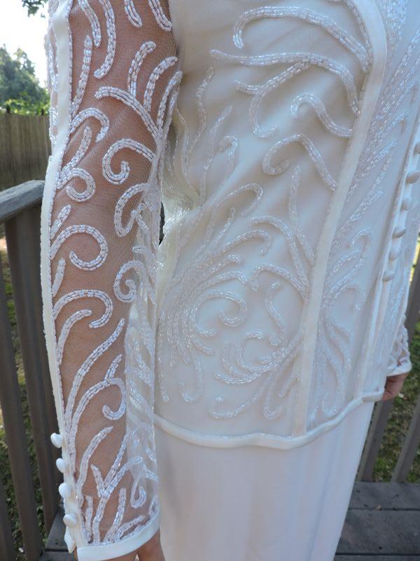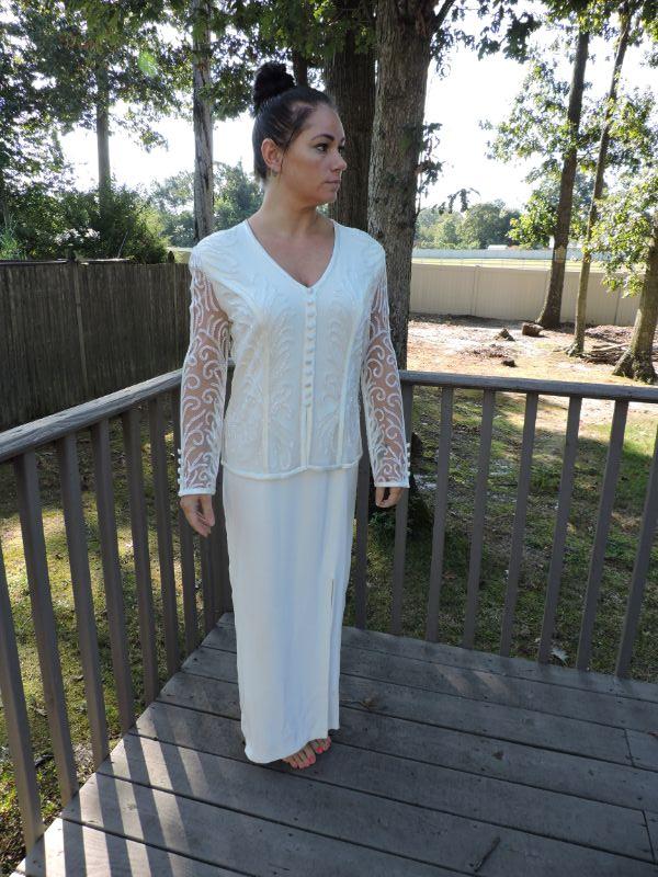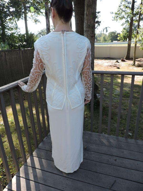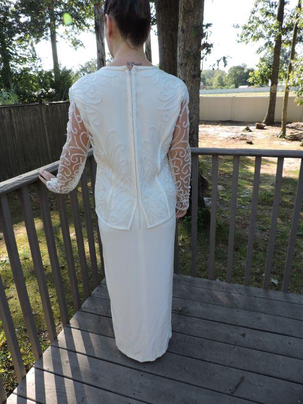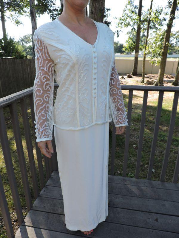 Beautiful long off white dress with attached jacket with embroidery and beading. Has a small stain on the back, should come out with professional cleaning. Dress is probably and 8-10. Model is a 4. **Please read Terms and Conditions before placing a bid. Pick up is Sunday, September 15, 2019 from 11am to 4pm and Tuesday, September 17 from 4pm-7pm in Sicklerville. All sales are final. All sales are as is, where is. Please review all photos. Any props included in photos are not included in listing. All measurements are approximate.