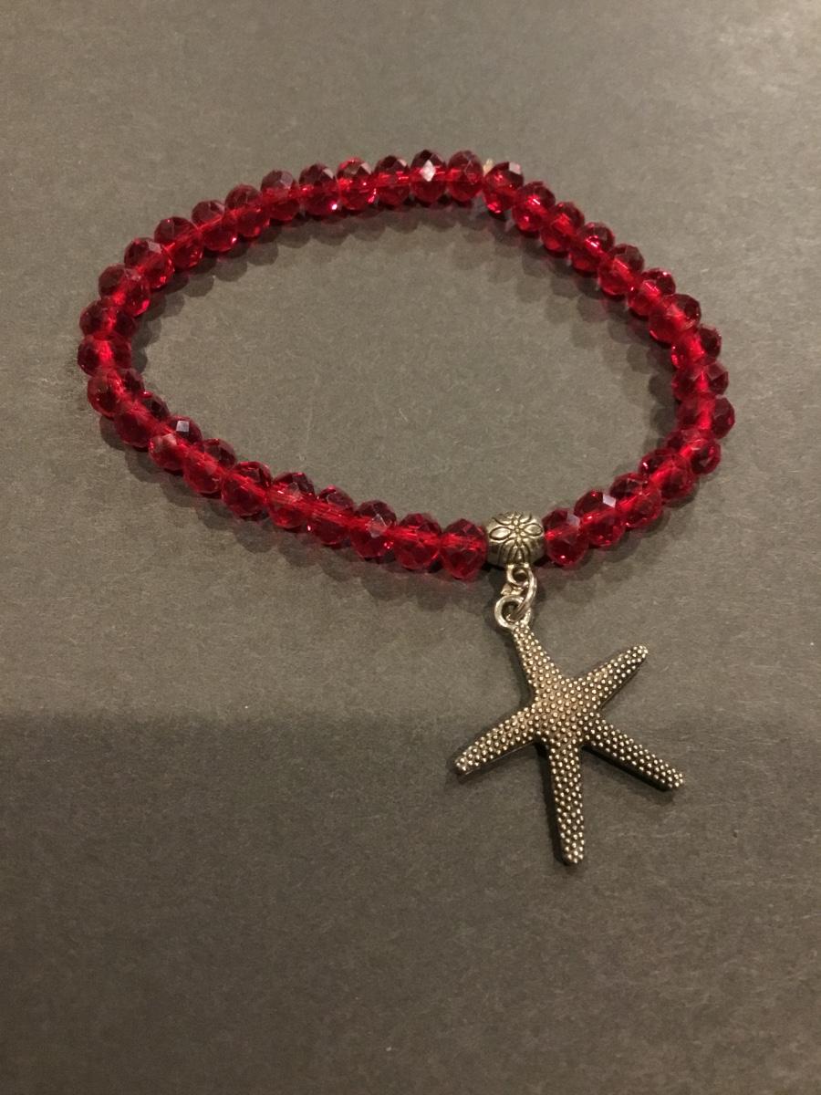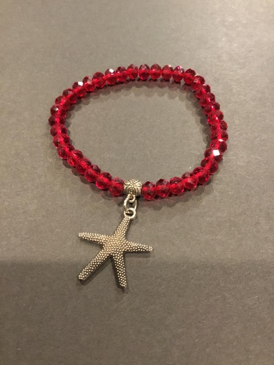 Beautiful, faceted, red crystal bead, stretch bracelet with charm