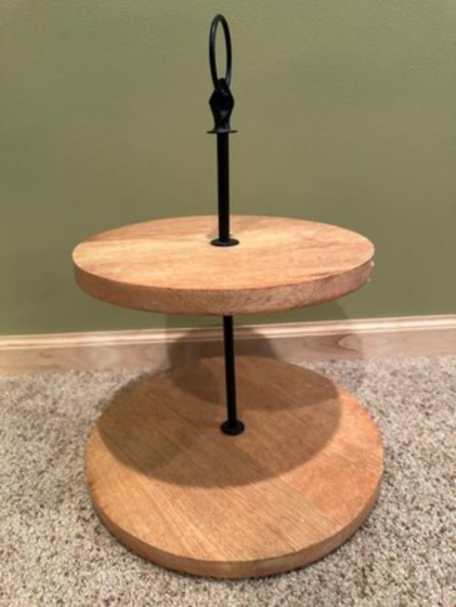 Finish Type Two tiered natural wood tray with metal rod and handle. Metal ba