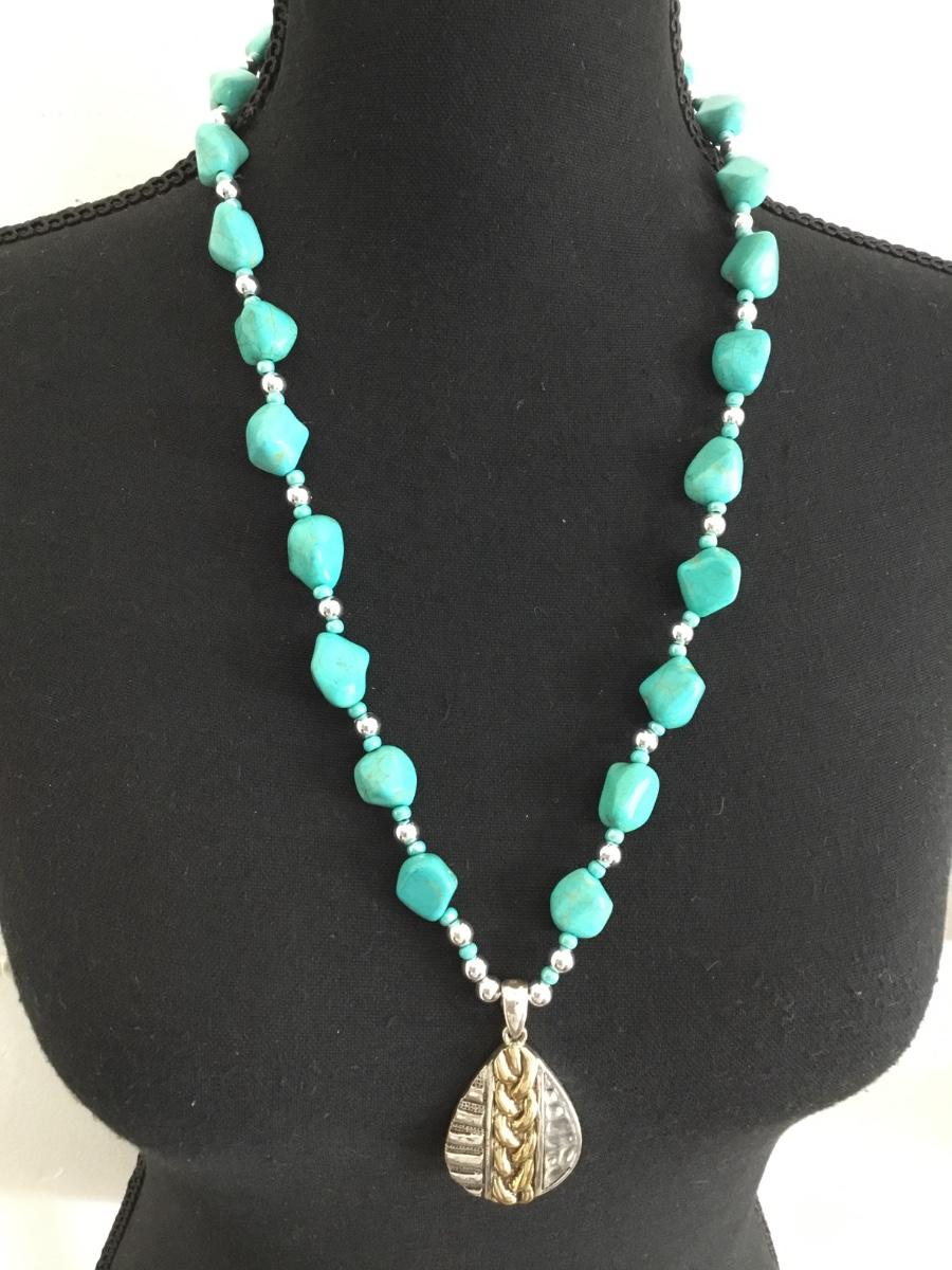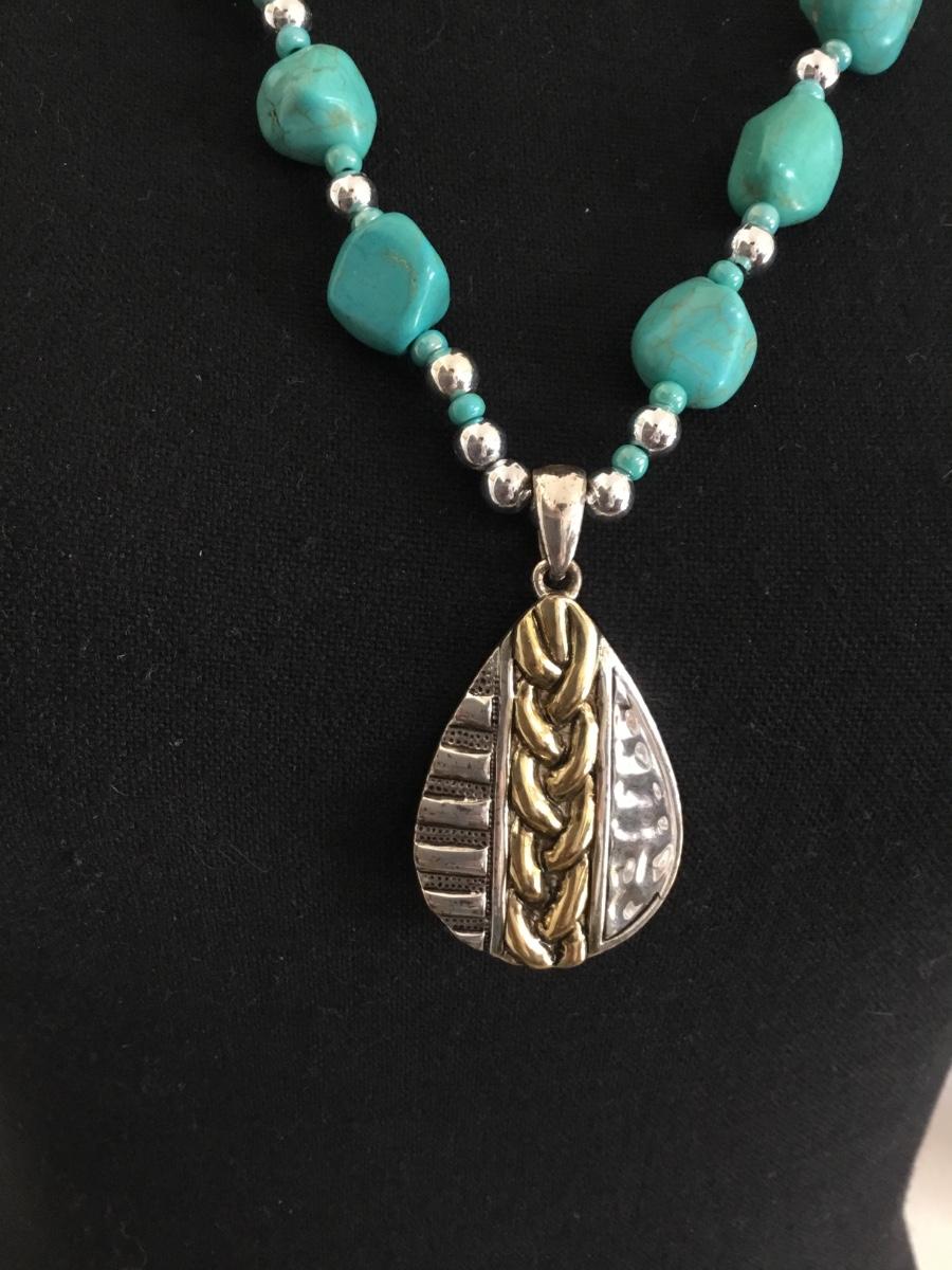 Beautiful faux turquoise stone beaded necklace with silver and gold toned pendant