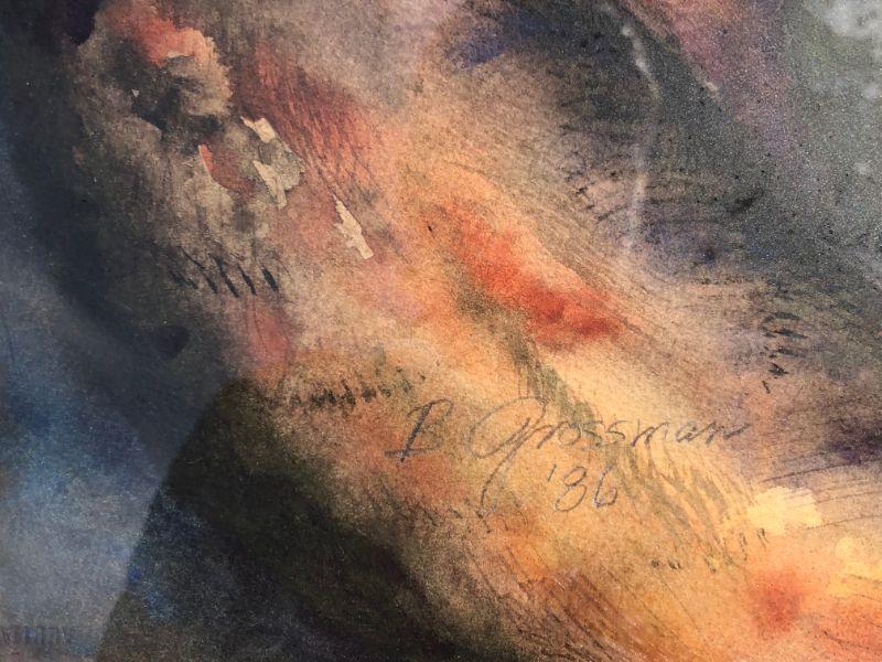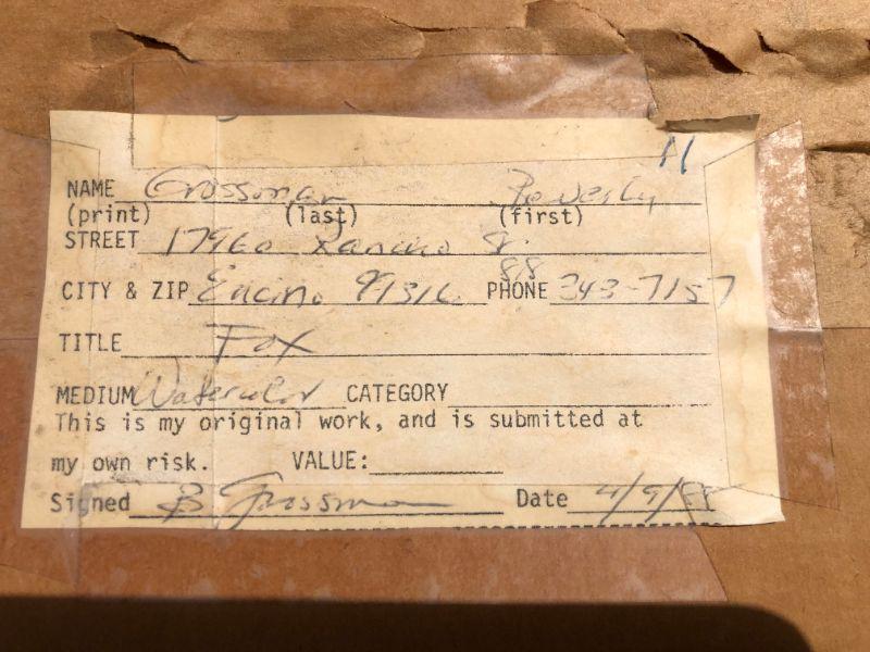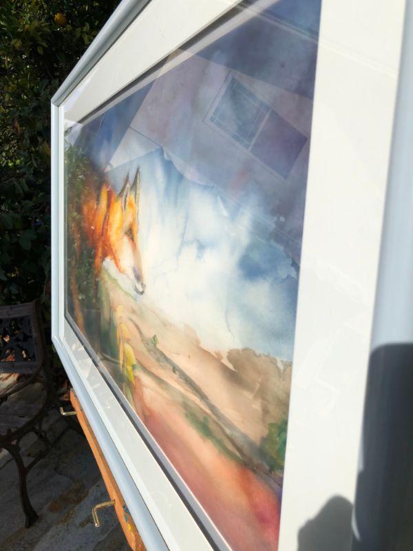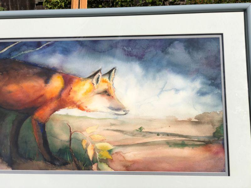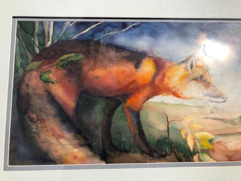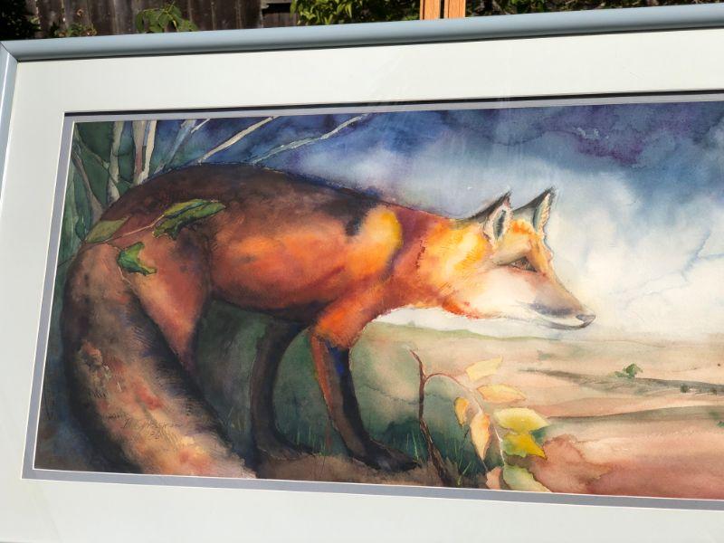 Beautiful large watercolor painting of a fox in a natural settling, signed by B. (Beverly) Grossman, 1986. In very good condition, quality framing.
