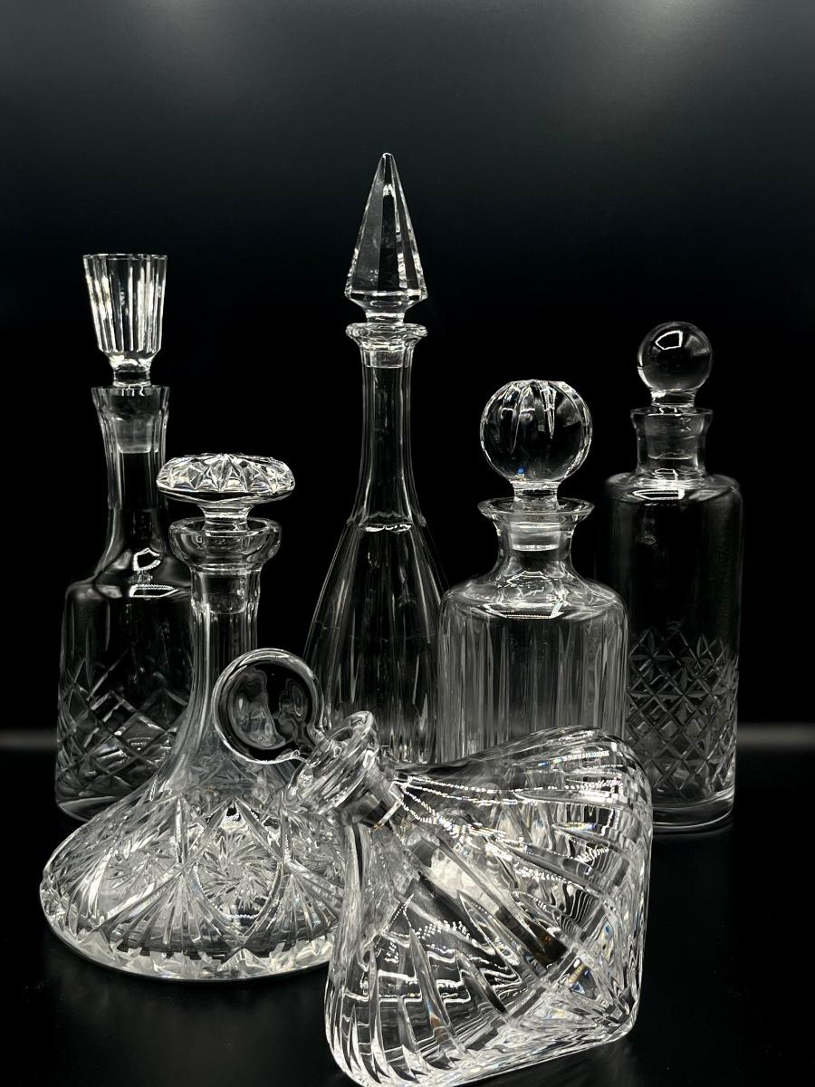 Six (6) Assorted Beautiful Glass & Crystal Decanters With Glass Stoppers