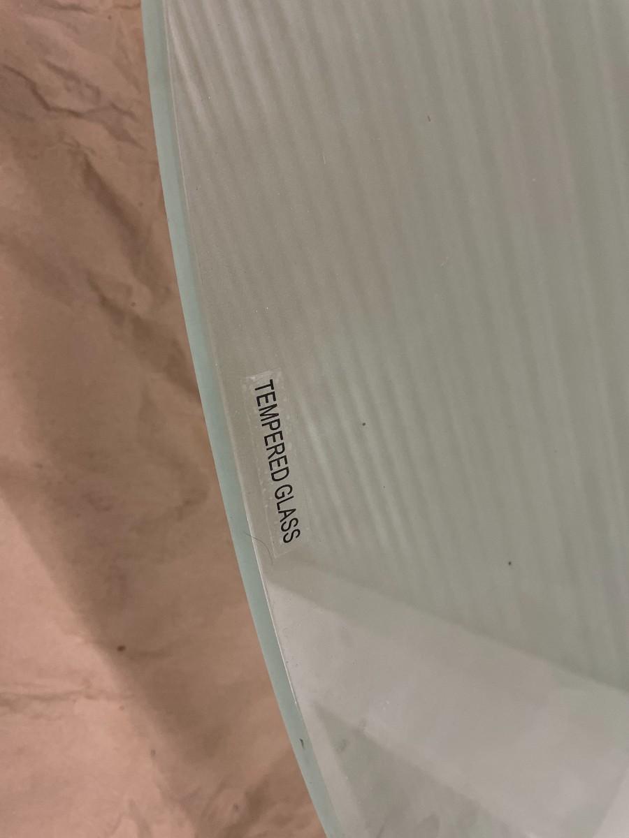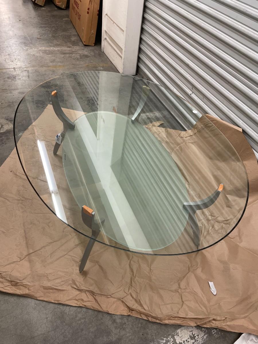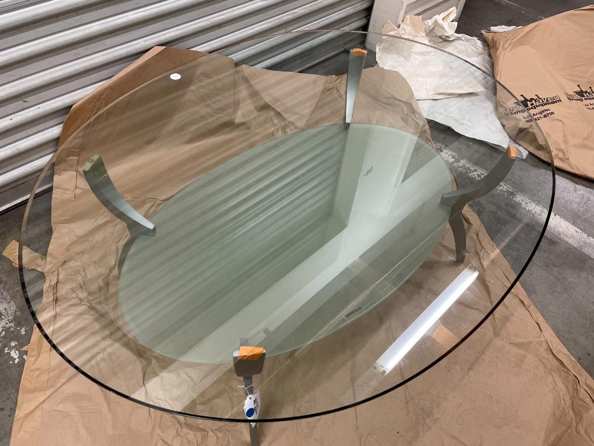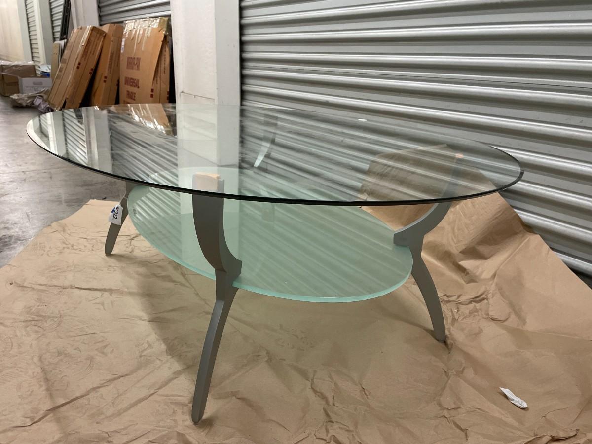 48" Oval, tempered glass top, lower glass shelf, metal base. Very elegant, excellent condition. Matches lot 223