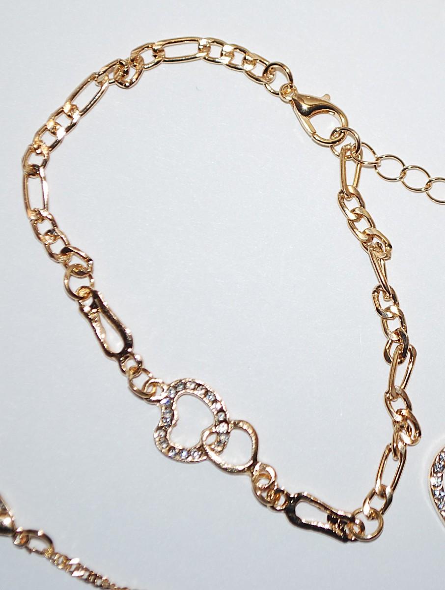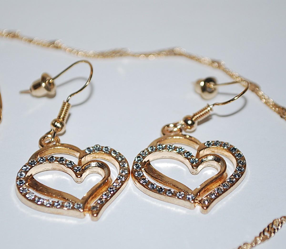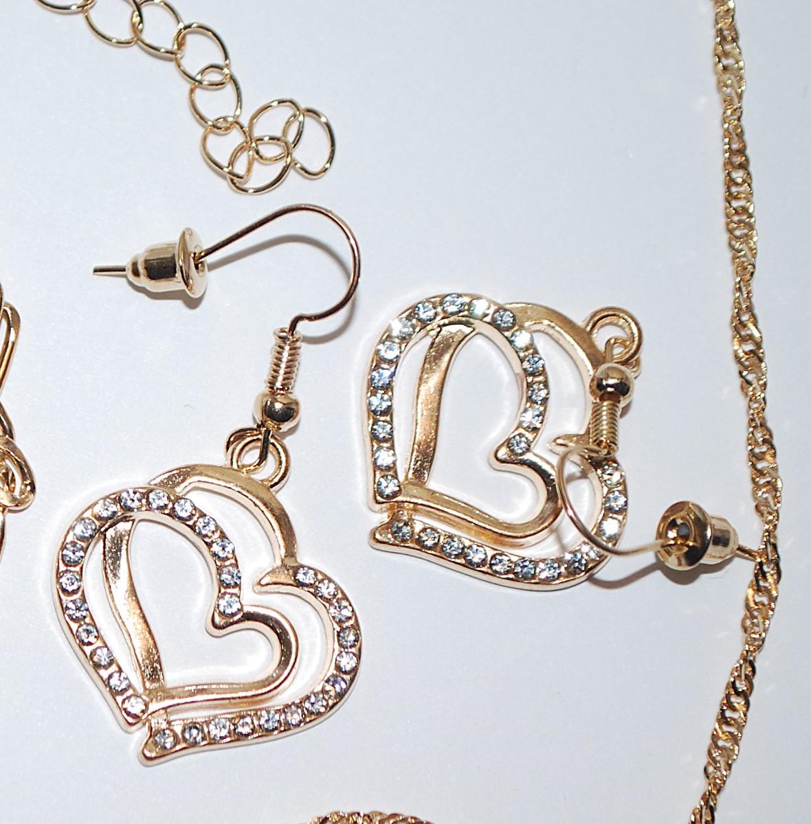 Beautiful Gold Colored Bejeweled "DOUBLE HEARTS NECKLACE (1½" Across+ 17" L) JEWELRY SET with Matching BRACELET (2¾" Opening) & Matching EARRINGS with Wire Hook Clasp