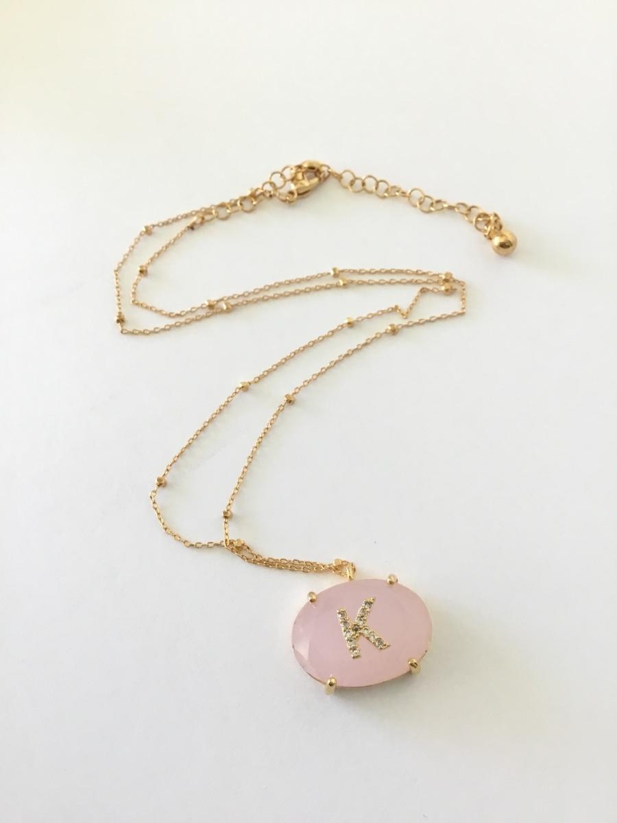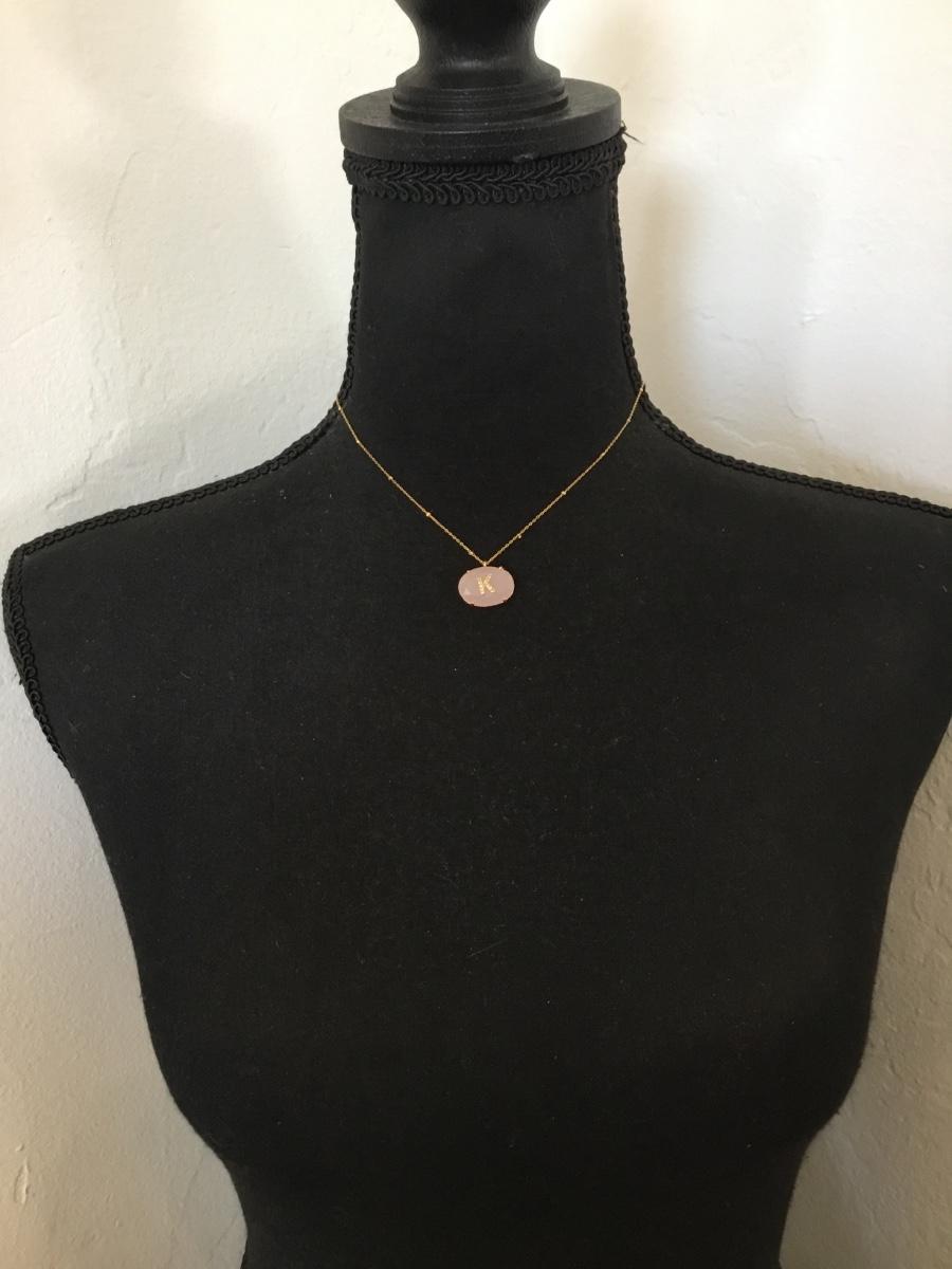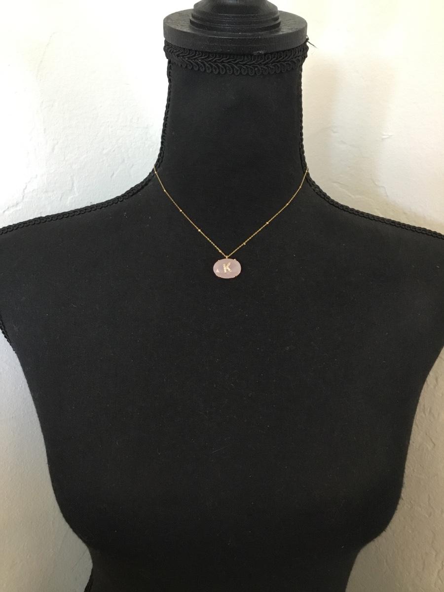 Beautiful, gold tone, rose, quartz, crystal, crystal, rhinestone, initial, K dainty necklace. Very nice quality.
