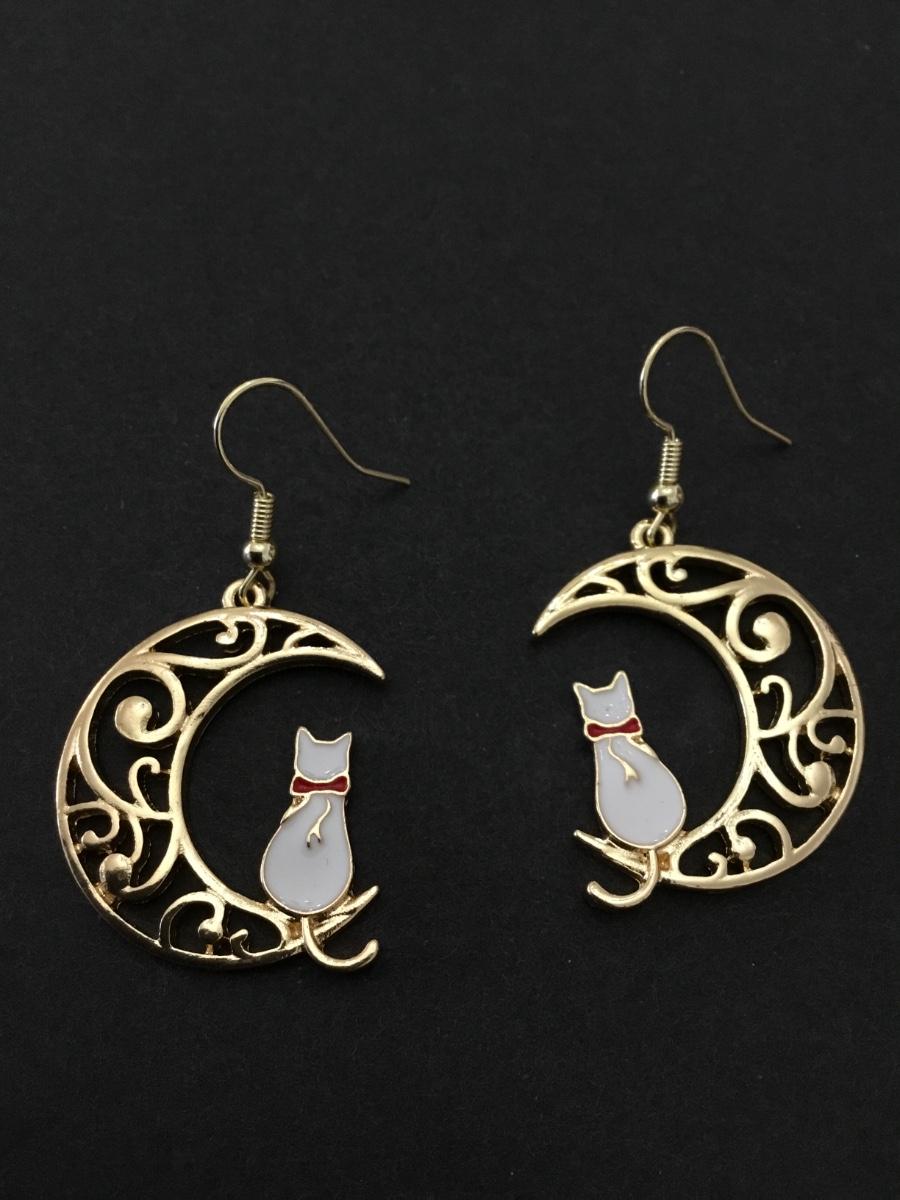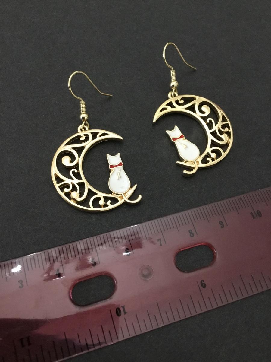 Beautiful, gold, toned, white enamel, cat crescent, moon earrings