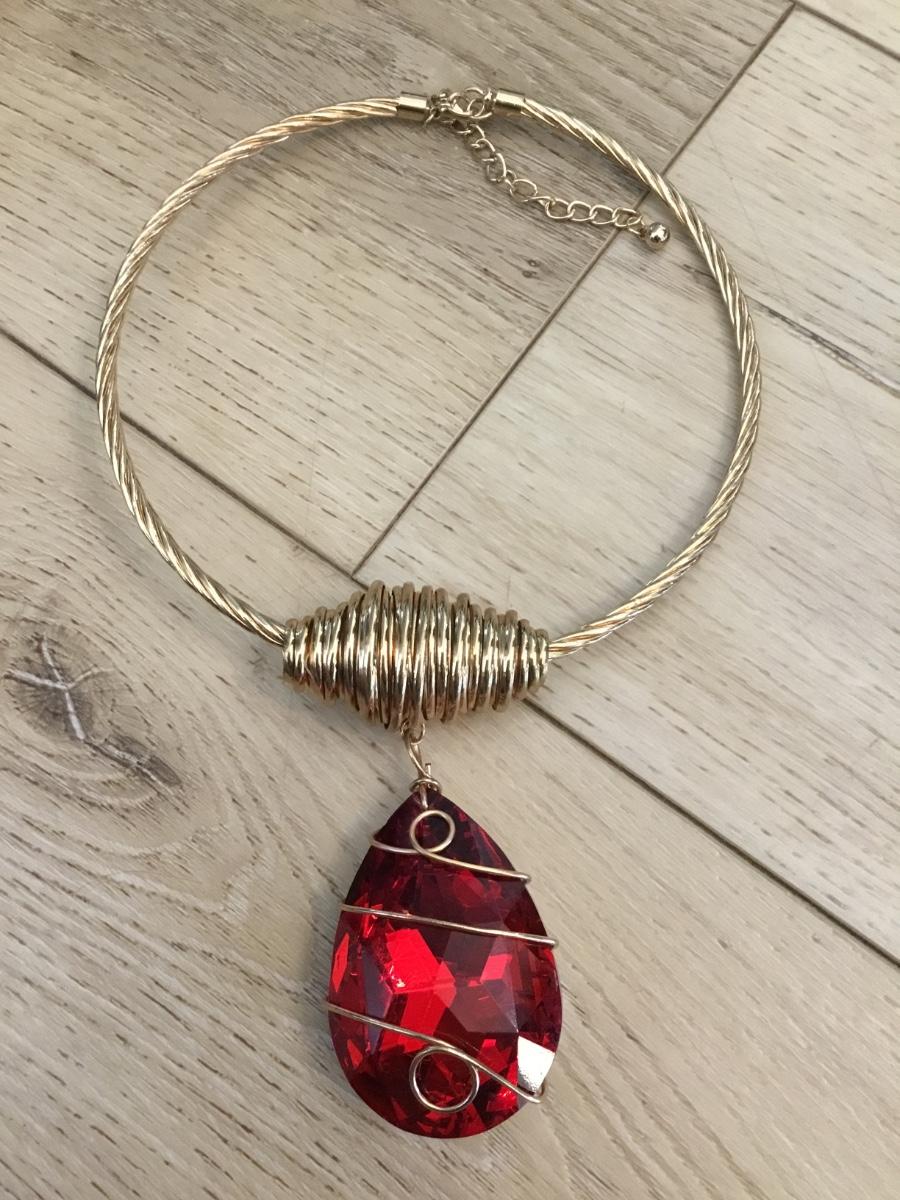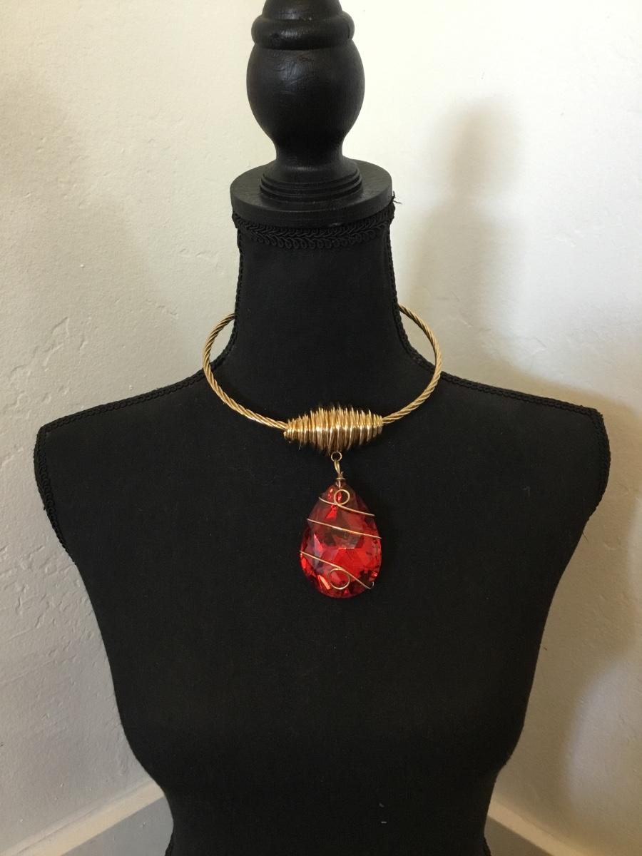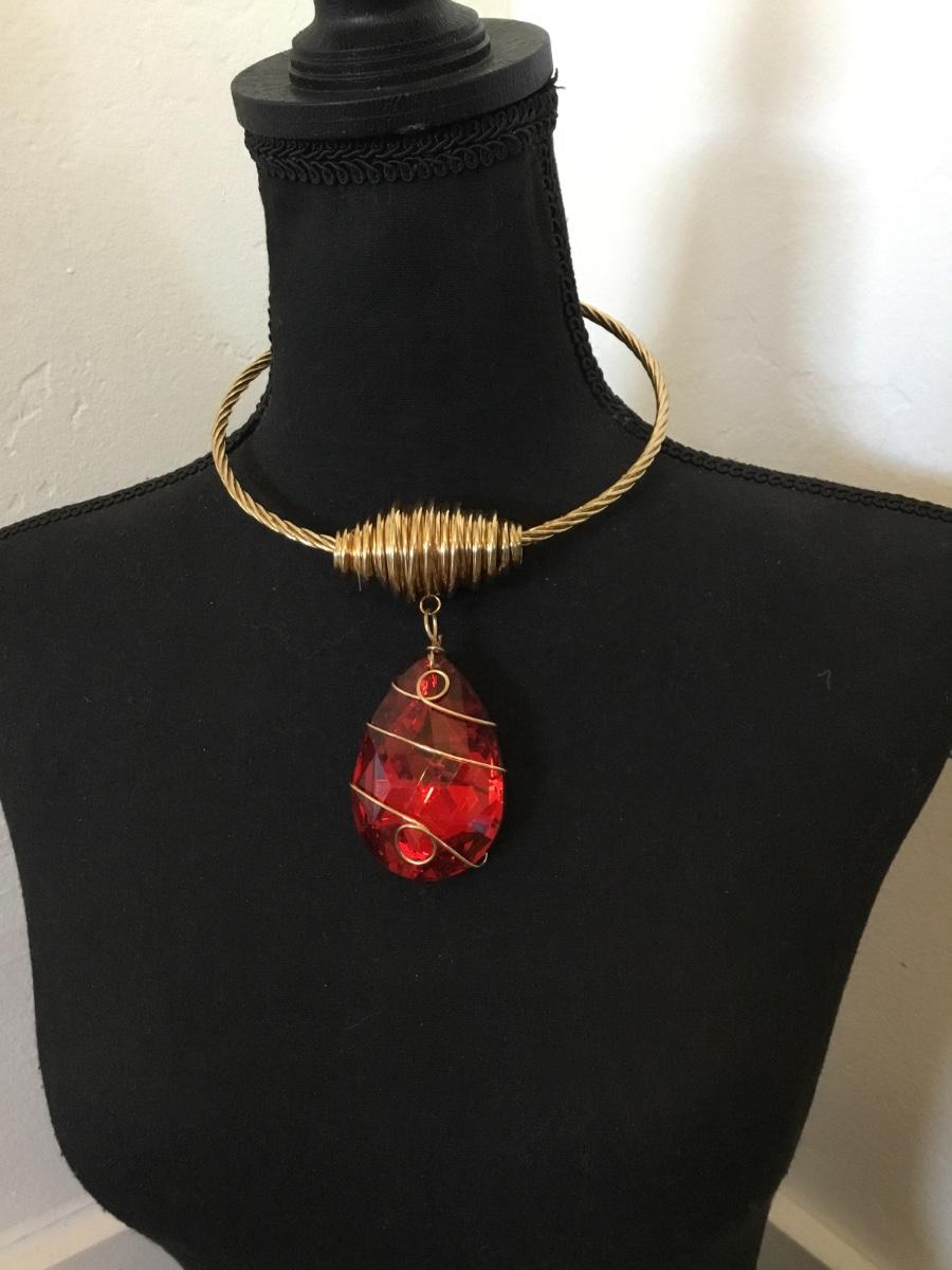 Beautiful, gold, toned wire, wrap, color statement, necklace, chunky red, crystal pendant