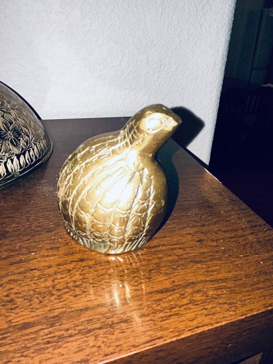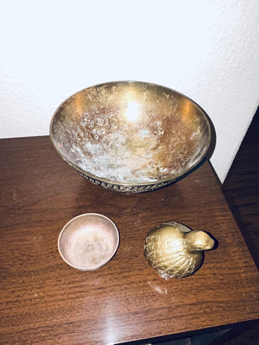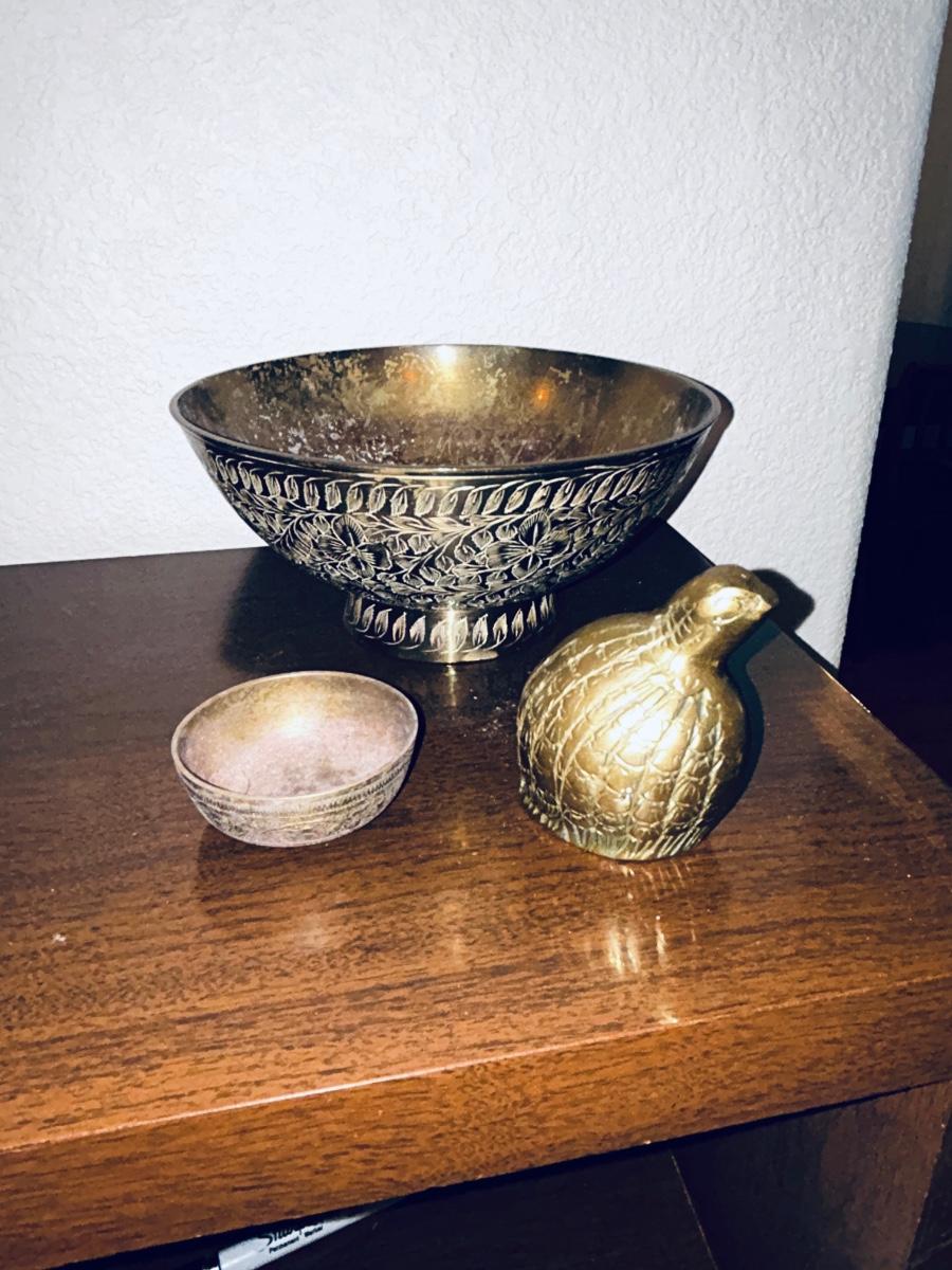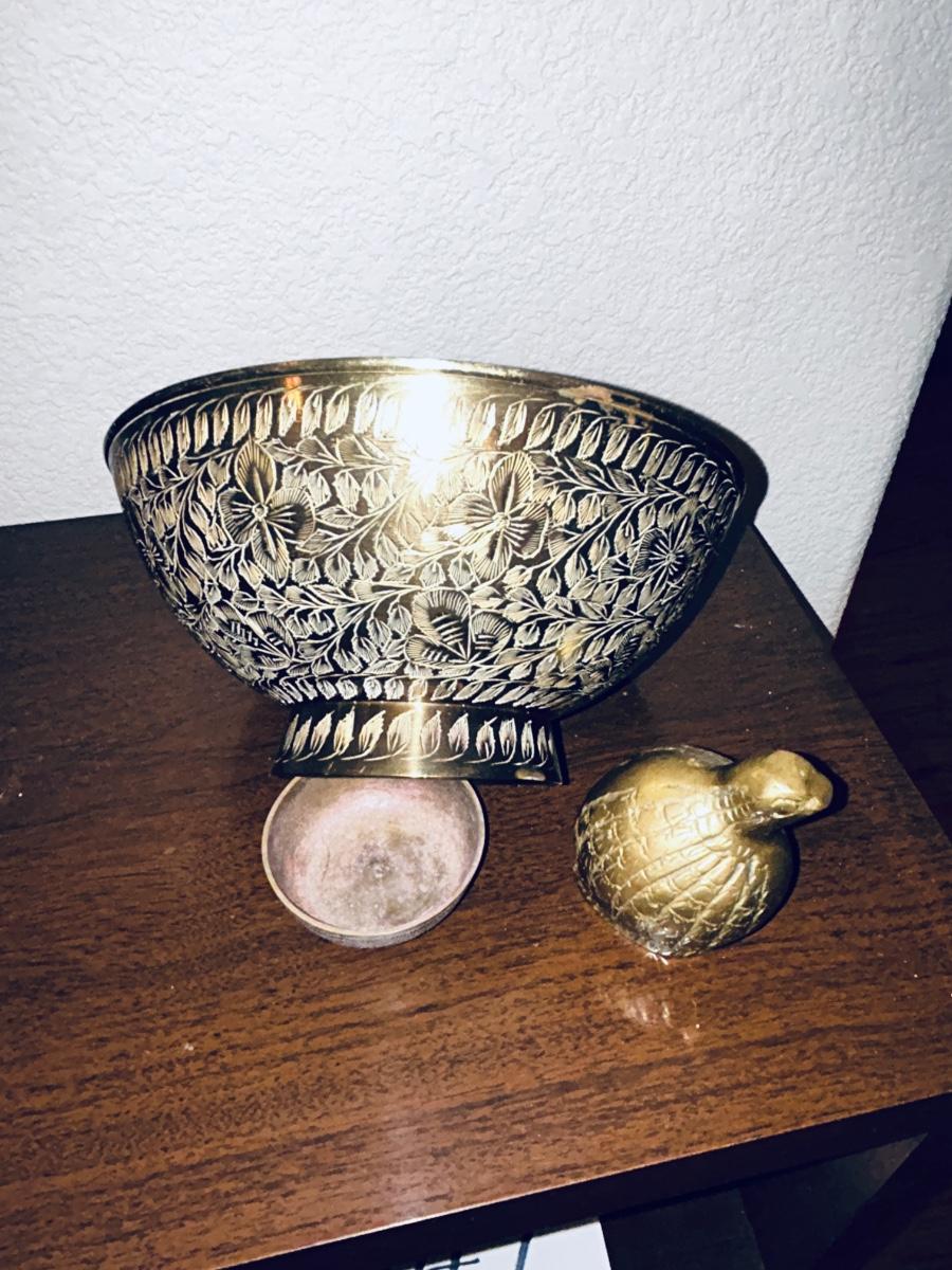 BEAUTIFUL HAND ETCHED ART BRASS BOWL, BRASS QUAIL AND SMALL DISH