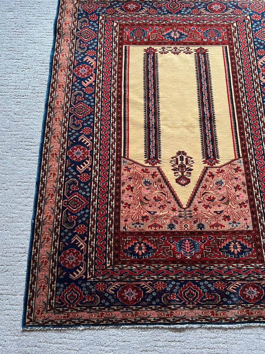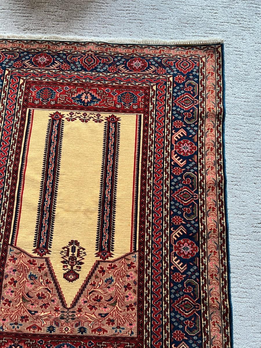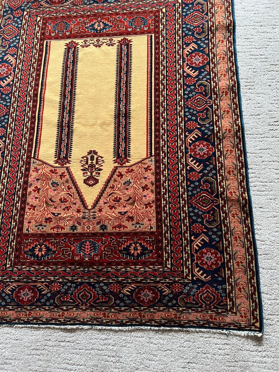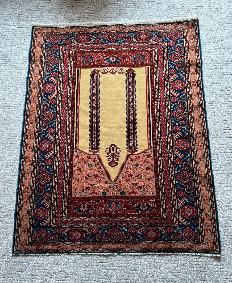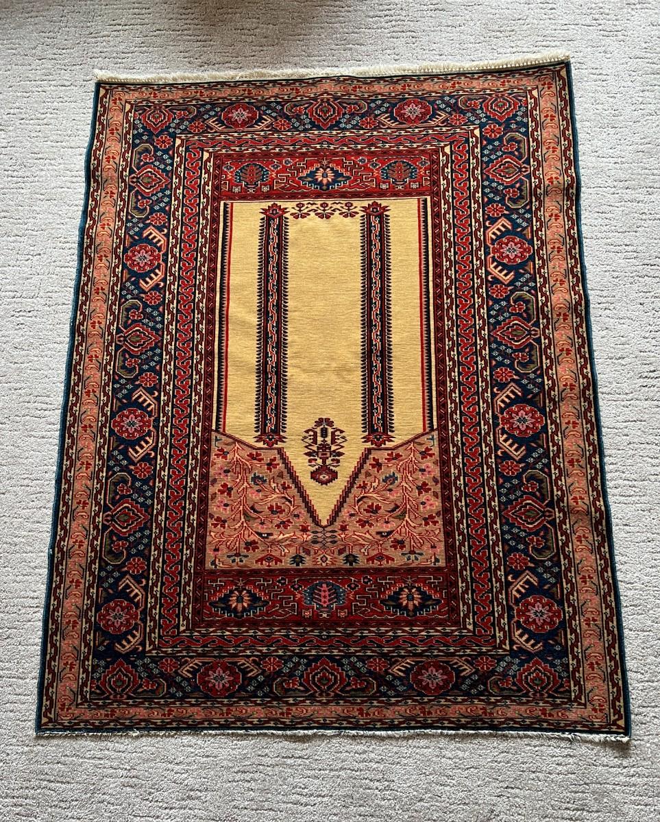 Beautiful handmade prayer rug from Pakistan. The intricate design of the rug has a bright tan center with some floral and other details, with a deep burgundy red and blue design around the sides. In very good condition, as shown.
