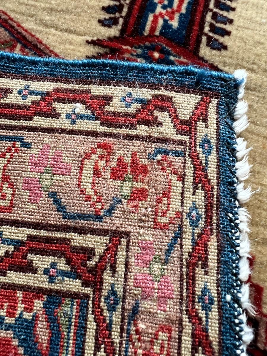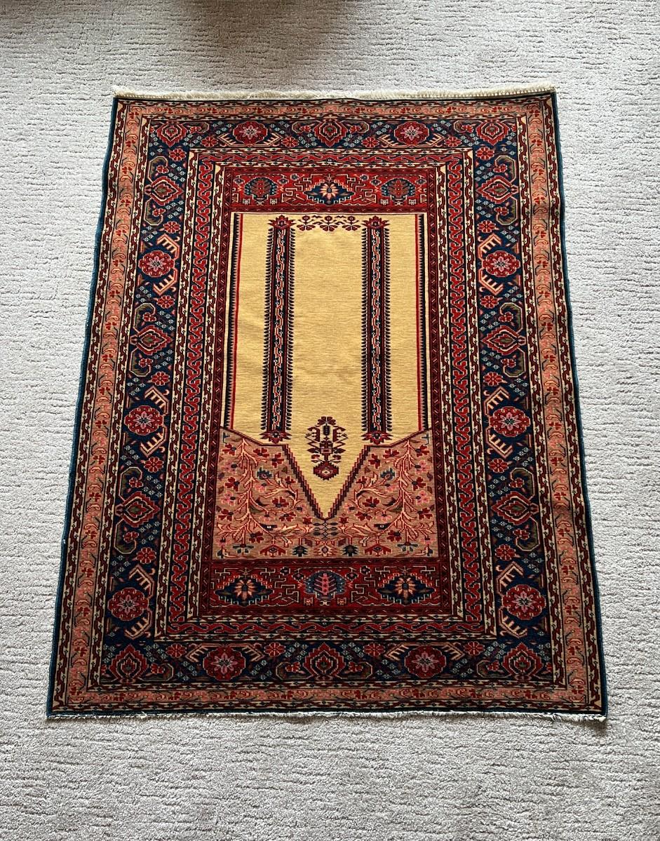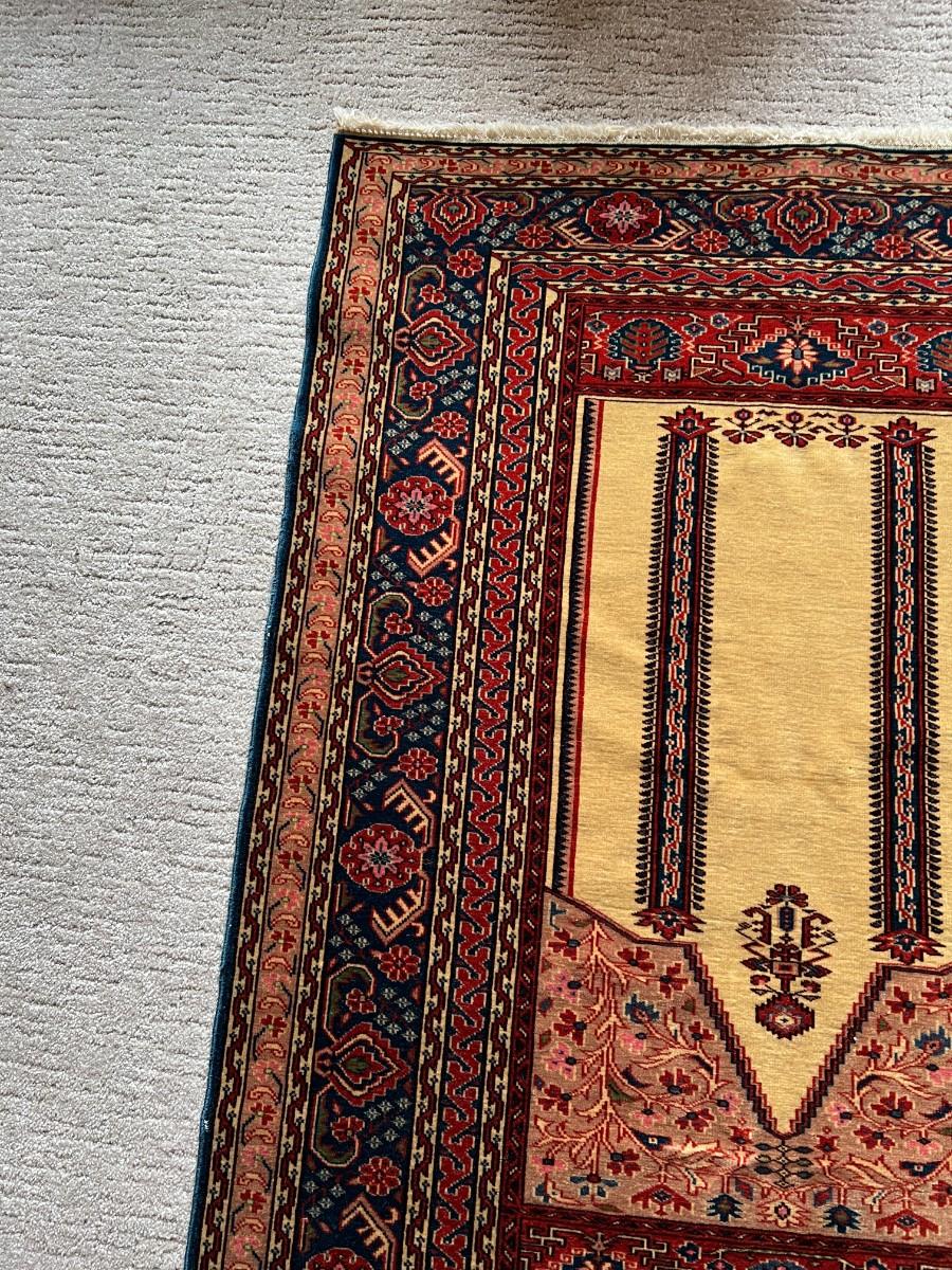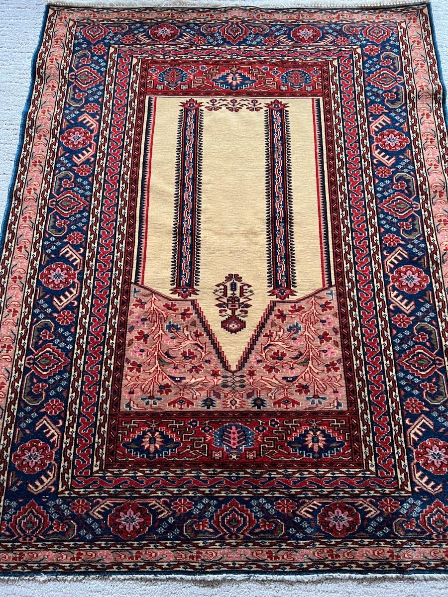 Beautiful handmade prayer rug from Pakistan. The intricate design of the rug has a bright tan center with some floral and other details, with a deep burgundy red and blue design around the sides. In very good condition, as shown.