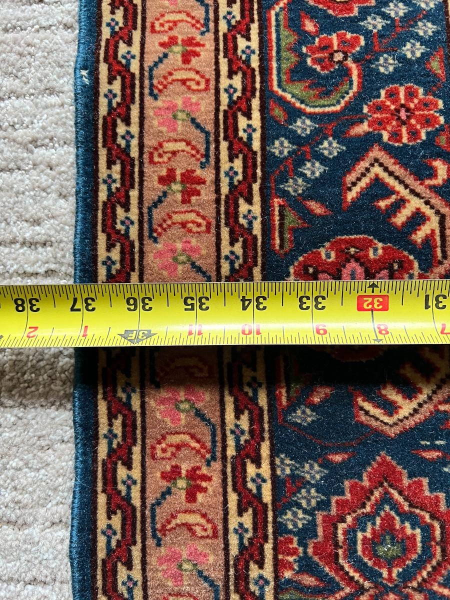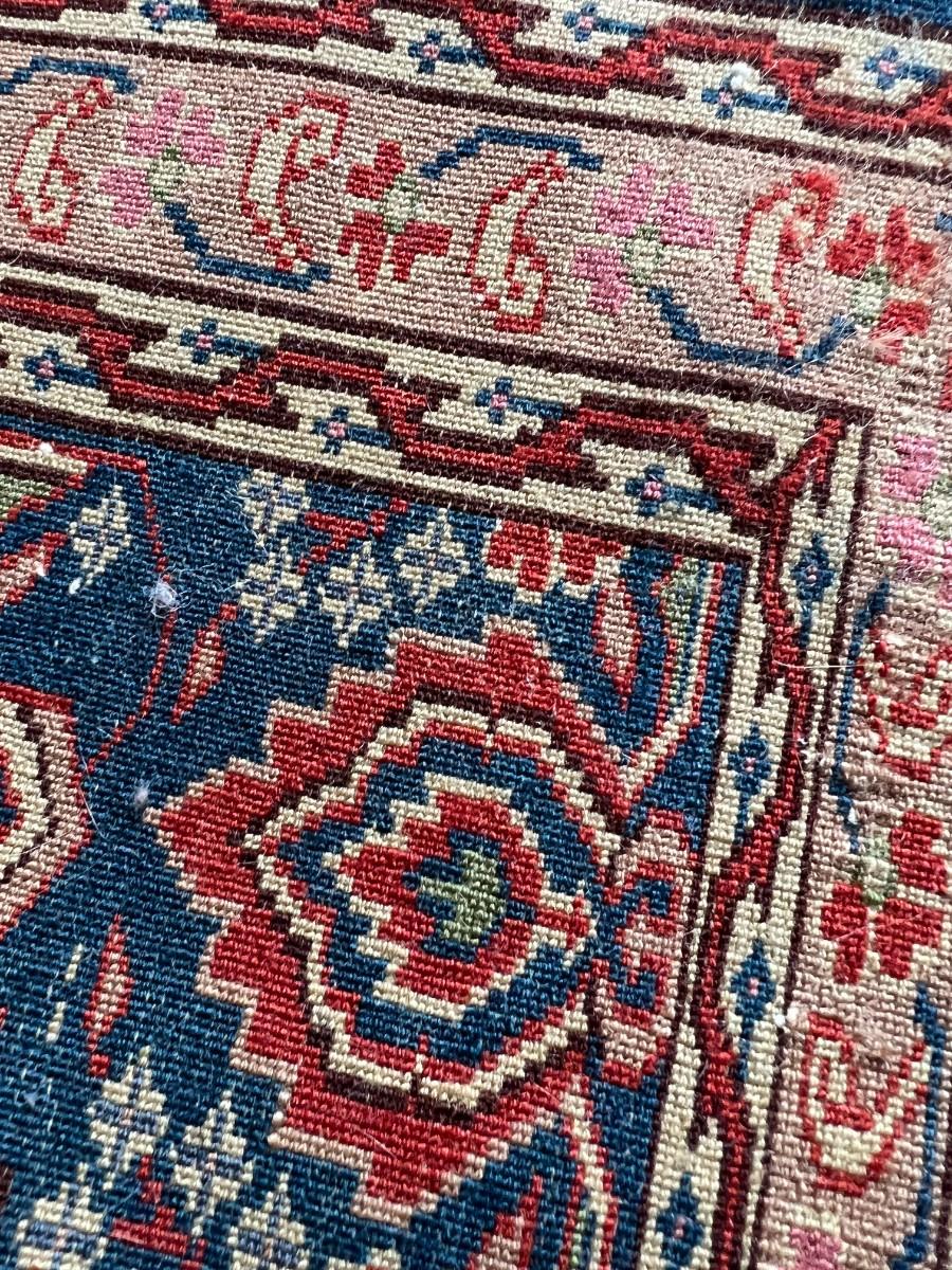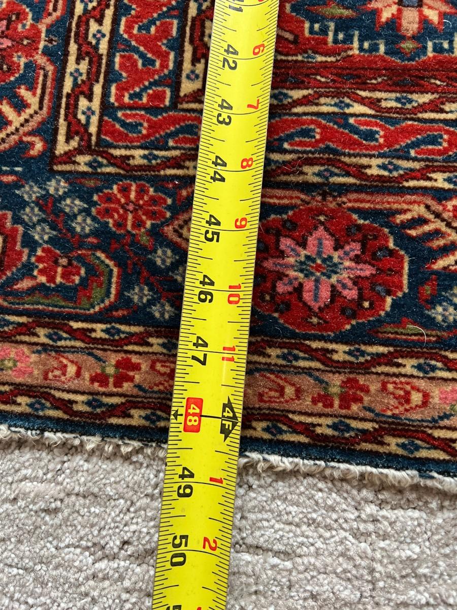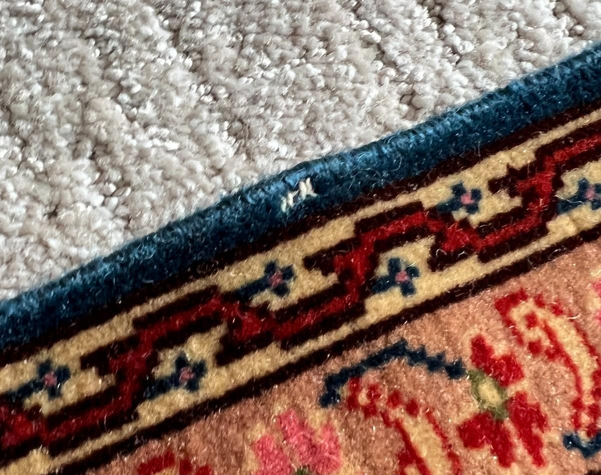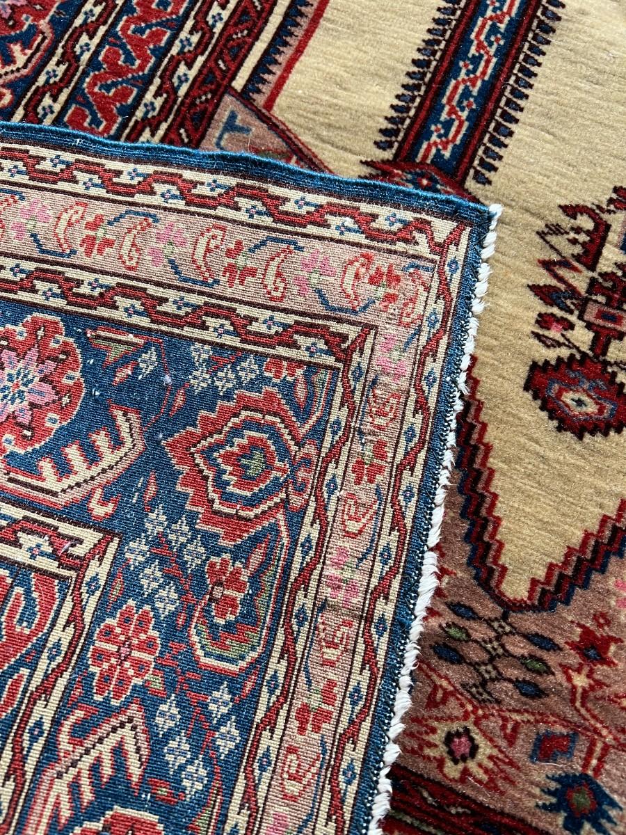 Beautiful handmade prayer rug from Pakistan. The intricate design of the rug has a bright tan center with some floral and other details, with a deep burgundy red and blue design around the sides. In very good condition, as shown.