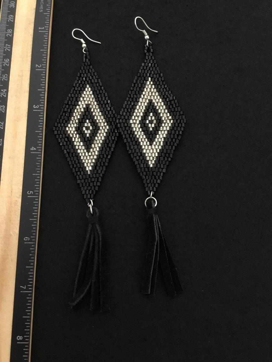 Beautiful handcrafted, glass seed, bead diamond shaped earrings with black suede tassel