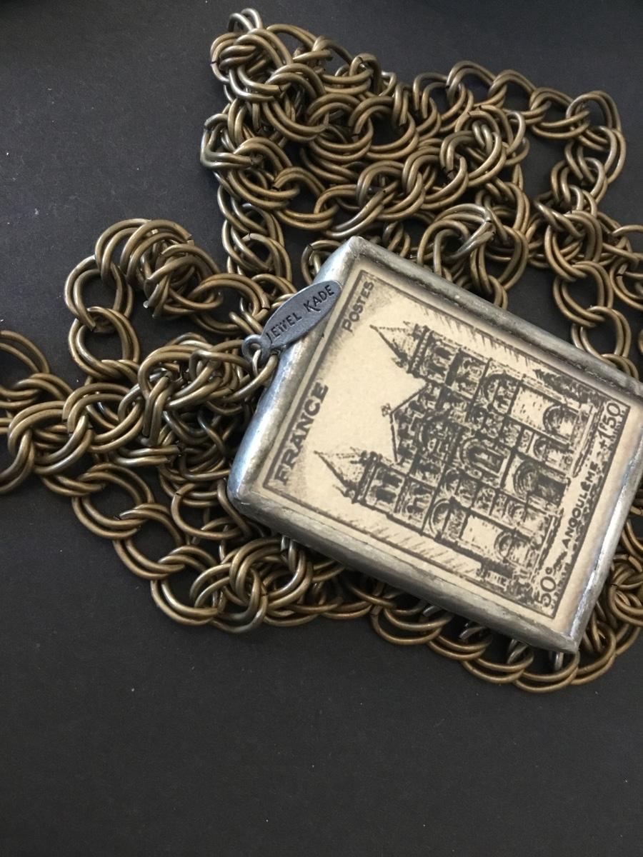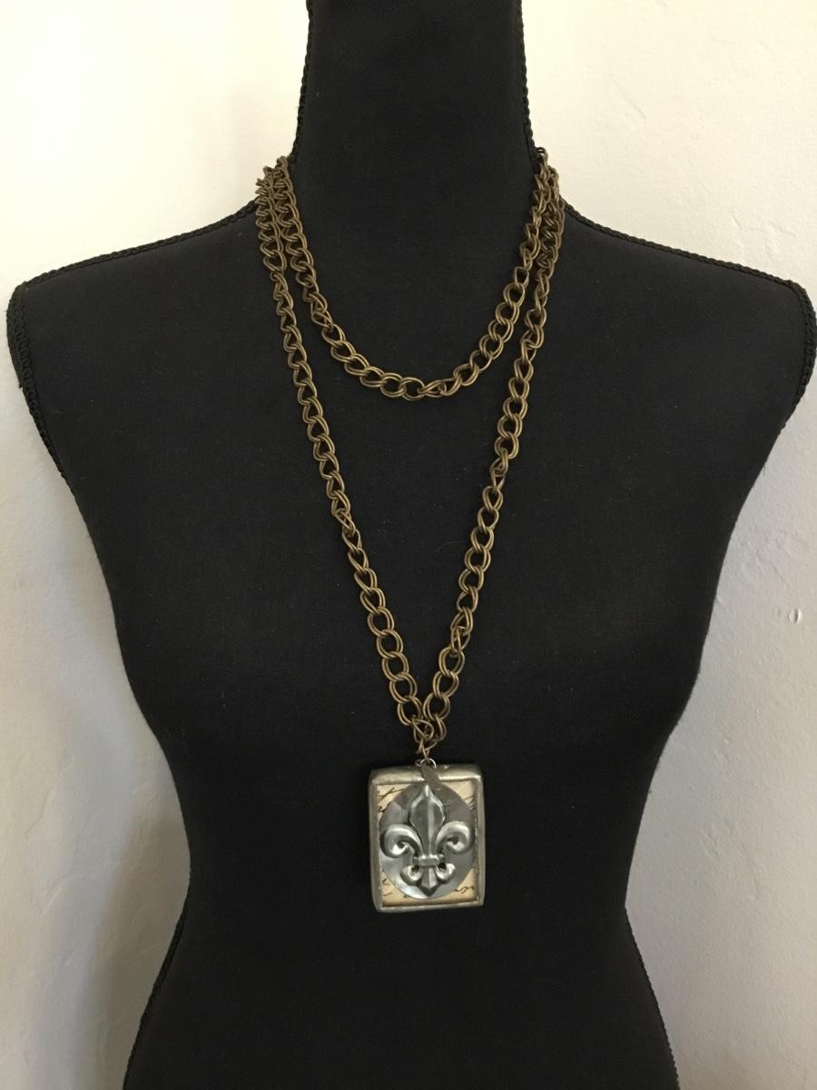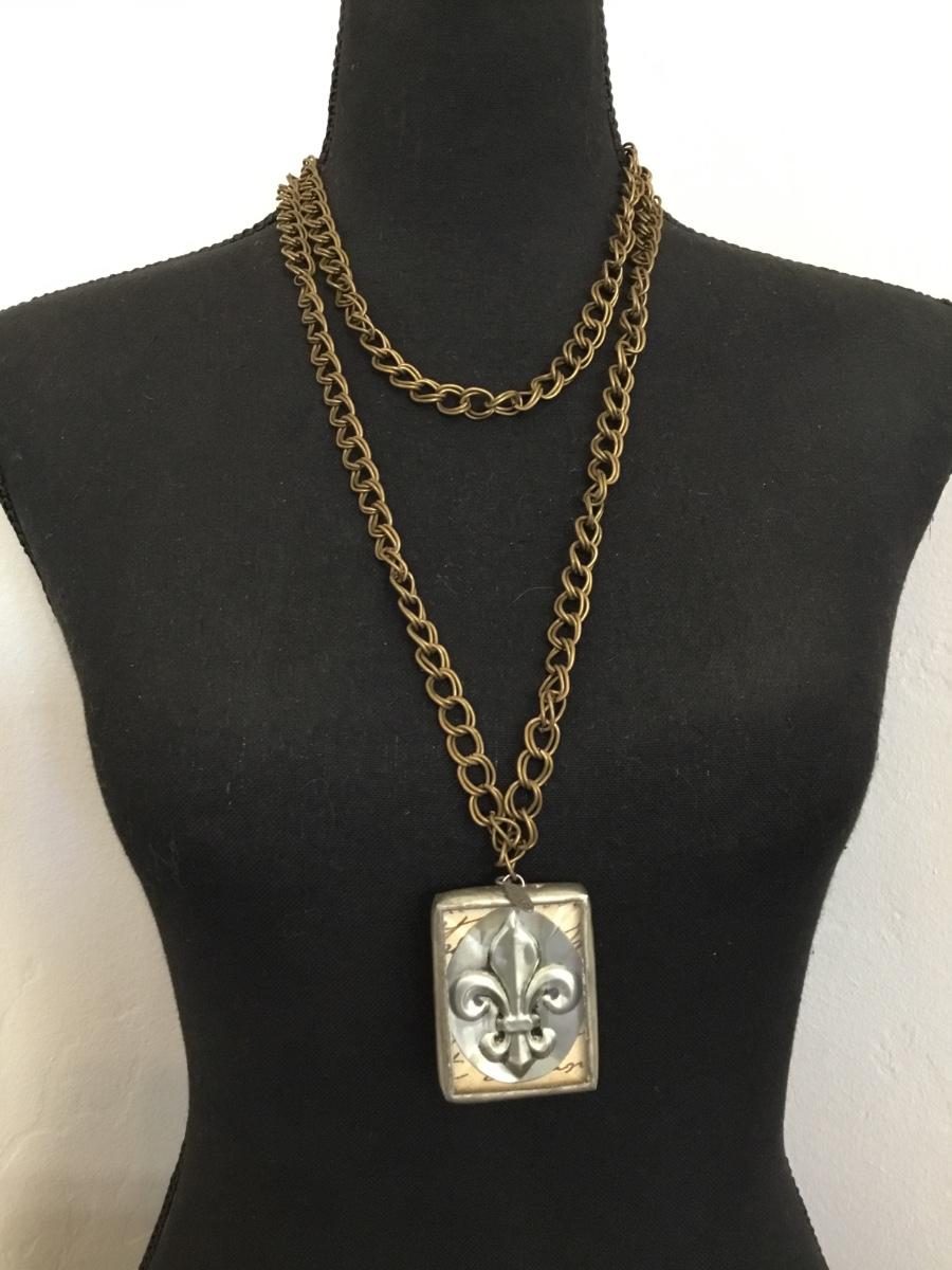 Beautiful handcrafted Jewel, kade Fleur de Lis pendant reversible very nice bronze, toned, chain, long necklace