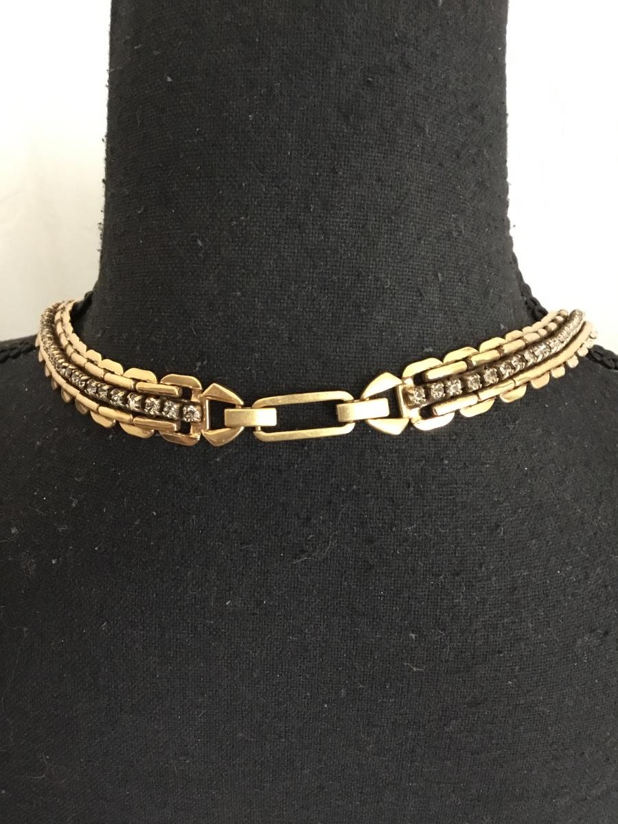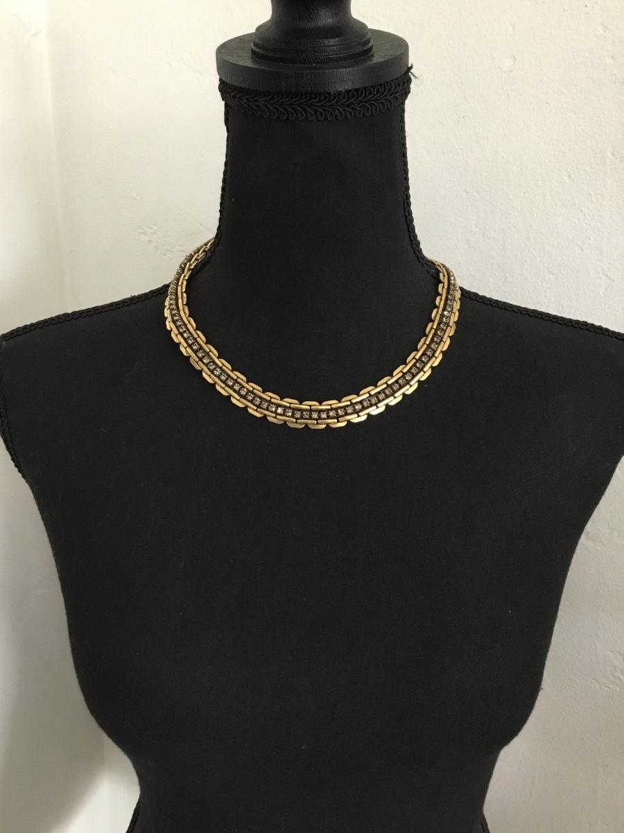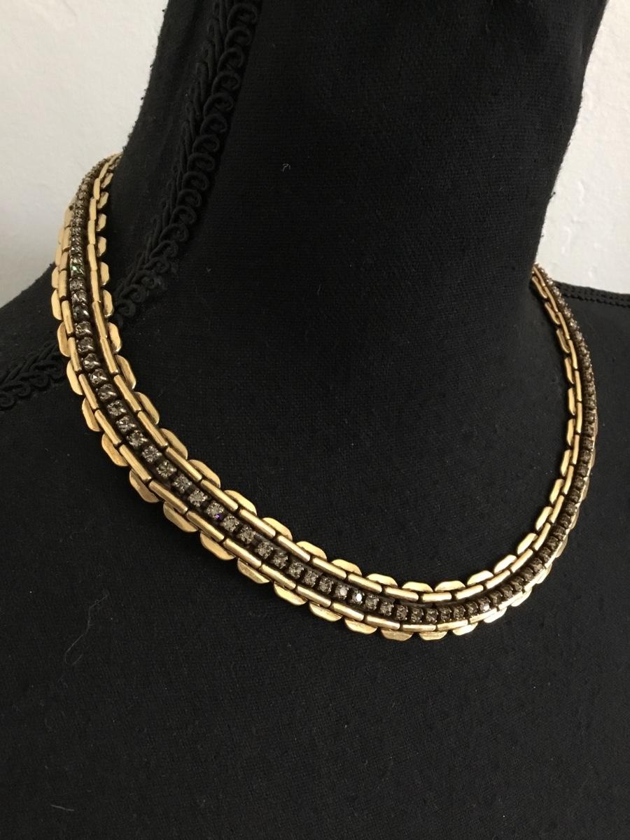 Beautiful, heavy metal, gold tone, gray rhinestone collar statement, necklace