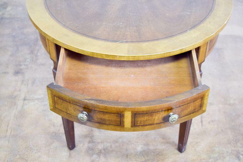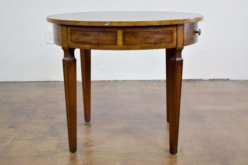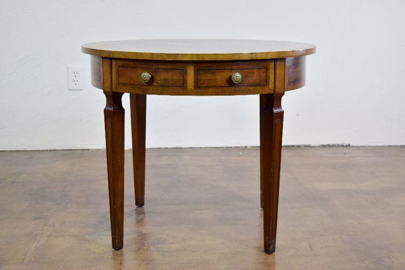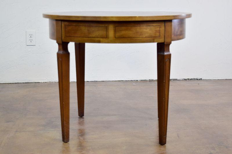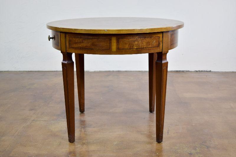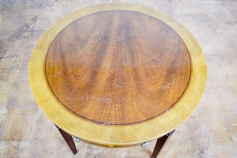 The table has some scratches on it from general display and usage, with some scratching and small nicks on the piece. The item measures approximately 28" in diameter X 23" tall.