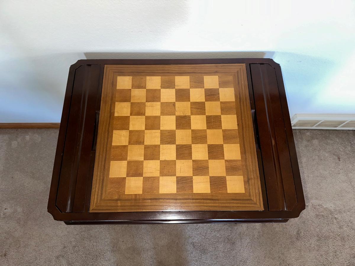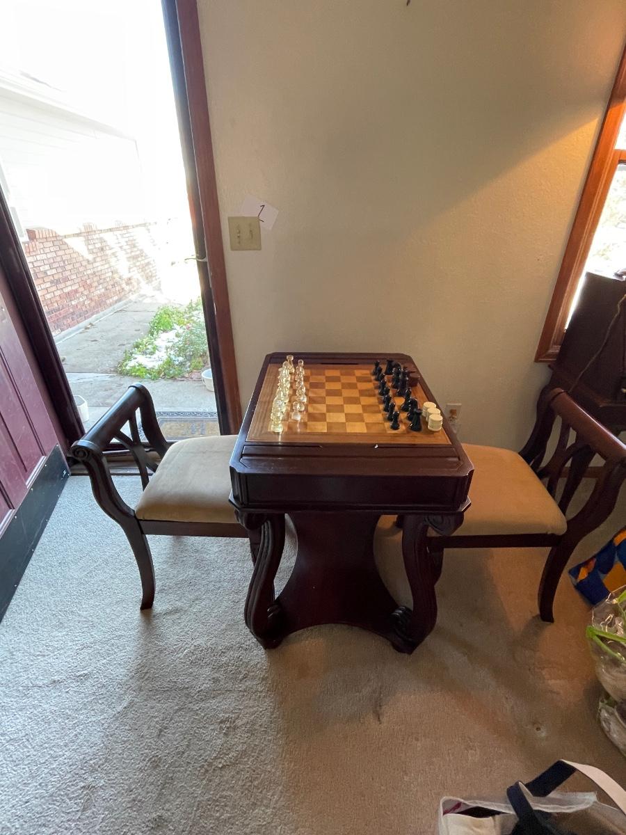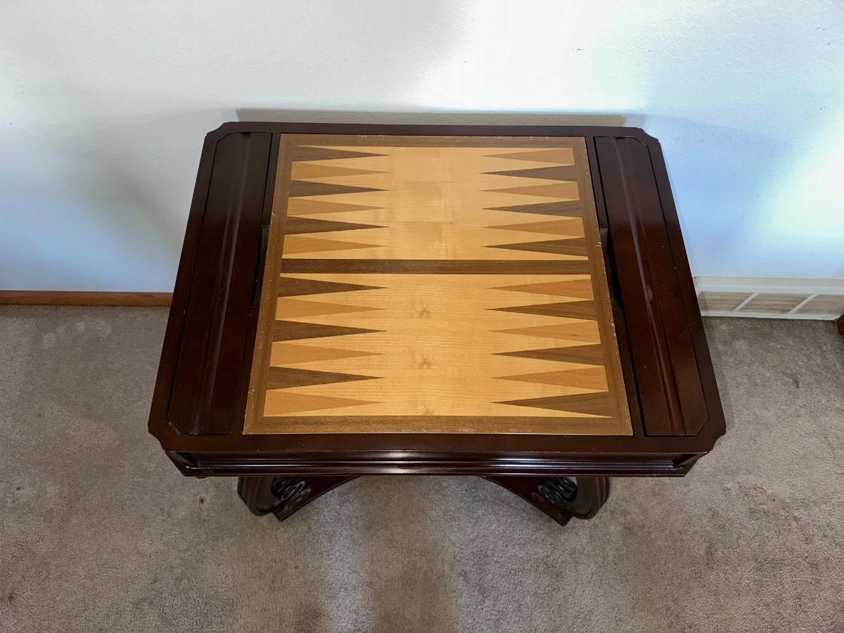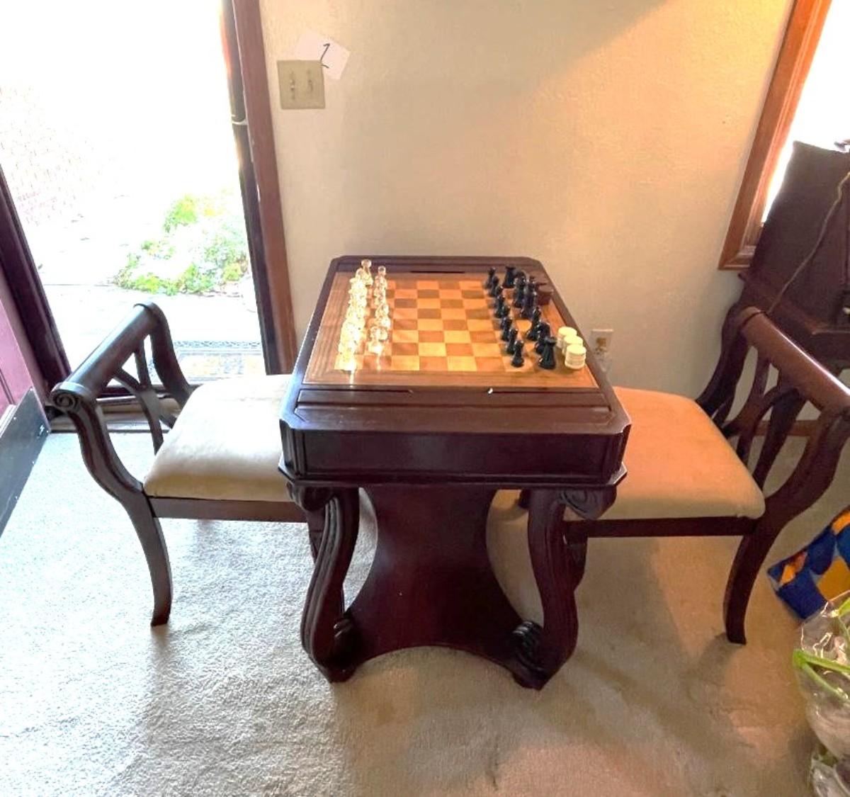 BEAUTIFUL INLAID WOODEN GAME TABLE WITH 2 CHAIRS