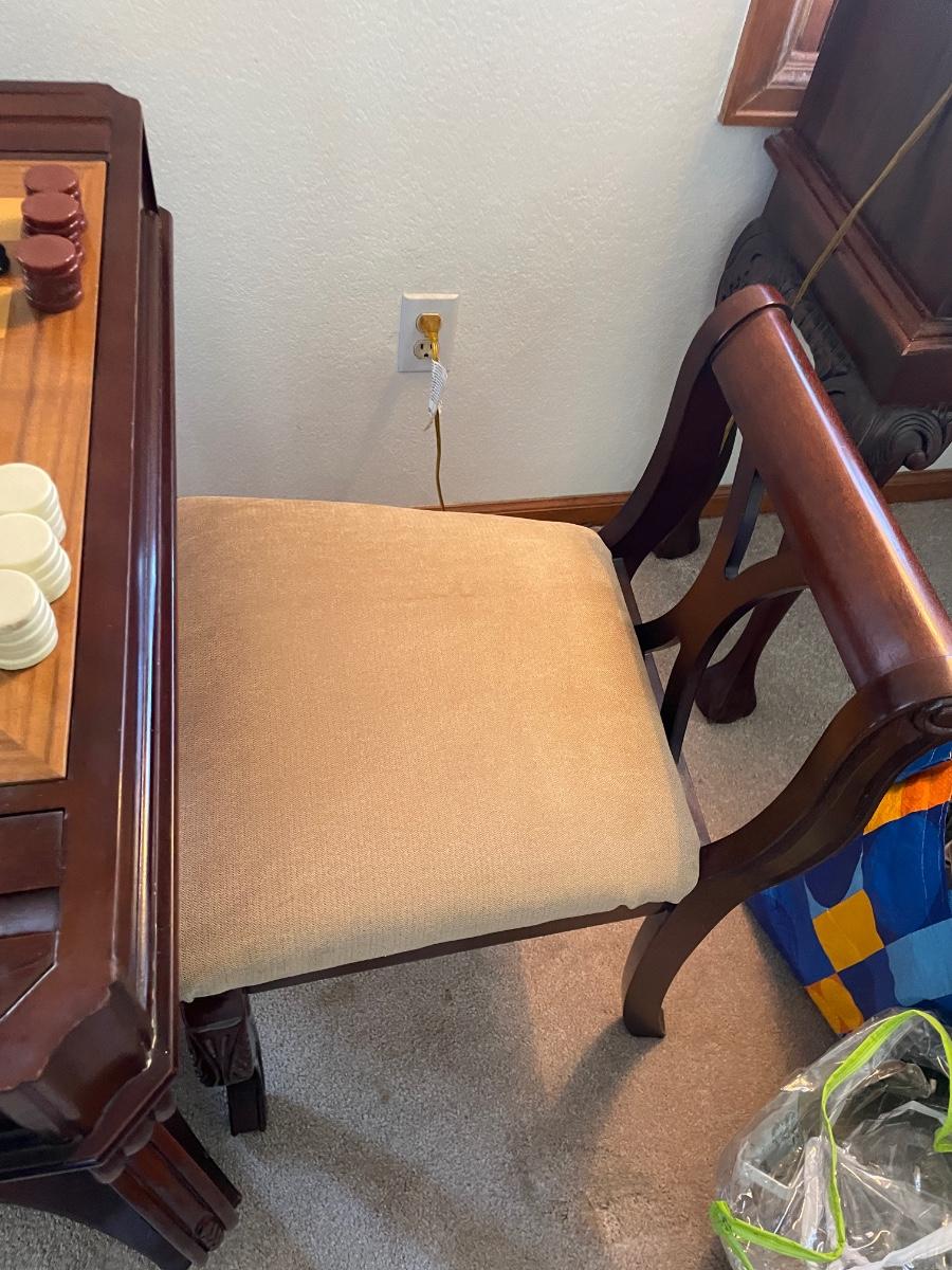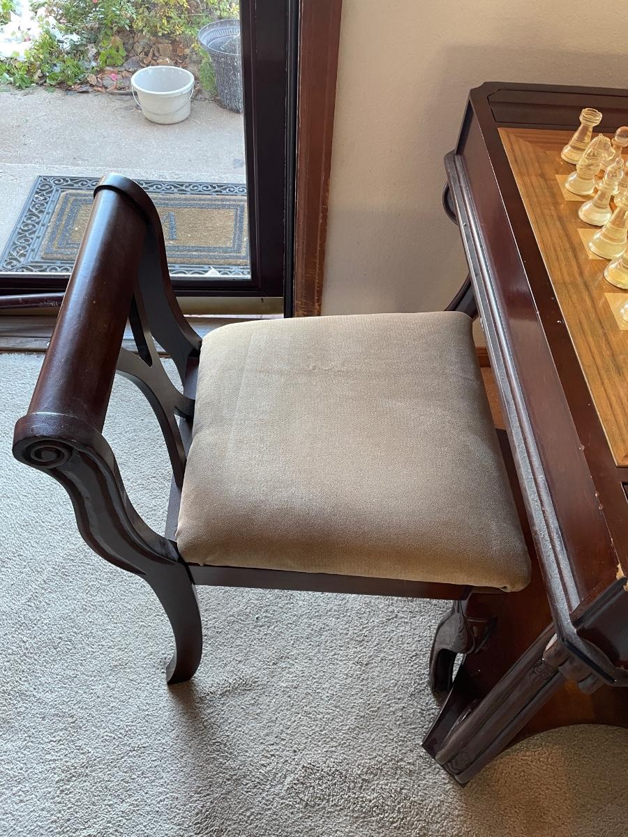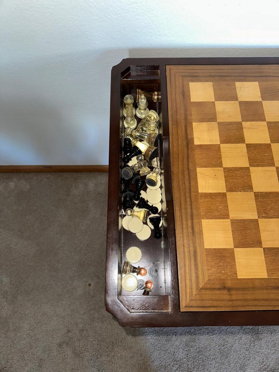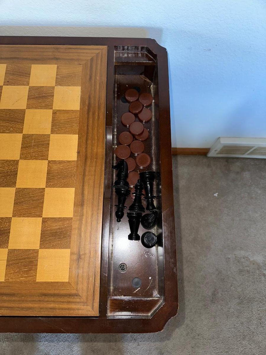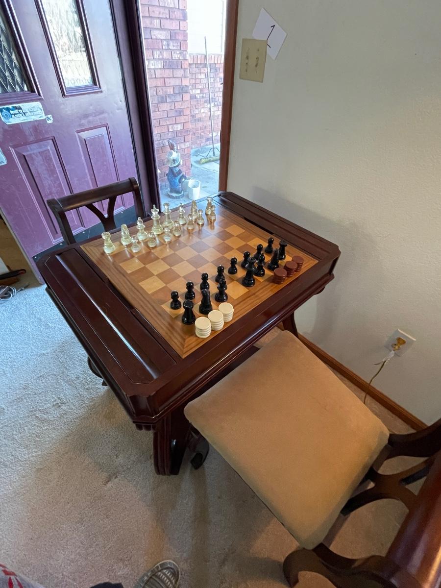 BEAUTIFUL INLAID WOODEN GAME TABLE WITH 2 CHAIRS