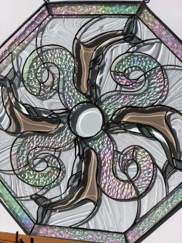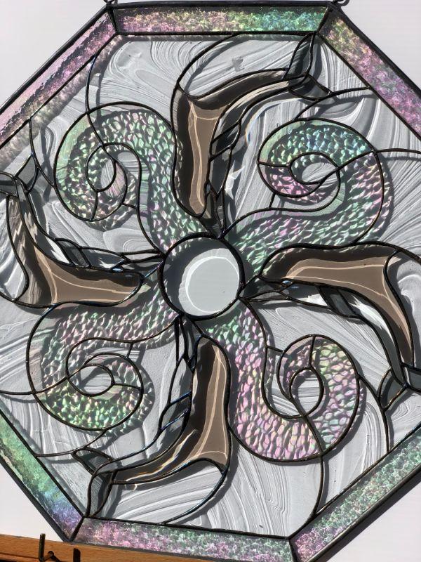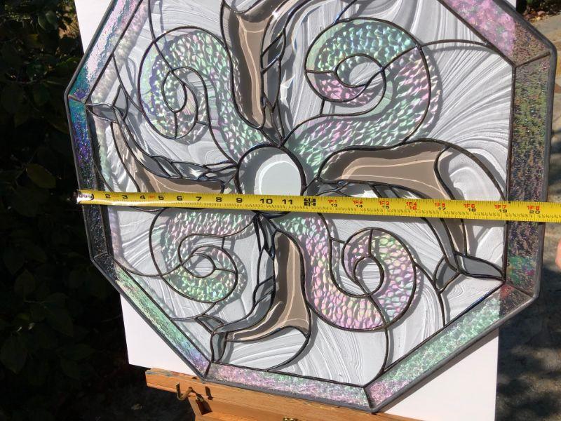 Beautiful iridescent glass depicts dolphins swimming around a central circle, and framed by an octagon shape. In very good condition.