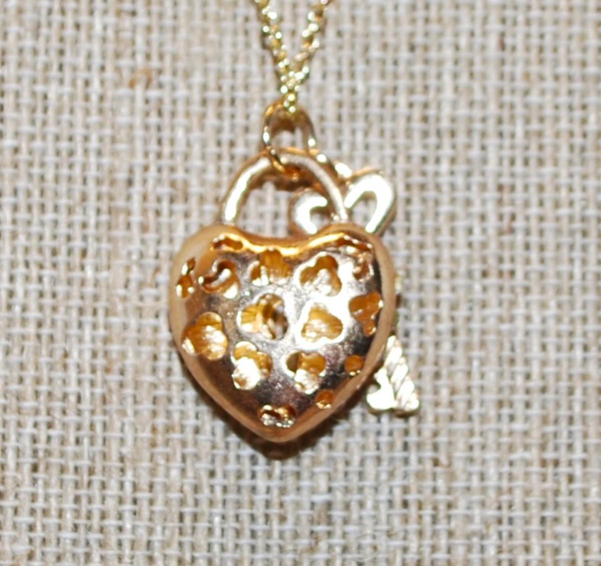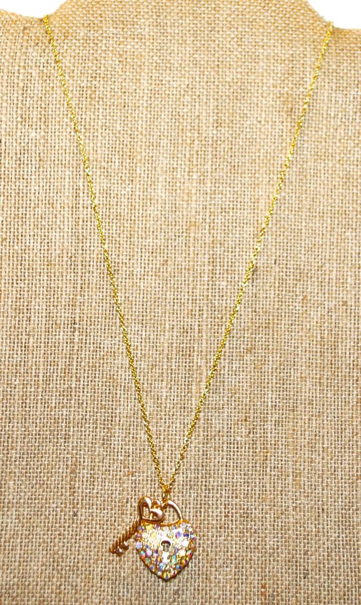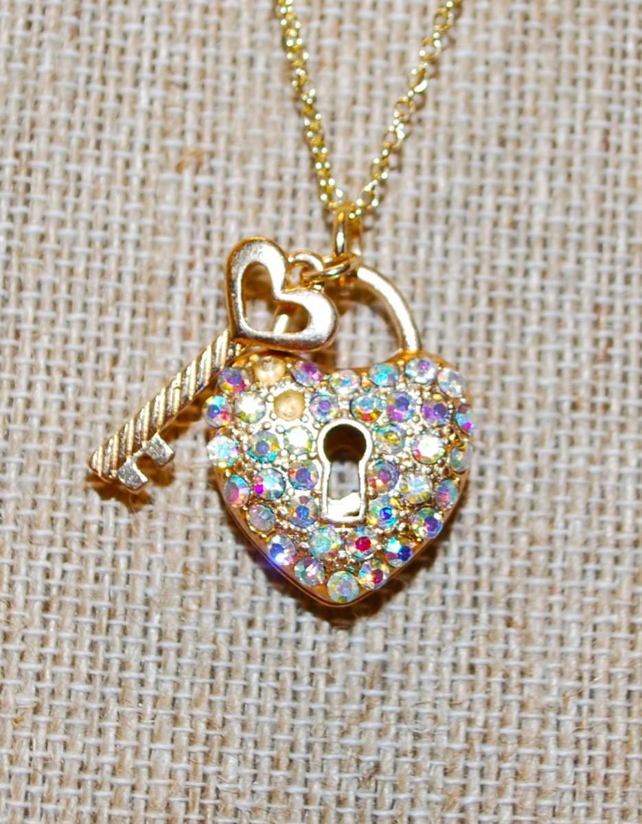 Beautiful Iridescent Stones Heart & Key PENDANT (1" x ¾") on an Adjustable Gold Tone Necklace Chain 17-14" L