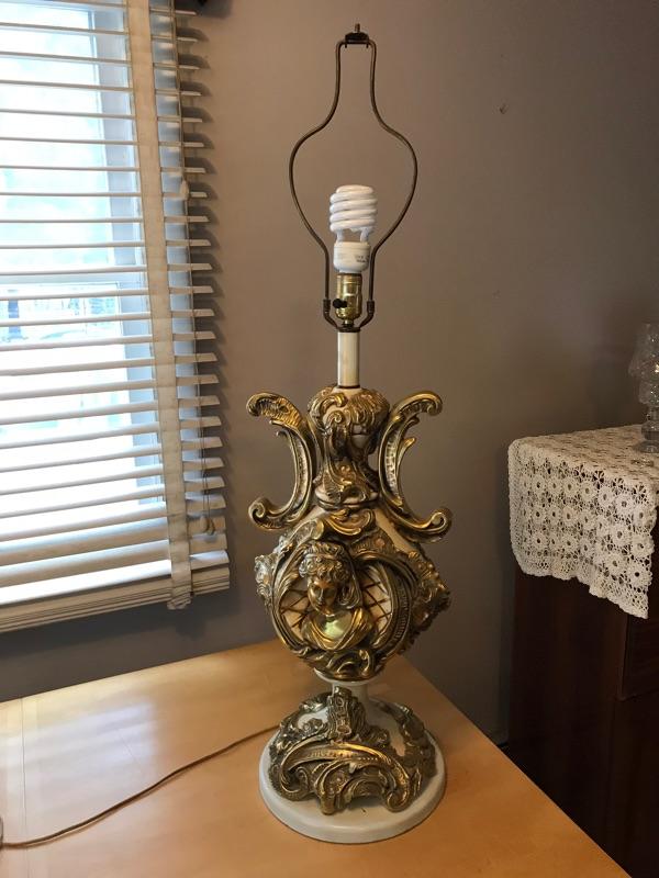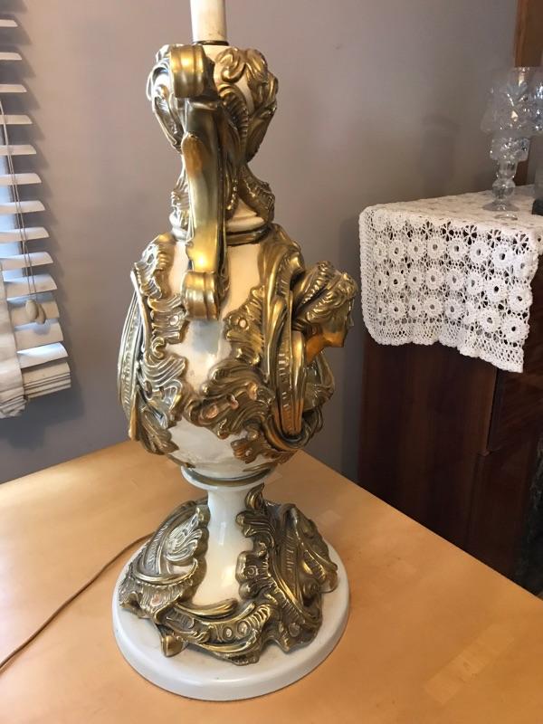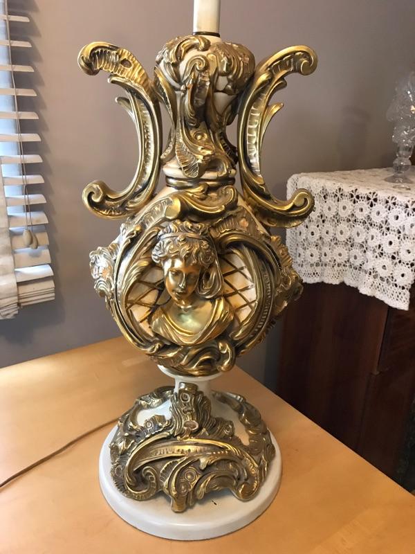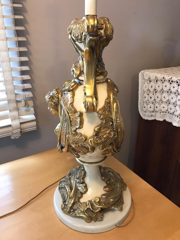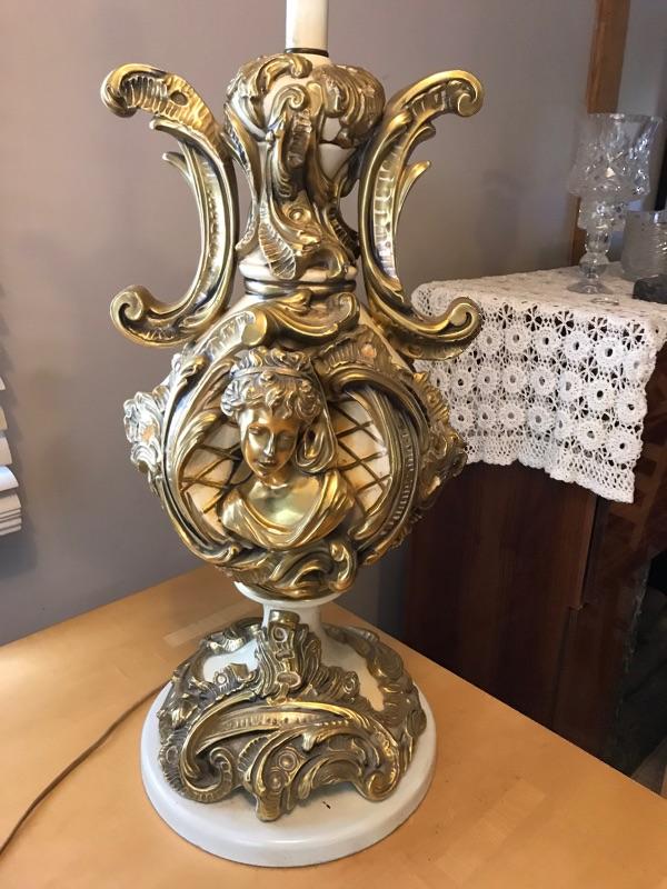 Here is a beautiful Italian table lamp. It has gold gilt carvings. It is in very good condition. It has a carved face and beautiful accents.