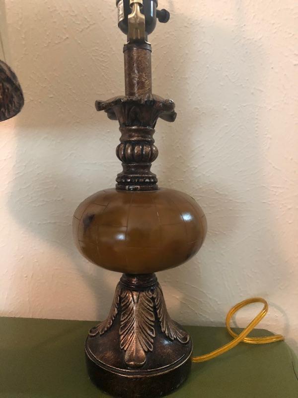 Beautiful ornate lamp with a brown/green round glass feature and gold leaves on the base