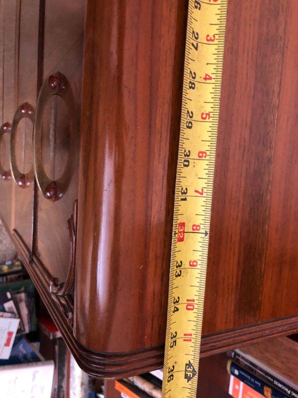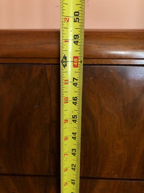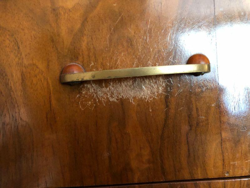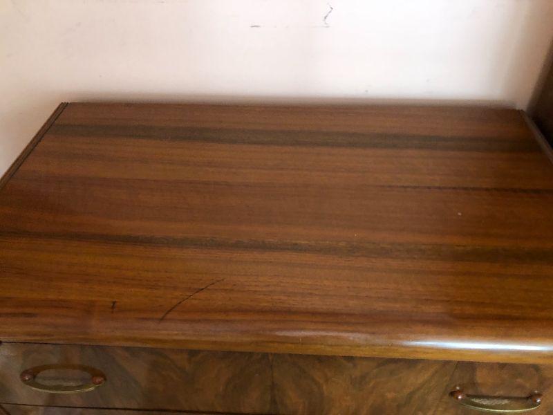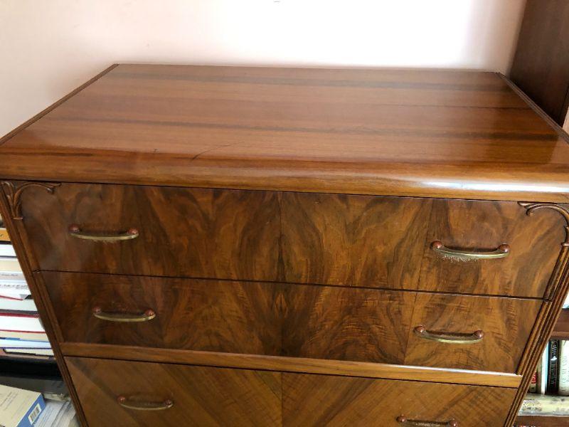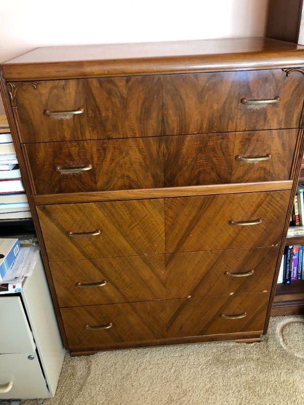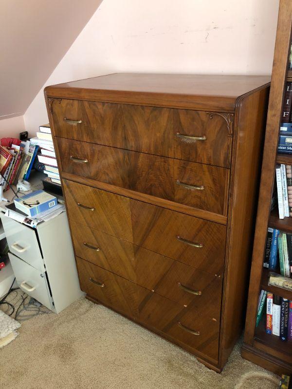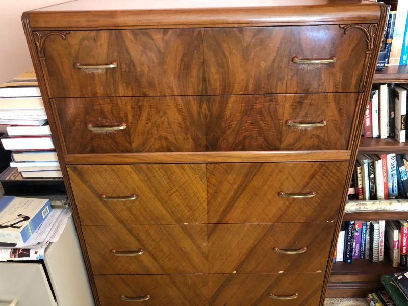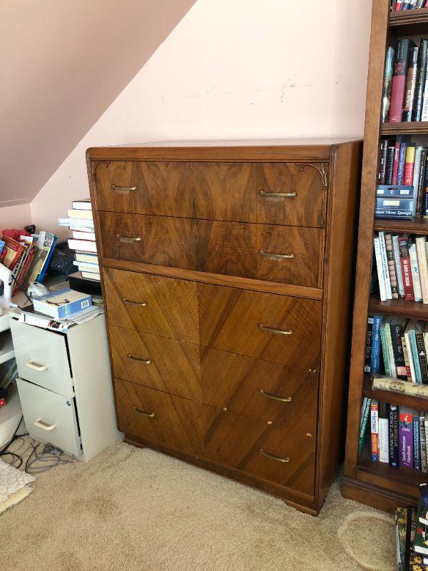 Beautiful large antique wood dresser, in a tan medium brown wood finish. Wood design has a deco flair. In good condition, with scratches in the finish (especially near the handles).