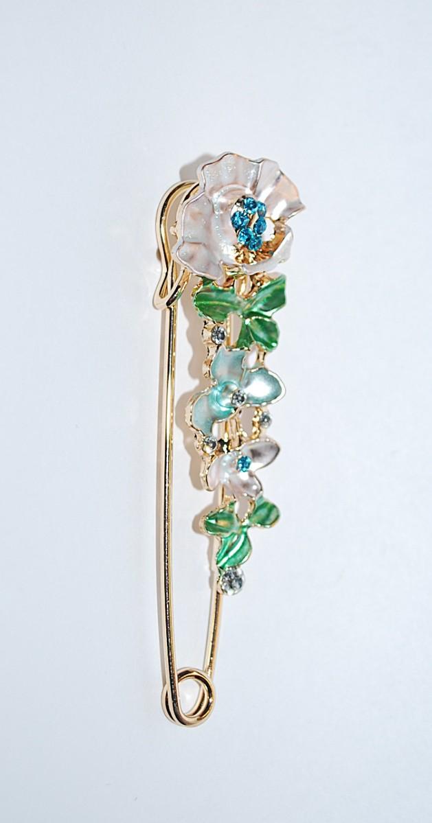 Beautiful Large Bejeweled PIN (3" x ¾") with BLUE Stones on Blossoms & Leaves on a Gold Tone Pin