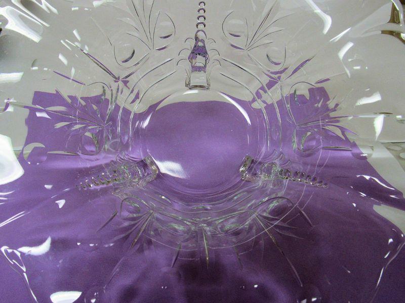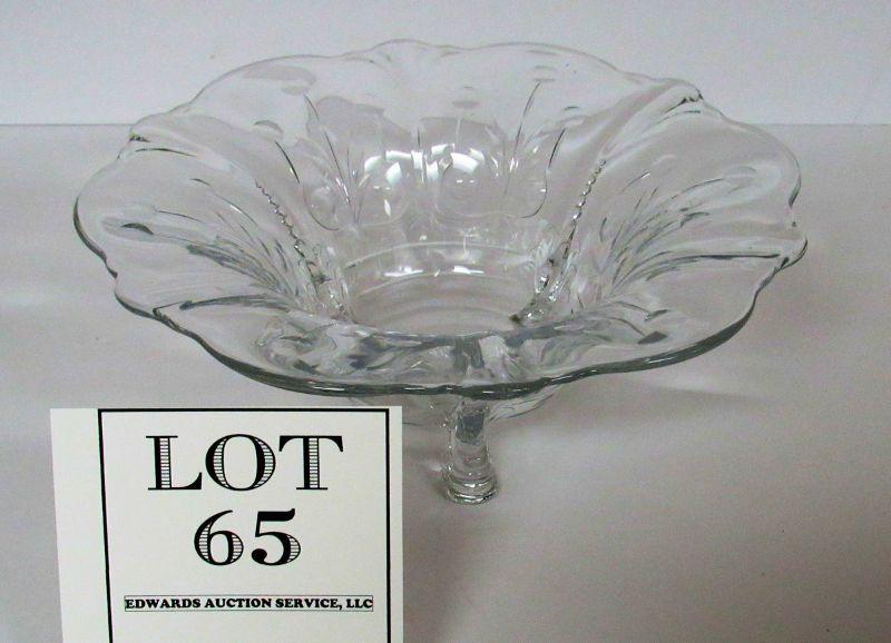 Very nice 10 1/2" 3 footed bowl with unknown cutting. Some minor common mold flaws, no chips or cracks.