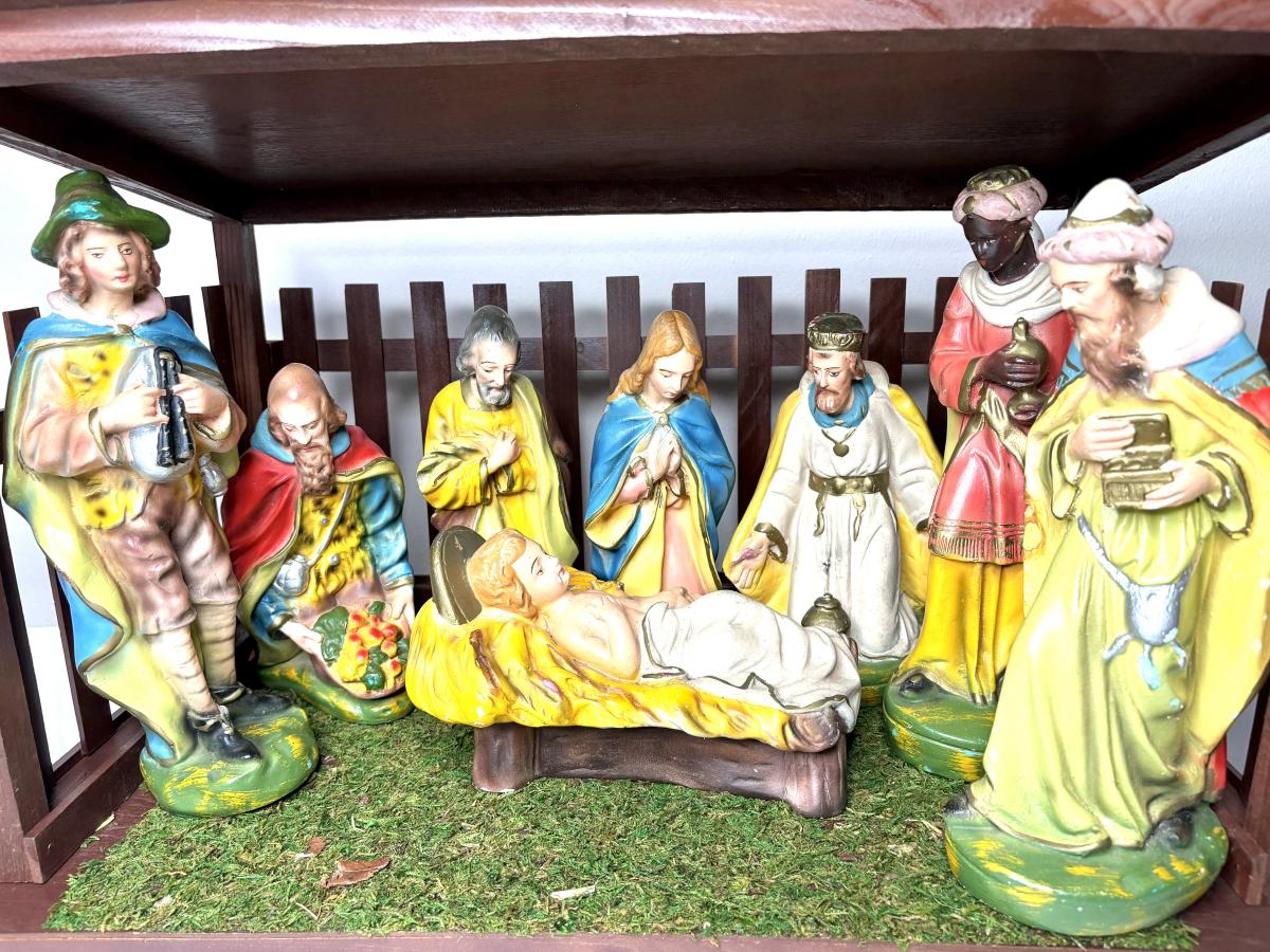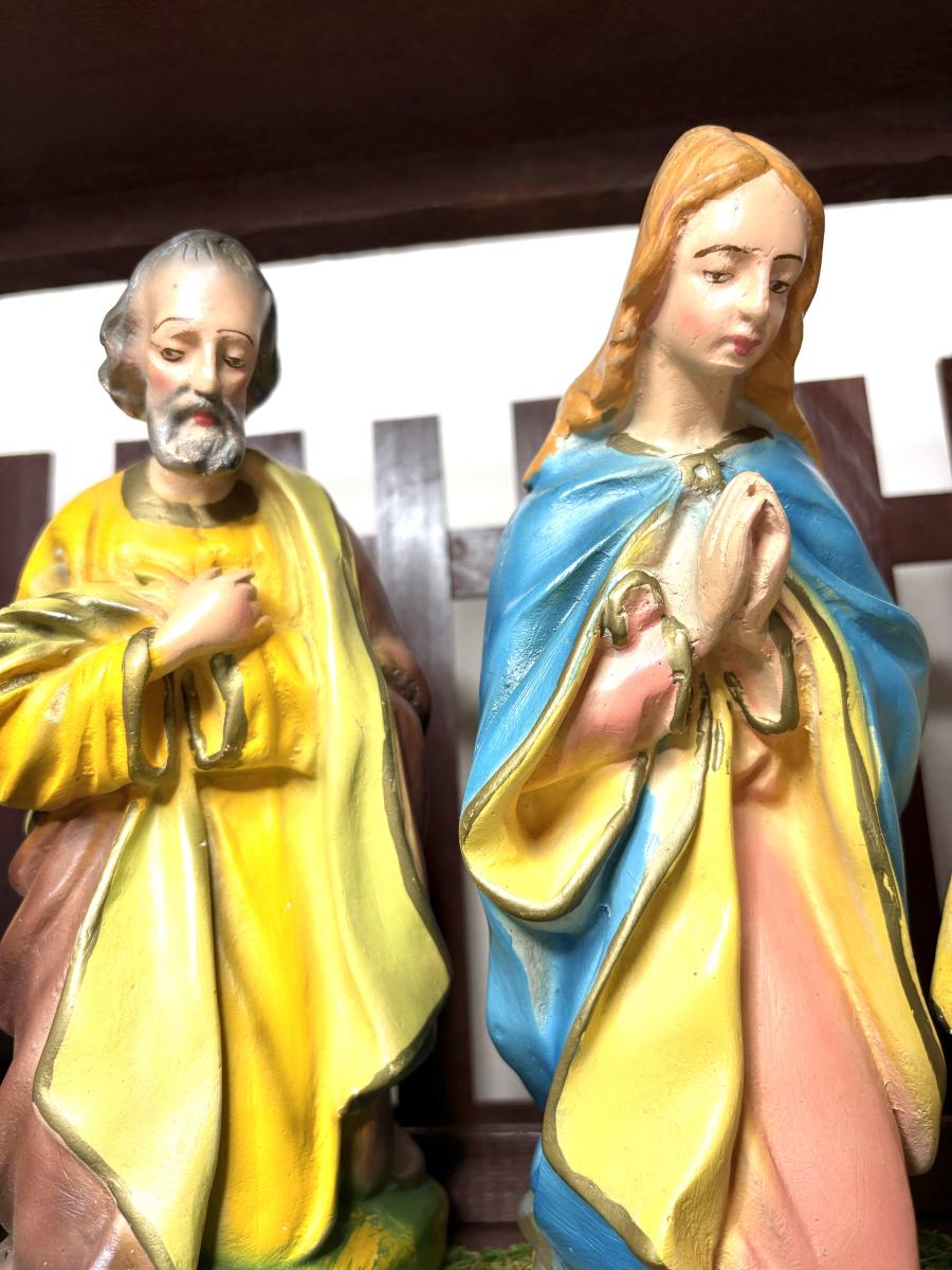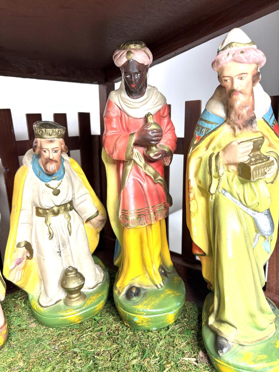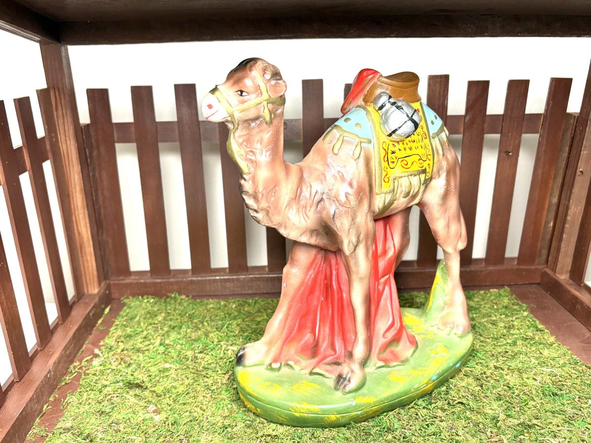 Jesus is 8-1/2” from head to toe x 5-3/4” wide x 5” tall. Joseph and Mary are 9-1/4” tall. The tallest wiseman is 12” tall. The angel is 9-1/2” tall. The tallest sheep is 6” tall. The cow is 8-1/2” tall. The camel is 16-1/2” tall. The donkey is 9-1/2” tall.