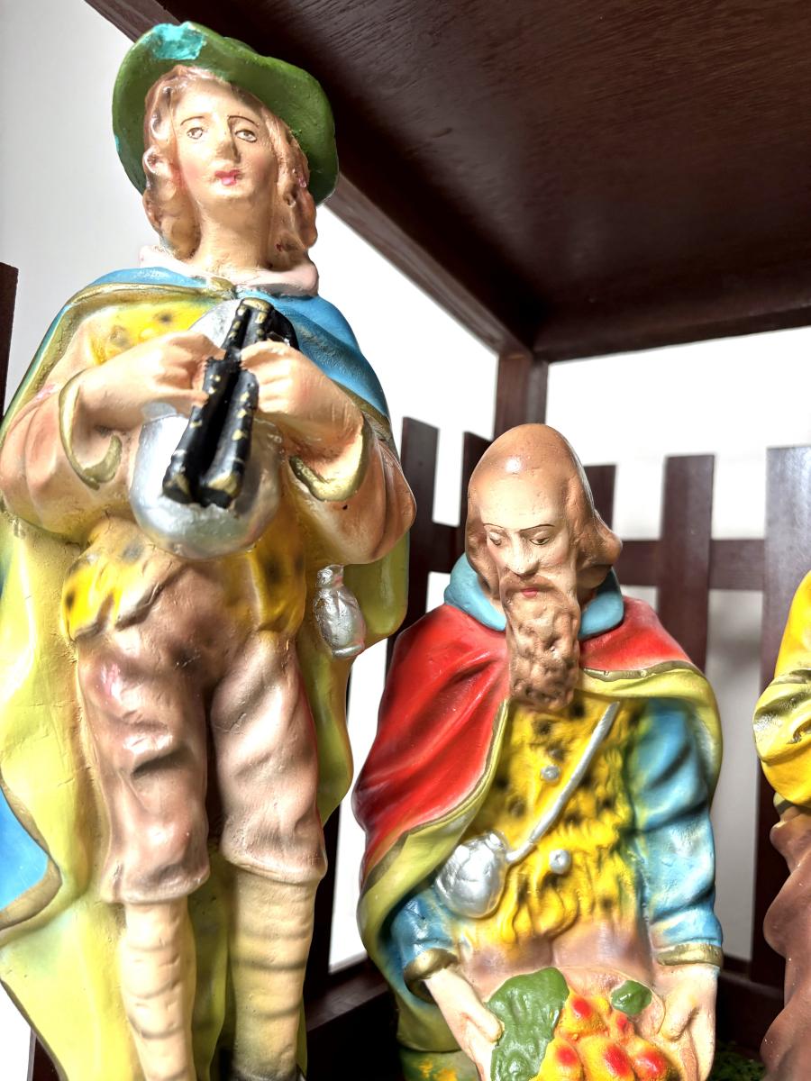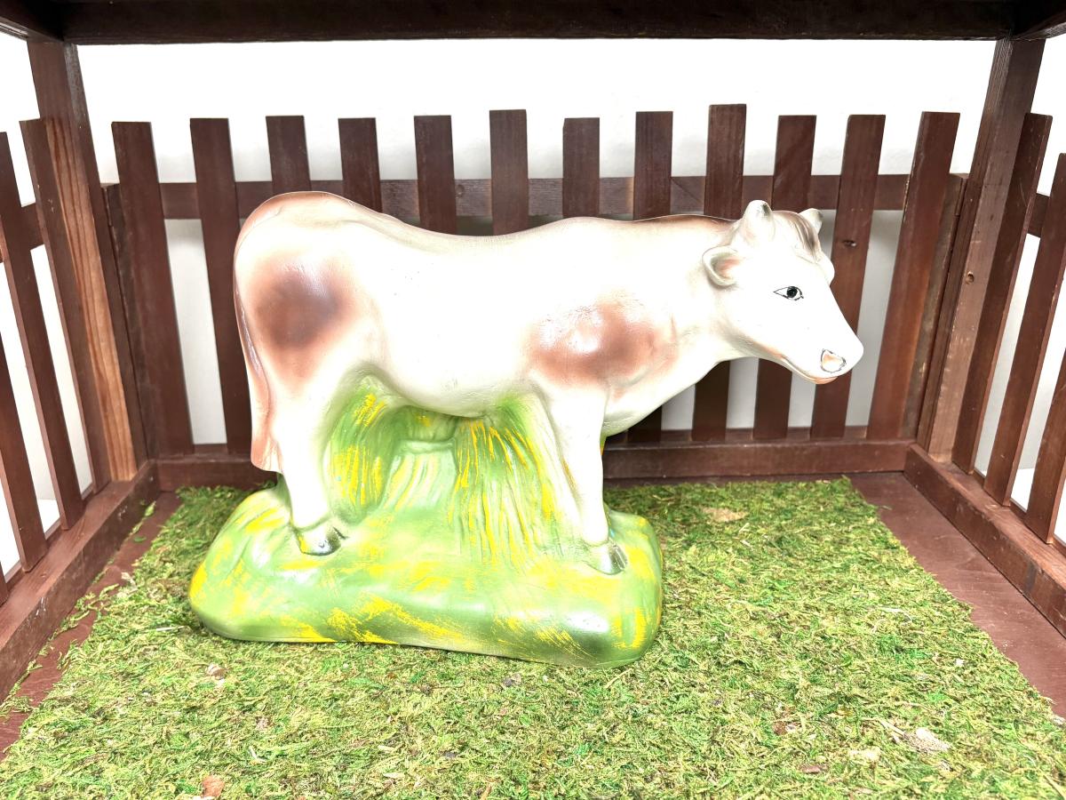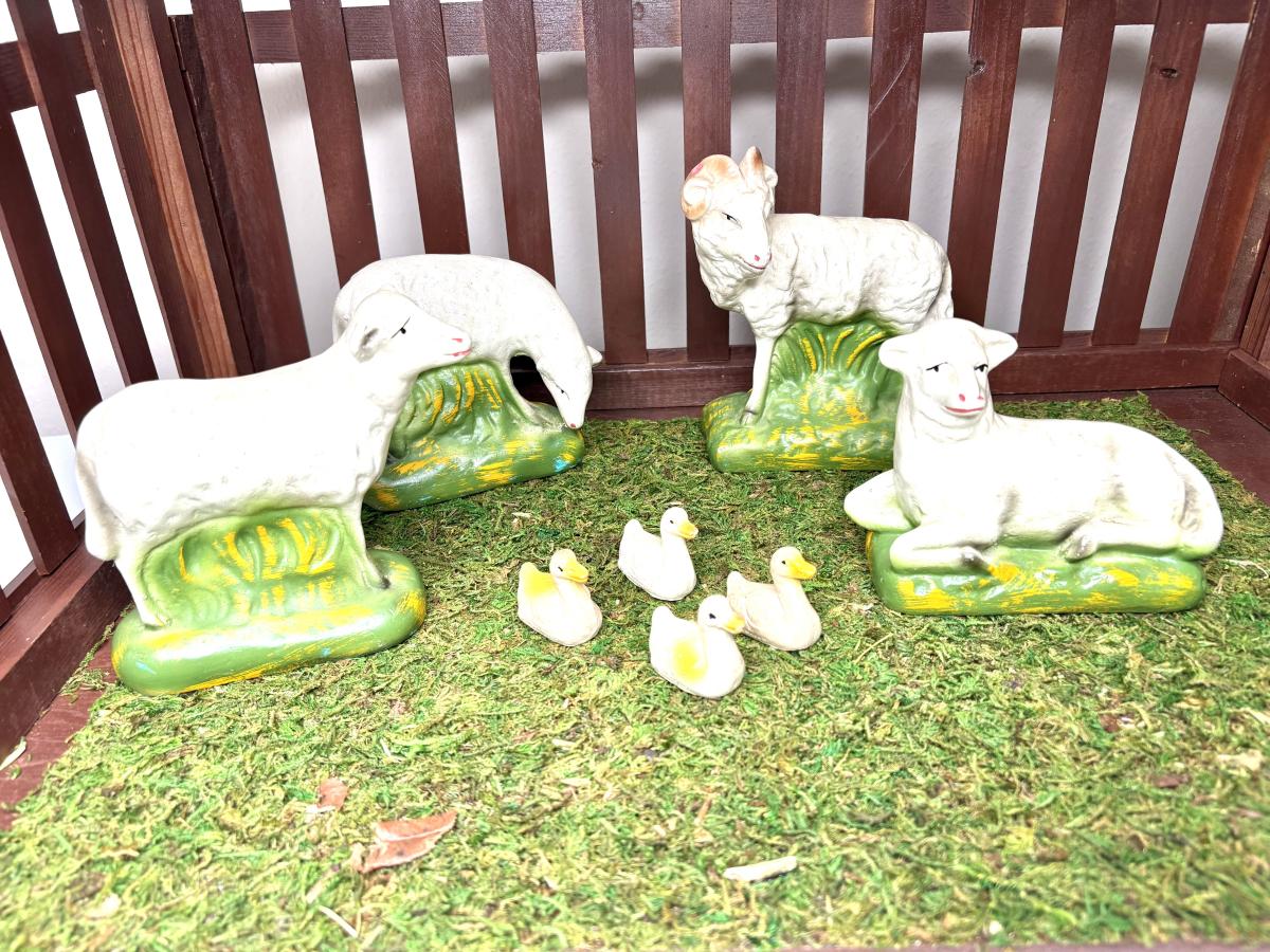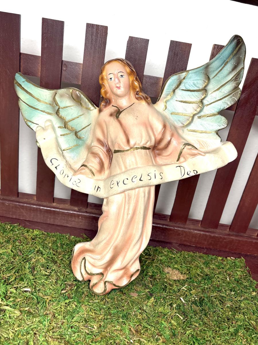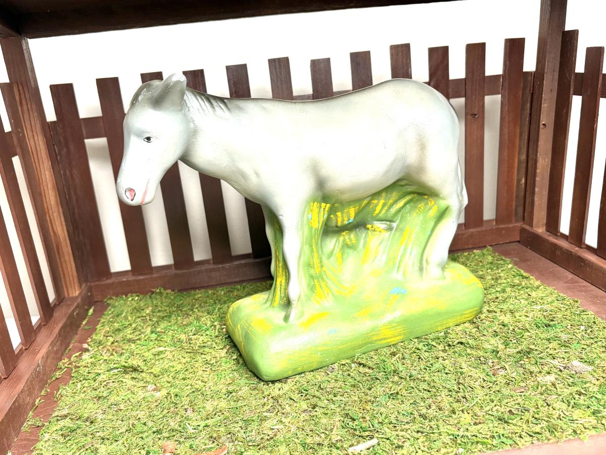 Jesus is 8-1/2” from head to toe x 5-3/4” wide x 5” tall. Joseph and Mary are 9-1/4” tall. The tallest wiseman is 12” tall. The angel is 9-1/2” tall. The tallest sheep is 6” tall. The cow is 8-1/2” tall. The camel is 16-1/2” tall. The donkey is 9-1/2” tall.