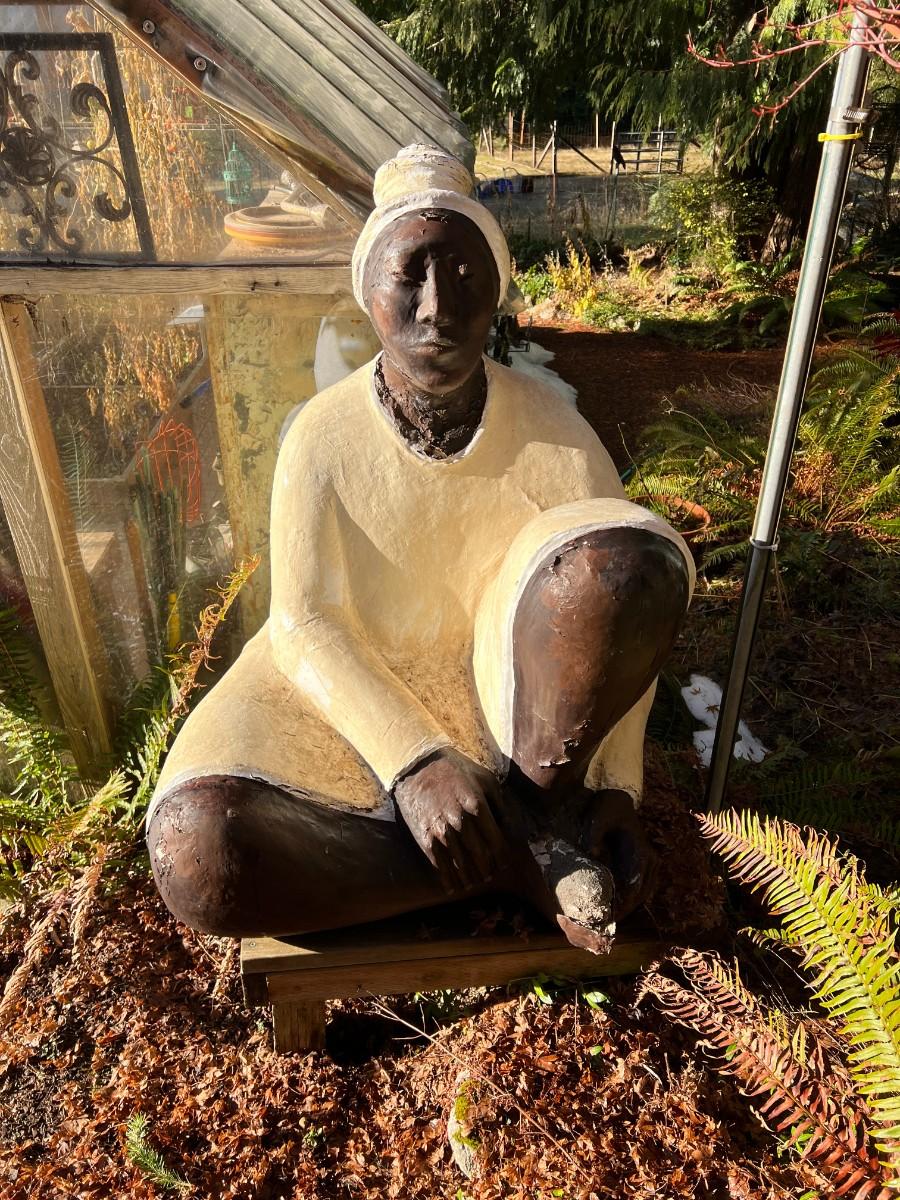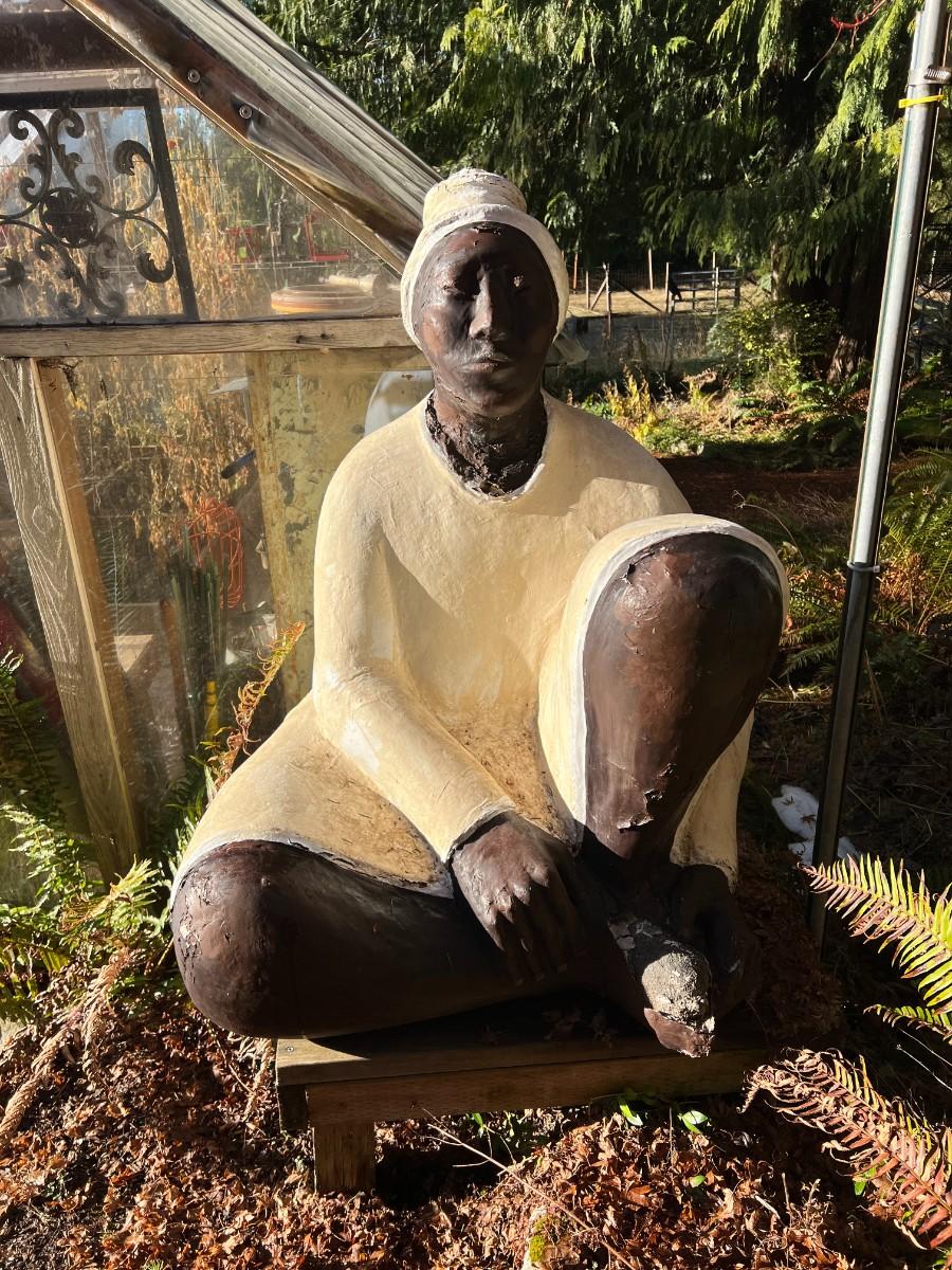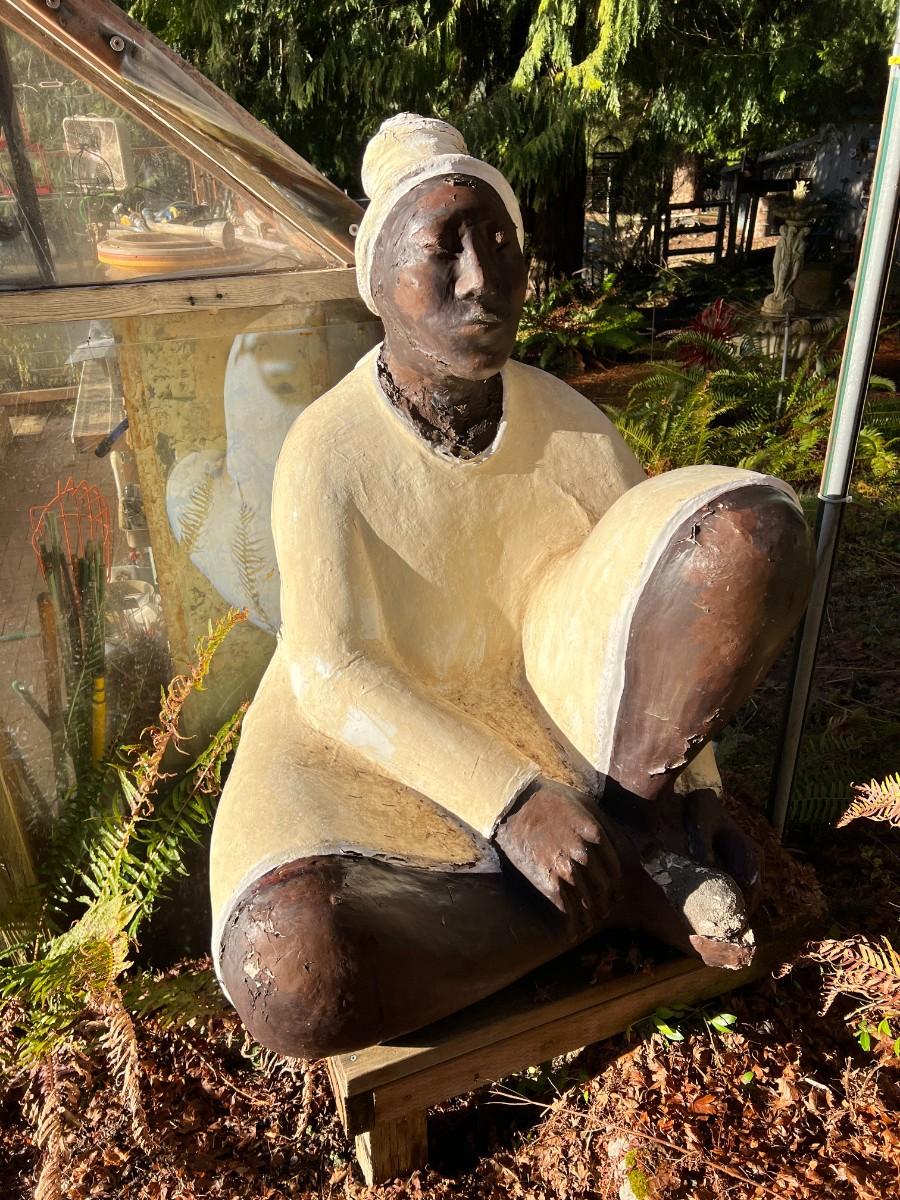 Beautiful Large Statue of Woman in Seated Position, perfect for your Zen garden! She has such a calming expression and posture. Condition is fair, with clear signs of weathering in places (perhaps best to move this statue with it's wooden base, which is included). Condition shown in photos.